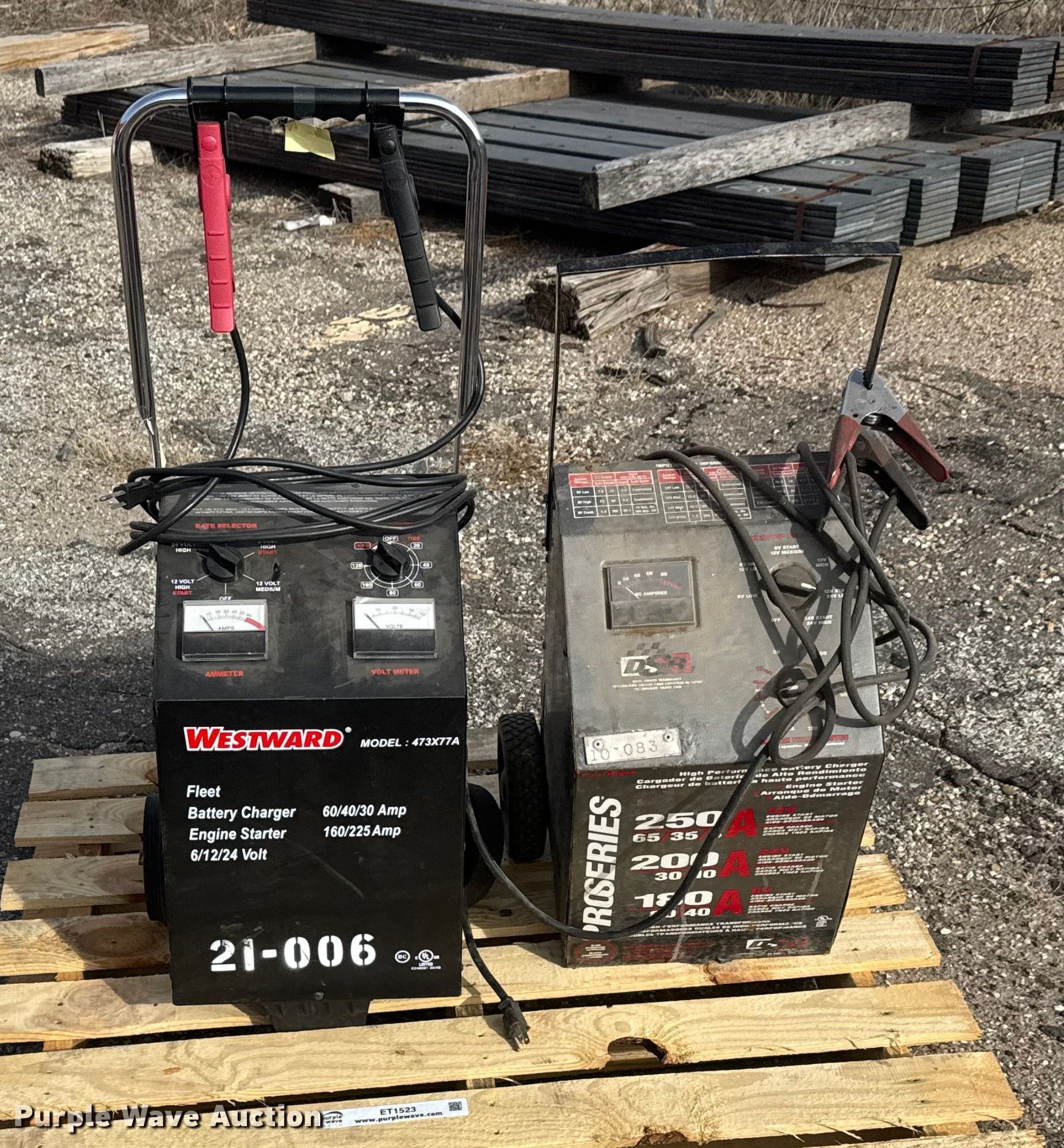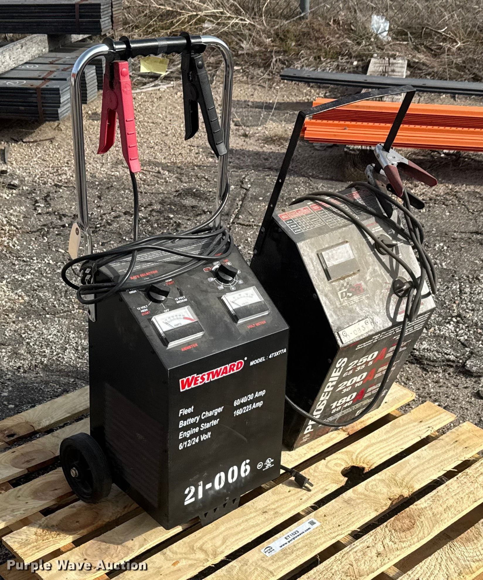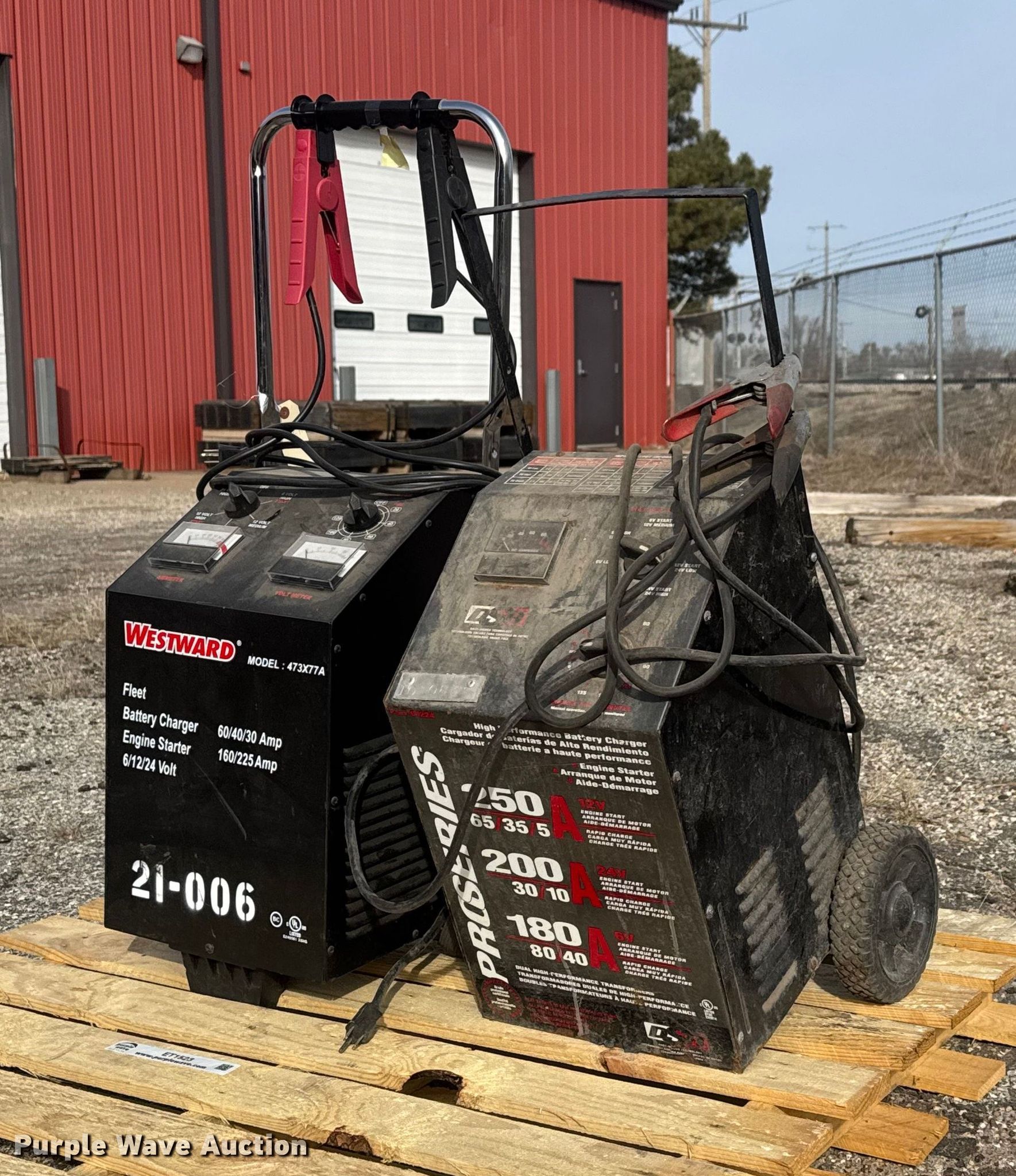 Purple Wave is selling a used Tools in Kansas. This item is a (2) battery chargers with the following: KDOT ID: 50675, Westward 6/12/24 Volt charger, Proseries 6/12/24 Volt charger