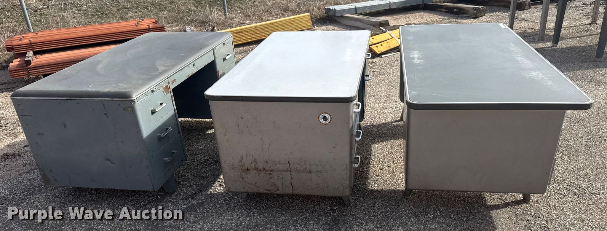 Purple Wave is selling a used Furniture in Kansas. This item is a (3) steel desks with the following: KDOT ID: 50680