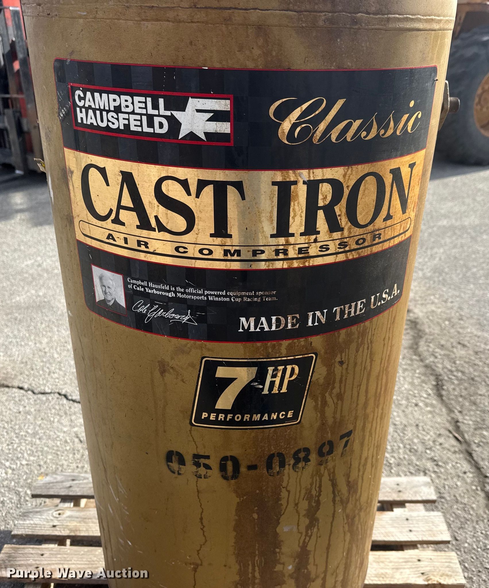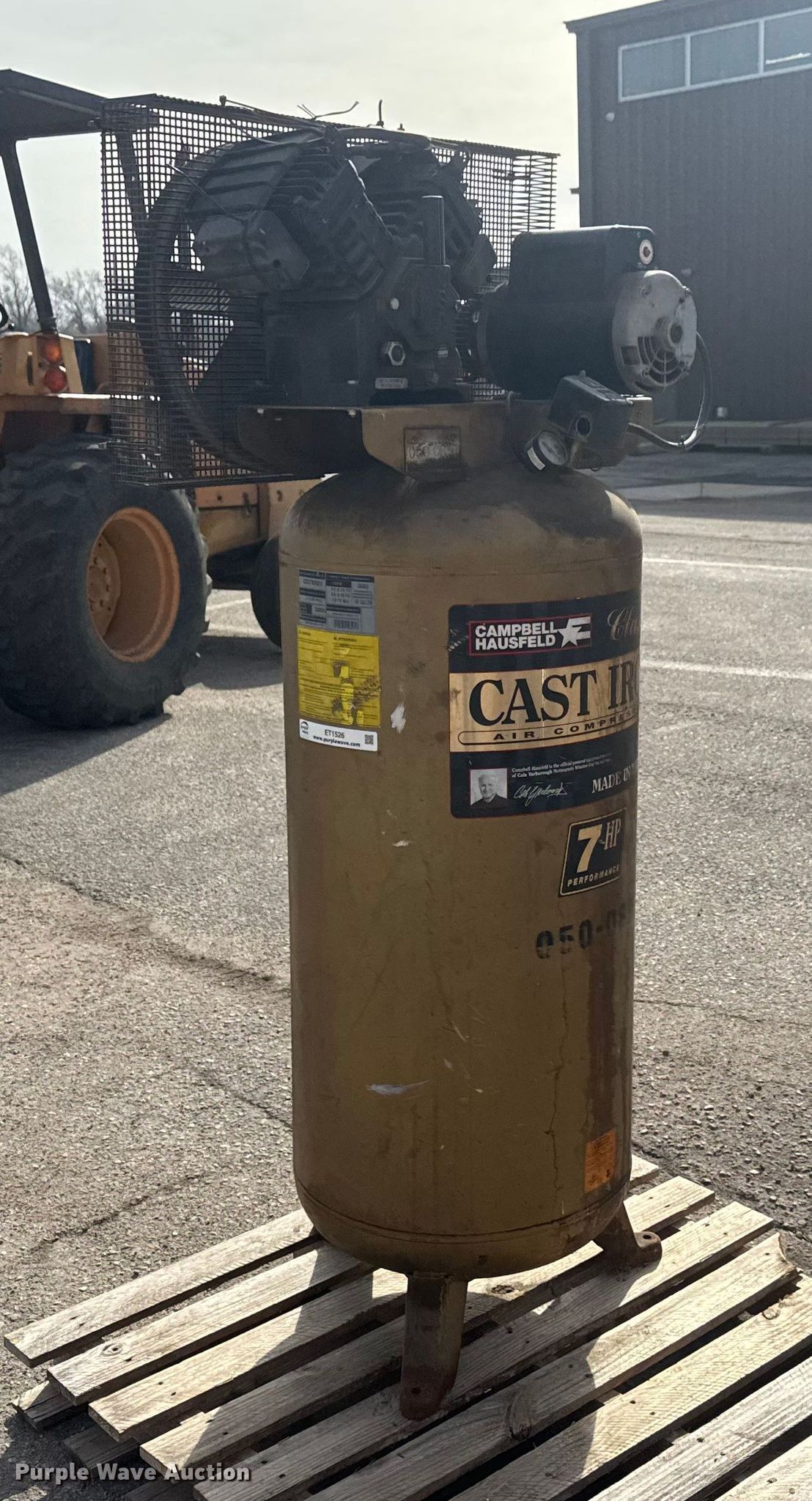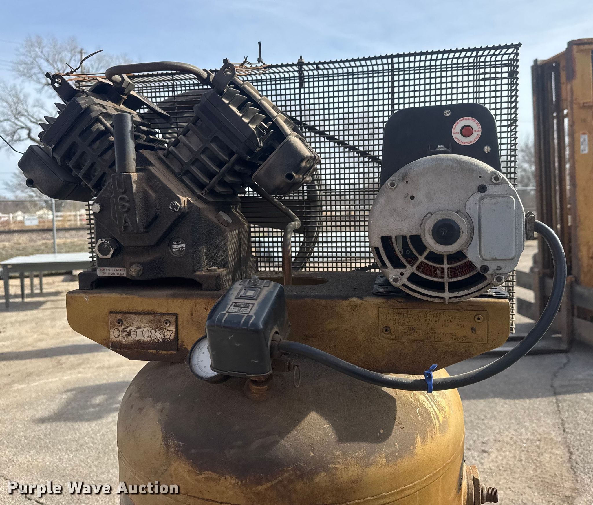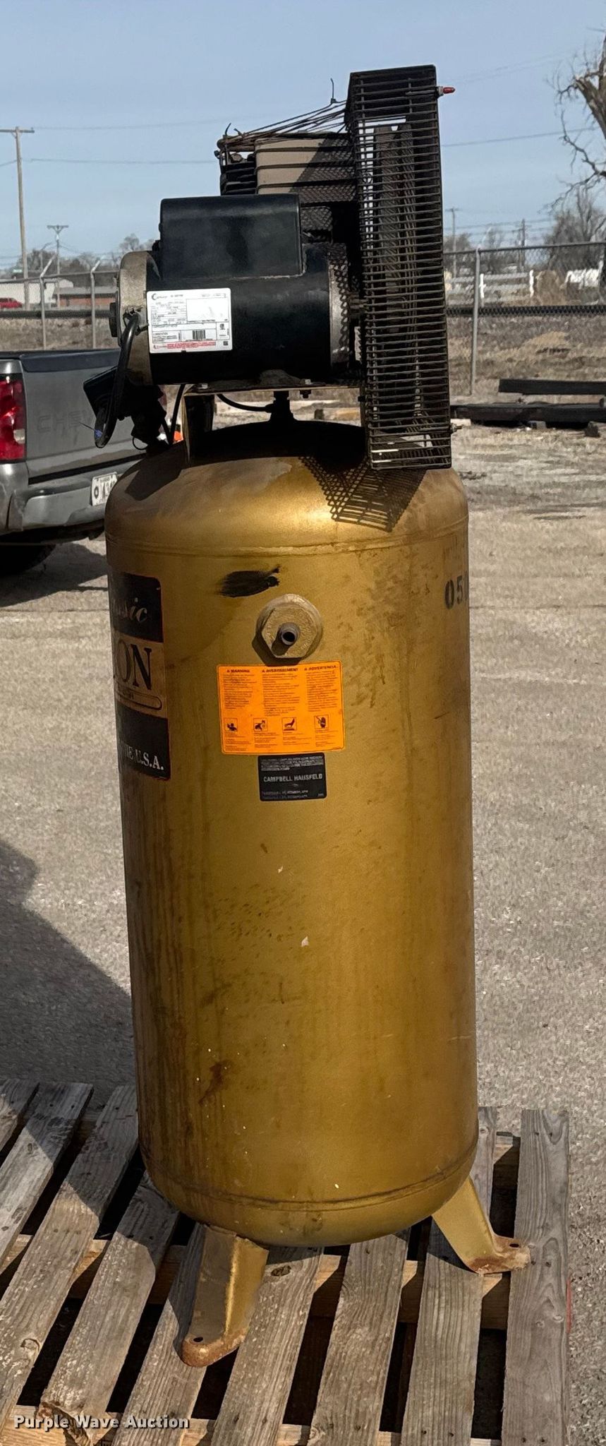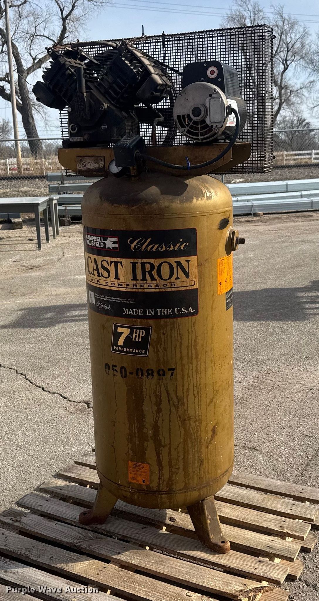 Purple Wave is selling a used Air Compressor in Kansas. This item is a 1997 Campbell Hausfeld CIQ71062C air compressor with the following: Serial: L11129620503, KDOT ID: 050-0897