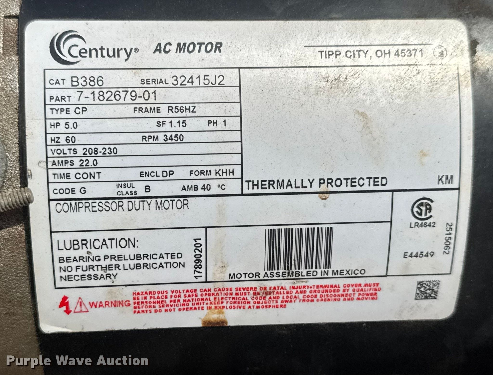 1997 Campbell Hausfeld CIQ71062C air compressor. Serial: L11129620503, KDOT ID: 050-0897. Electric Motor Century Serial: 32415J2, HP: 5, Phase: Single. Features Air compressor Tank capacity: 60 gallons. Notes Unknown operating condition. Kansas Department of Transportation-Shop. Hutchinson, KS 67504