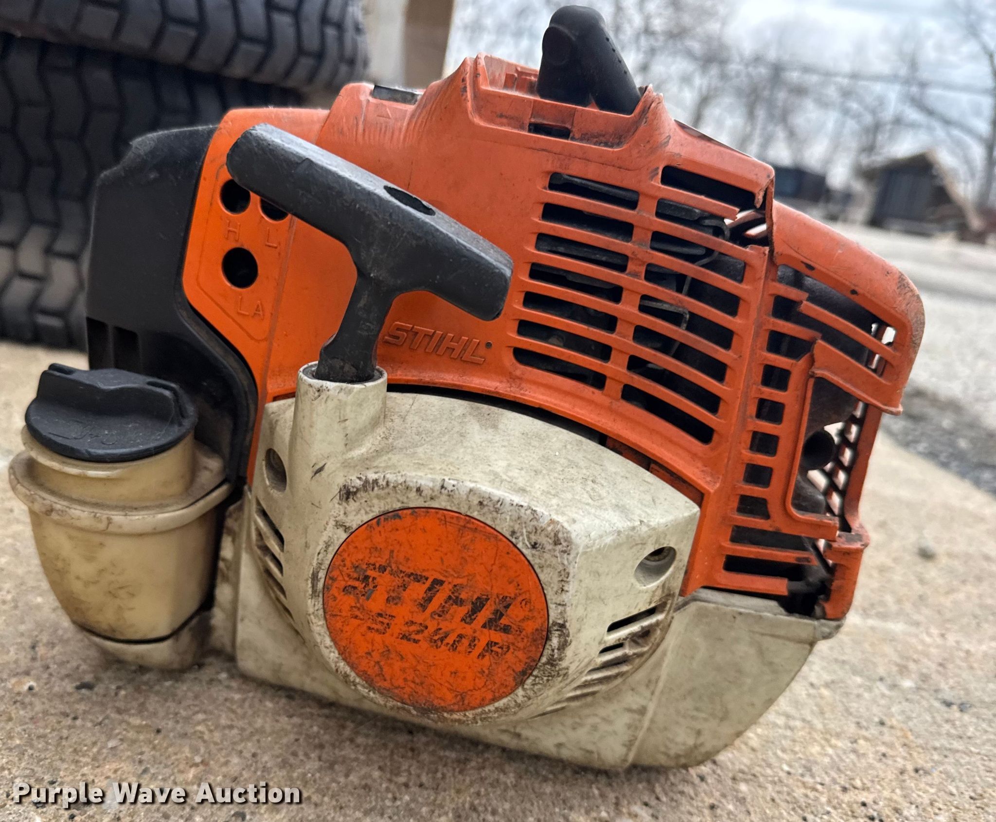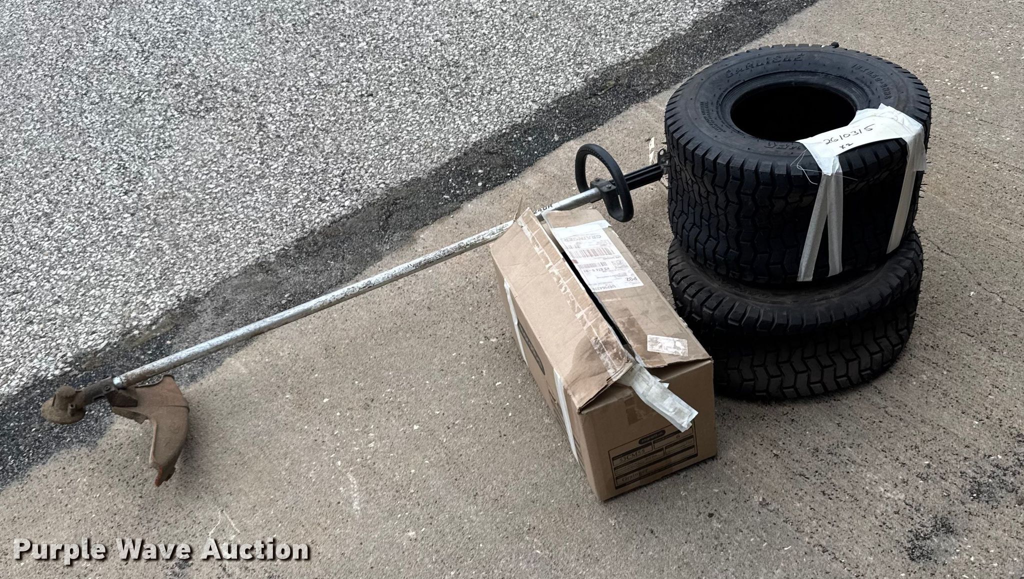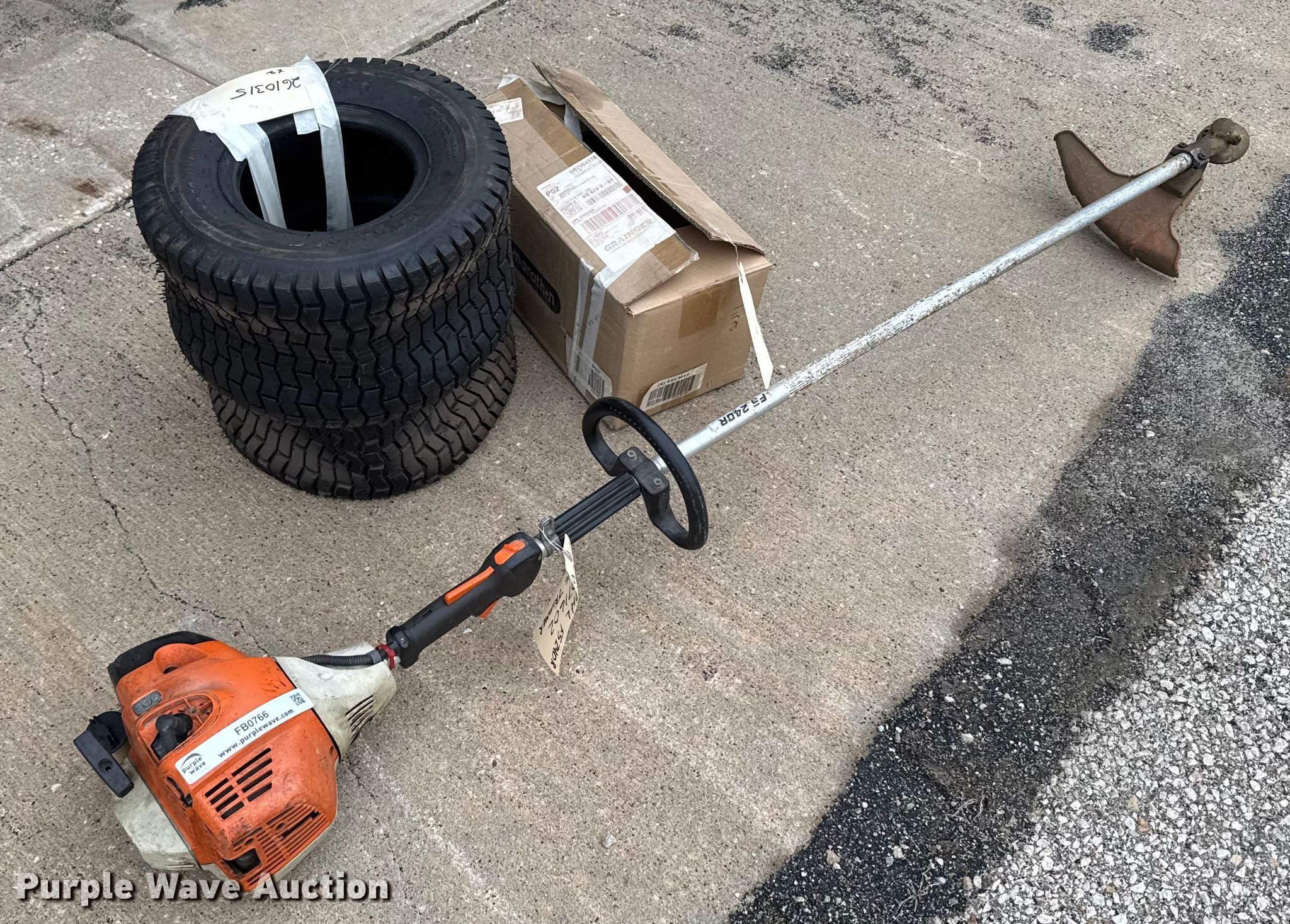 Purple Wave is selling a used Lawn and Garden in Kansas. This item is a Lawn and garden equipment with the following: KDOT ID: 2610315, 26071602, 2610316, (2) 18x9.50-8 mower tires, Unused, (4) 2.80x2.50-4 mower tires and wheels, Stihl FS240R sting trimmer, Parts missing, Non-operational