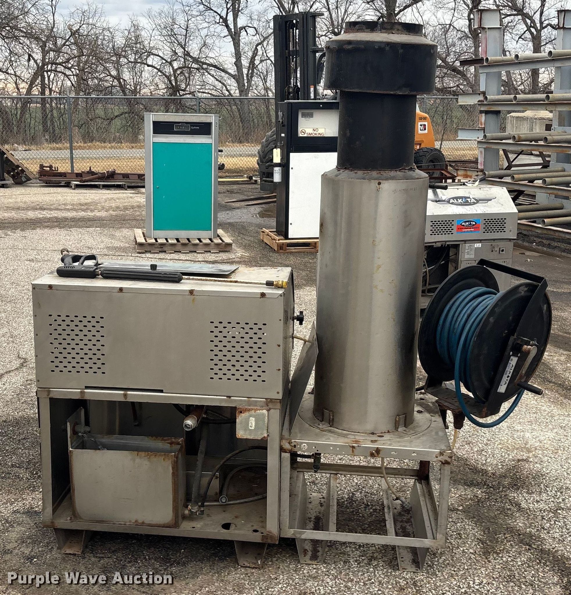 2012 Alkota 4201 NGUL pressure washer. Serial: 269874, KDOT ID: 875-2033. Features PSI: 2,000, GPM: 3.5, Wand, Hose reel. Notes Stack damage. Kansas Department of Transportation. Salina, KS 67401