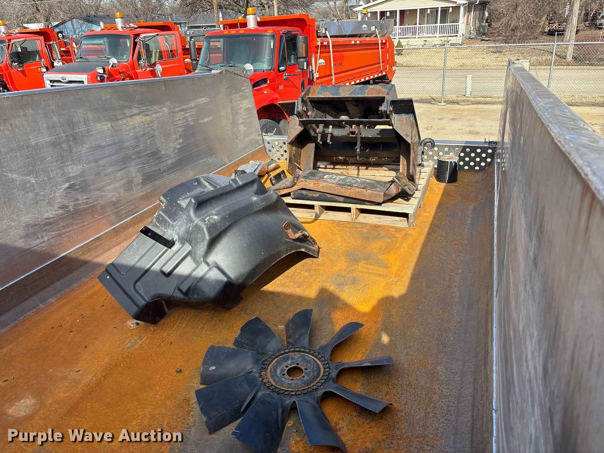 2015 Freightliner 108SD dump truck. Miles: 144,618 on odometer, Hours: 2,043 on meter, VIN: 3ALHG5CY5FDGL6319, KDOT ID: 268-2034. Engine Cummins ISL, Displacement: 8.9L OHV, Cylinders: 6, Fuel type: Diesel. Transmission Automatic. Chassis Axles: Tandem, Differential lock: Inter-axle, Suspension: Spring over walking beam, Brakes: Air, Front mount PTO, GVWR: 58,000 lbs FAWR: 18,000 lbs, RAWR: 20,000 lbs. Interior AC, Heat, Heated mirrors, Cruise control, Brake controller. Features Bed Dump bed, Monroe, Length: 15', Width: 88", Side height: 36", Bed type: Steel, Roll tarp, Ram: Single, End gate: Air operated. Tires Size: 315/80R22.5. Notes Plow mount in bed, Dash warning indicator: Check engine, Brake, Collision damage , Frame damaged, bent , Front suspension issues, cross member broken , Transmission mount broken , Exhaust damaged, in bed , Unit must be towed or hauled , Non-operational unit. Titles will be distributed after confirmation of payment and removal. Kansas title. Title distribution may be delayed up to 30 days from verification of funds. Kansas Department of Transportation. Salina, KS 67401