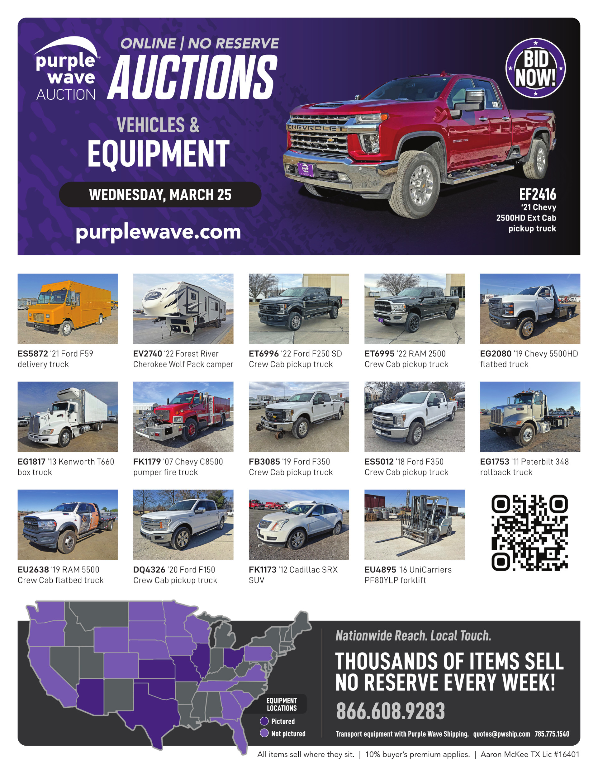 This auction is conducted by Purple Wave, Inc., whose home office is 825 Levee Drive, Manhattan, Kansas. Aaron McKee, Texas auctioneer license # 16401, operates Purple Wave, Inc. Complaints against us may be directed to the Texas Department of Licensing and Regulation, P.O. Box 12157, Austin, Texas 78711, (512) 463-6599. For additional required information, see the attached document.