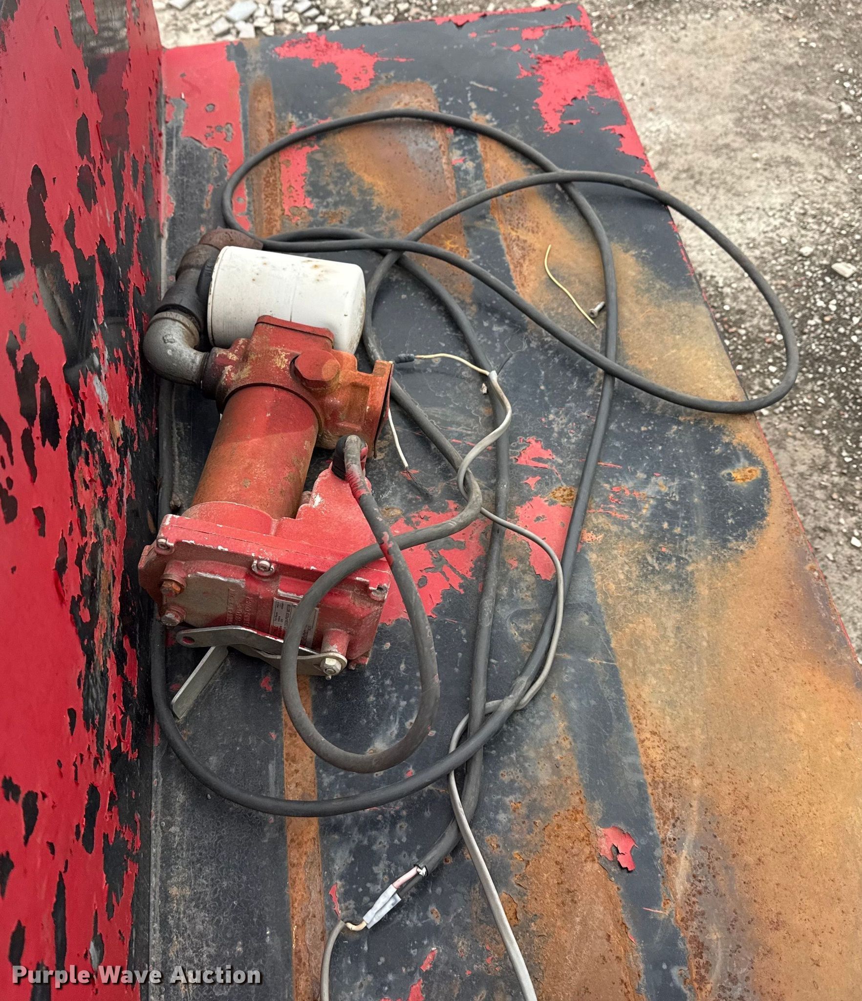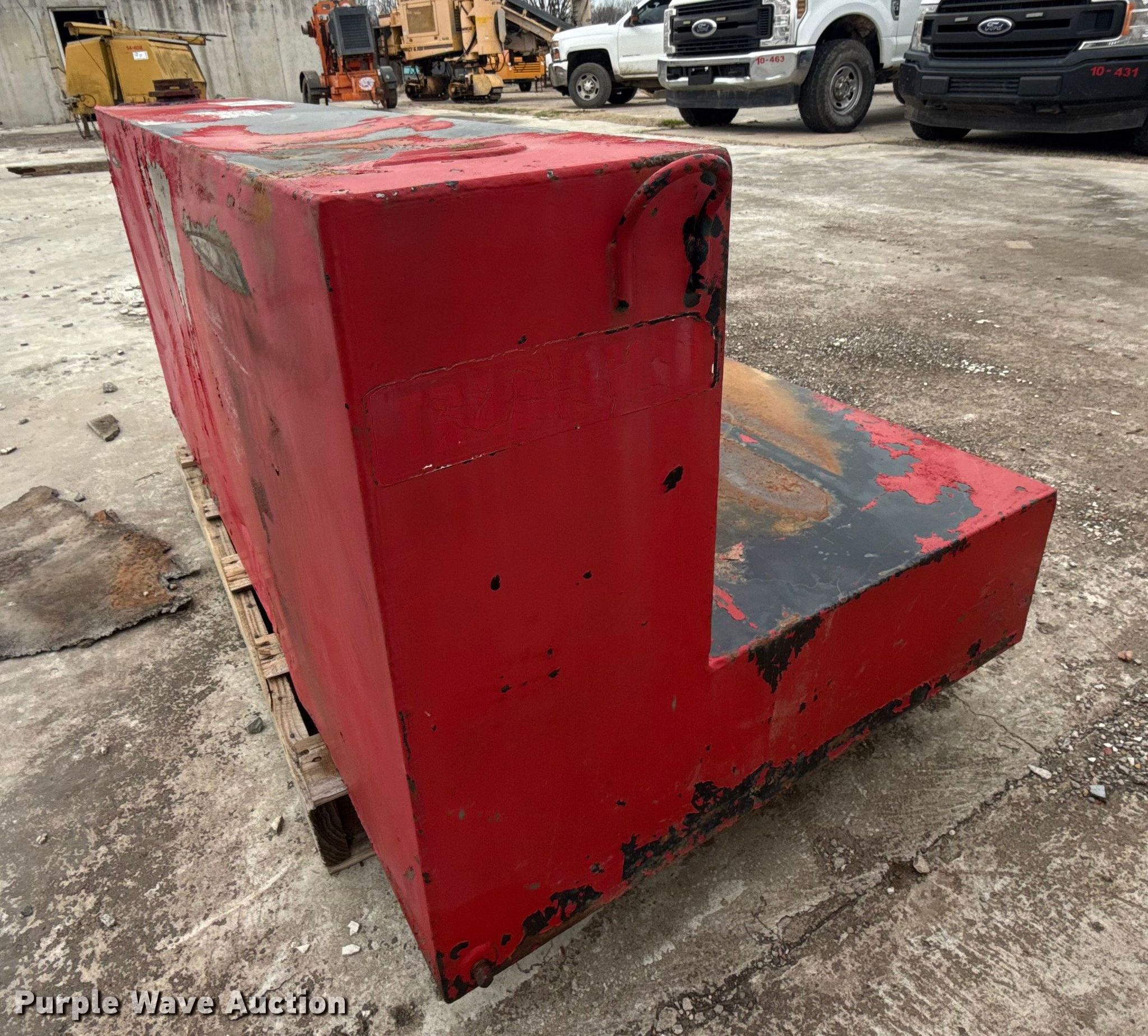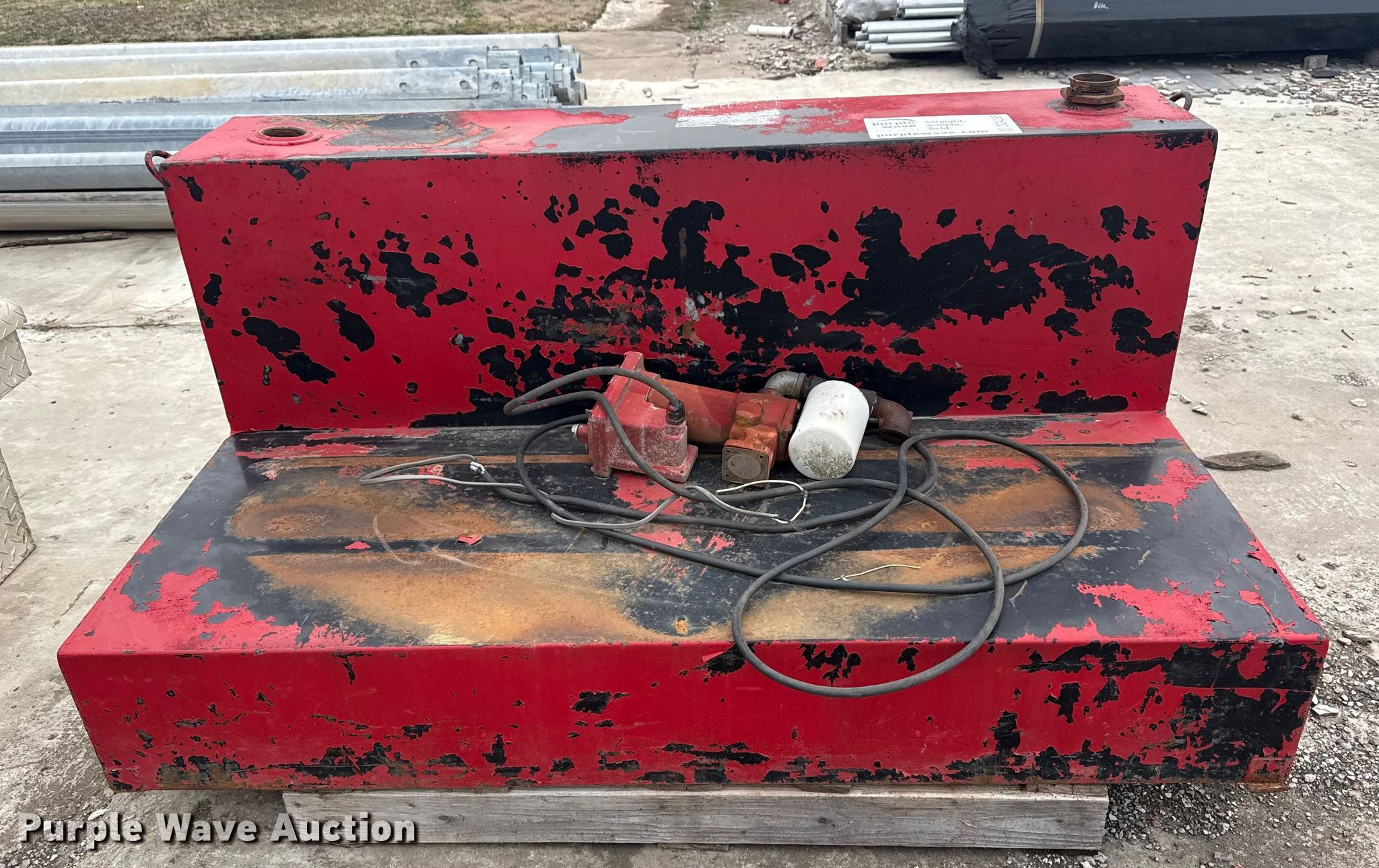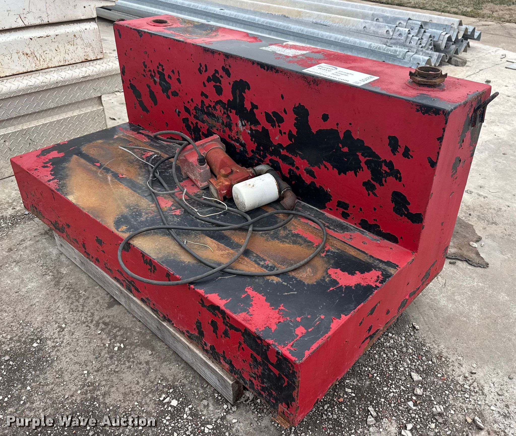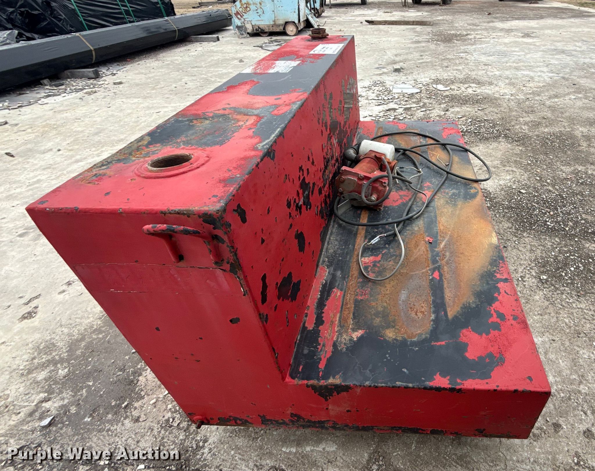 Purple Wave is selling a used Fuel and Lube in Oklahoma. This item is a Fuel tank with the following: Length: 56", Width: 31", Height: 25", Fill Rite pump, GPM: 20, Volts: 12