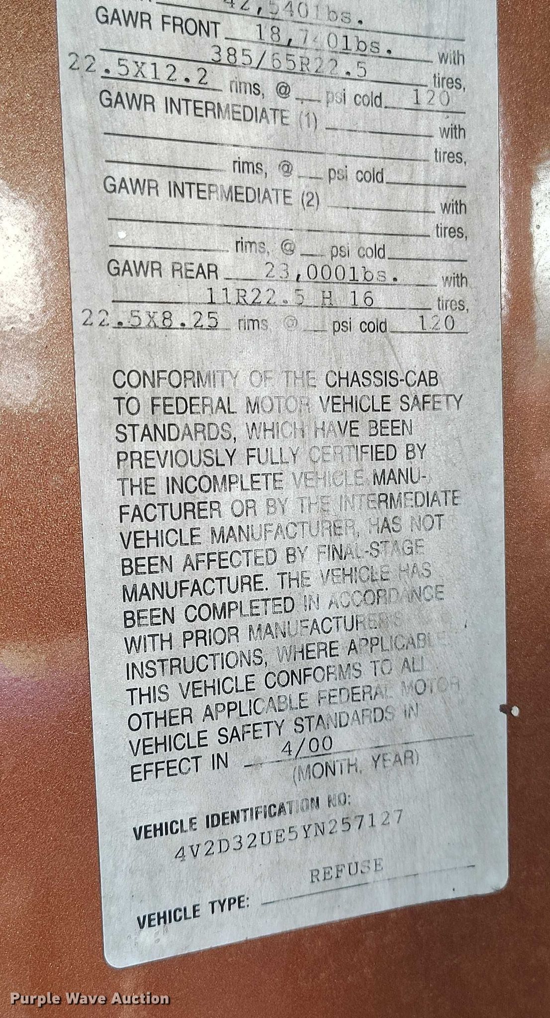 Purple Wave is selling a used Refuse Truck in Wyoming. This item is a 2000 Volvo WX refuse truck with the following: Miles: 122,190 on odometer, Hours: 5,670 on meter, VIN: 4V2D32UE5YN257127