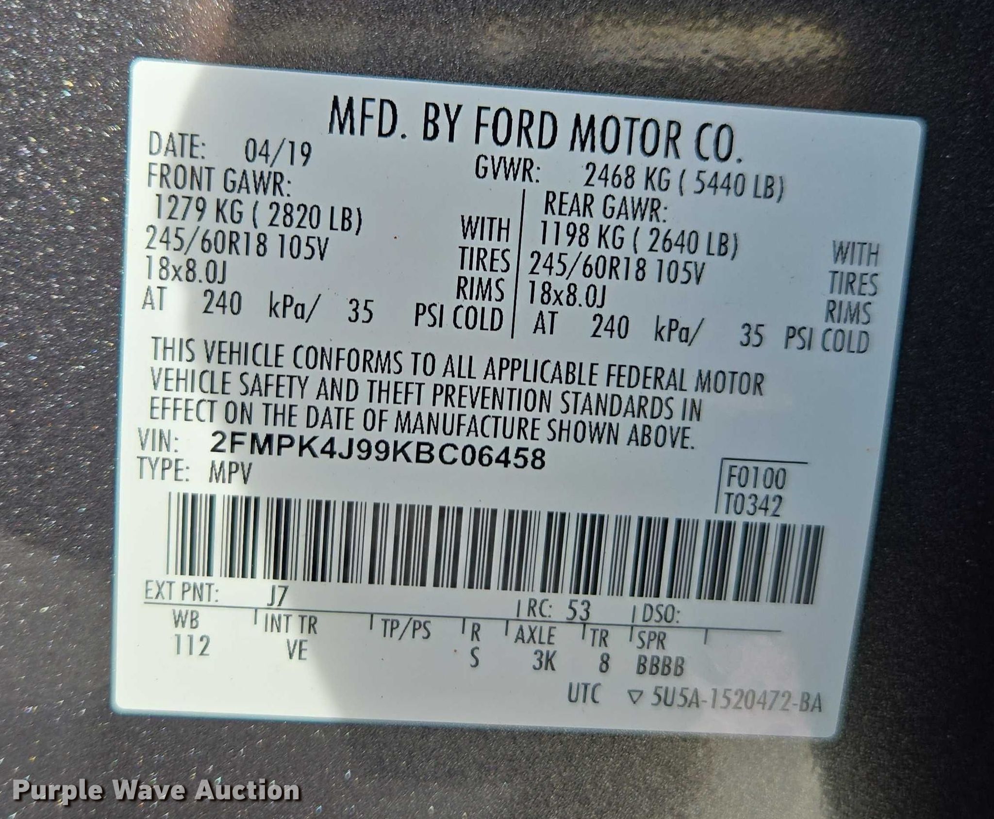 - VIN: 2FMPK4J99KBC06458