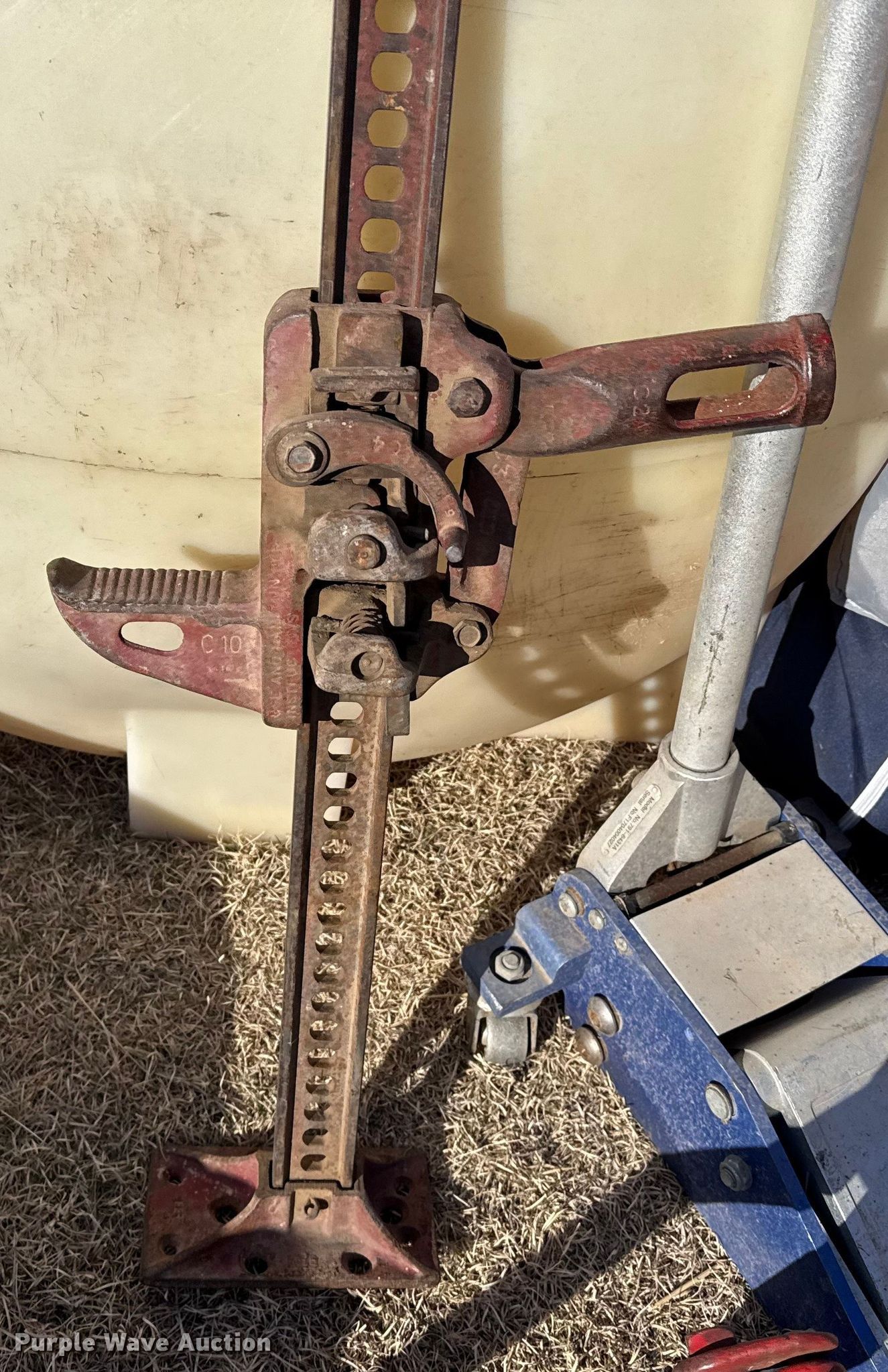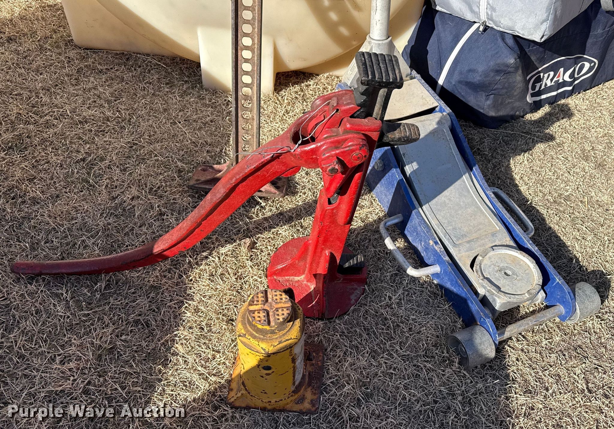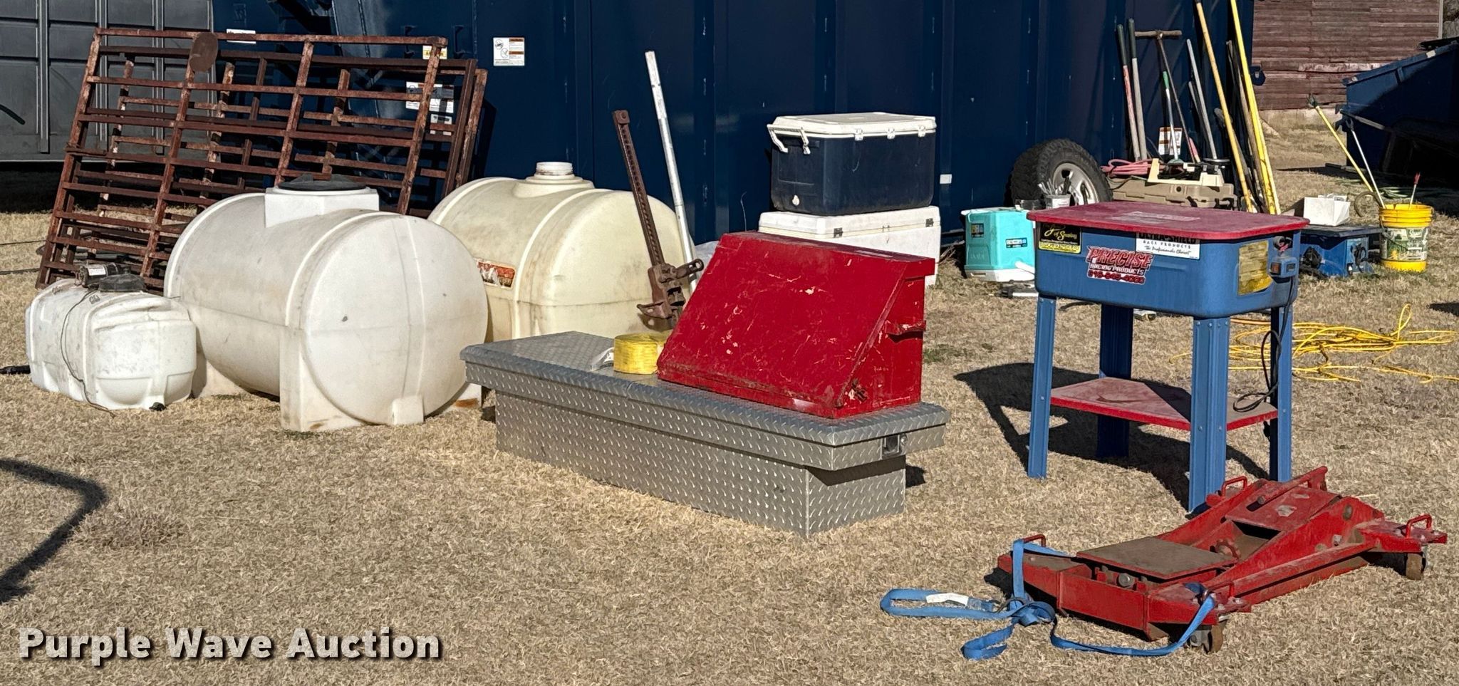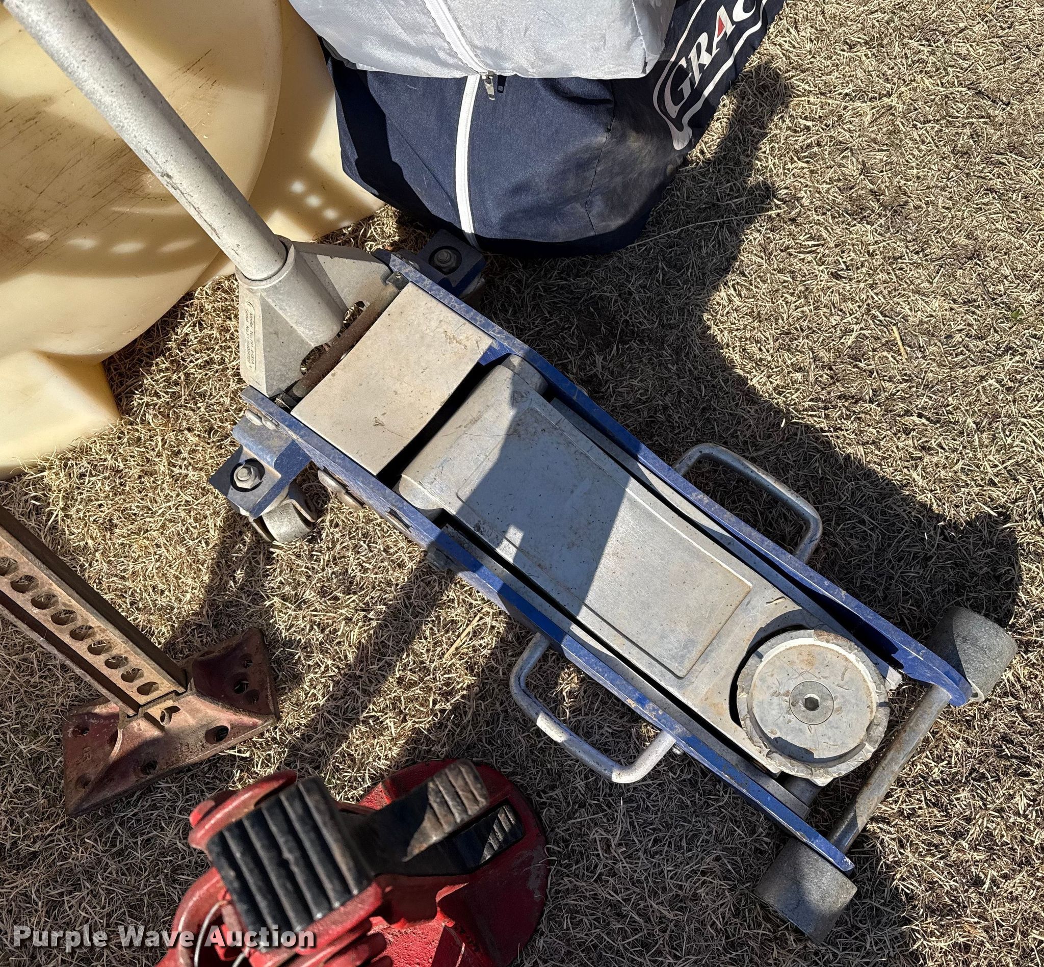Purple Wave is selling a used Tools in Kansas. This item is a Tools with the following: Transmission jack, Bottle jack, Floor jack, Toolboxes, Tanks, Sprayer, Jack stand, Receiver hitches, Table saw, Lube pumps