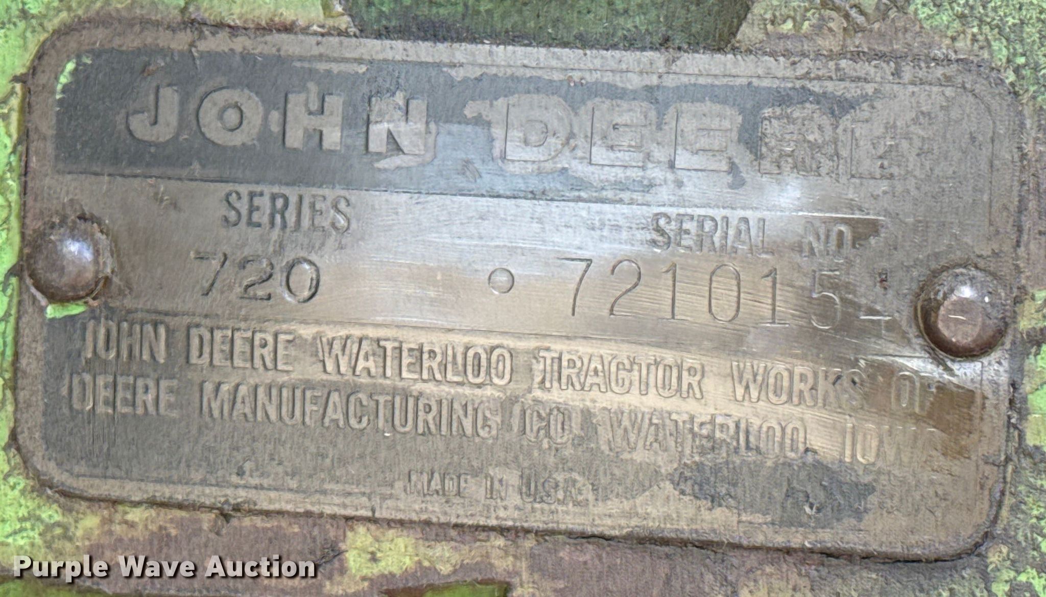 Purple Wave is selling a used Tractor in Kansas. This item is a 1957 John Deere 720 tractor with the following: Hours: 4,549 on meter, Serial: 7210154