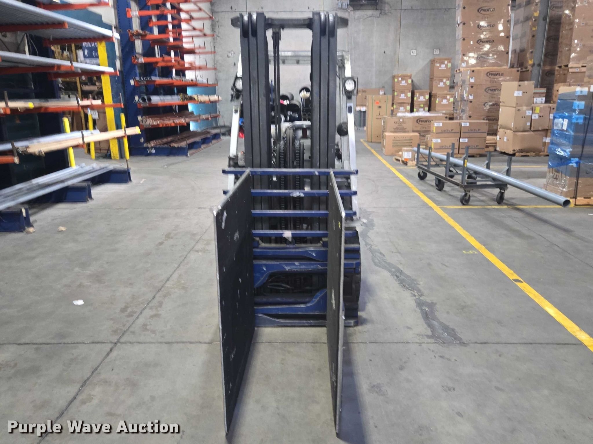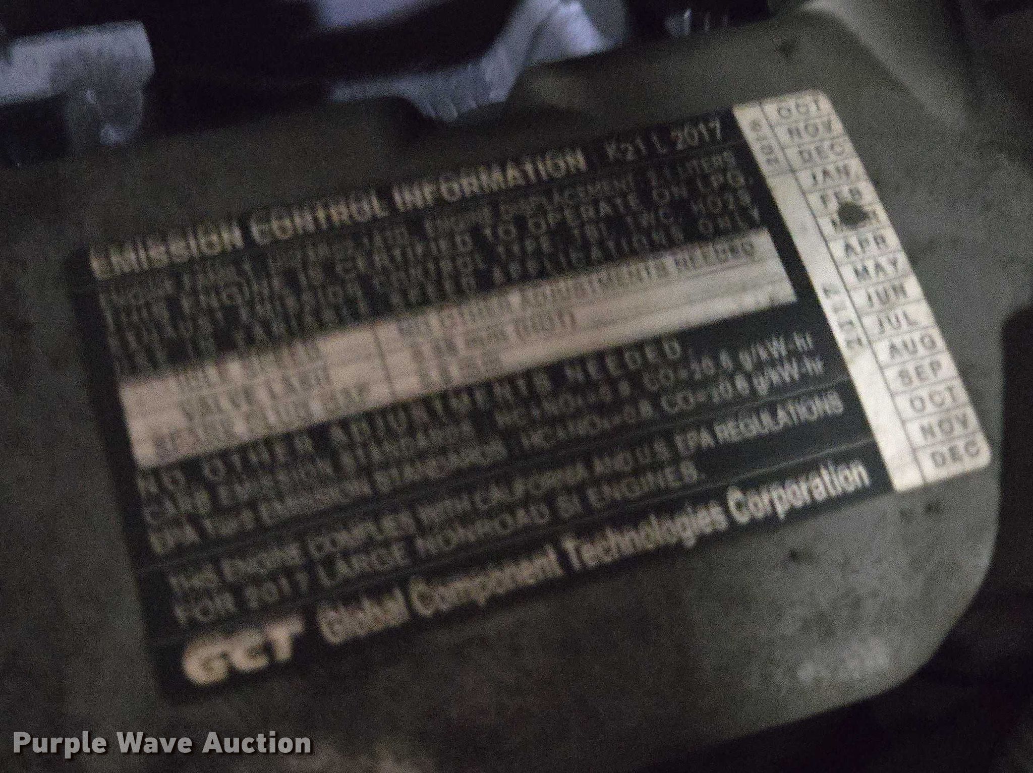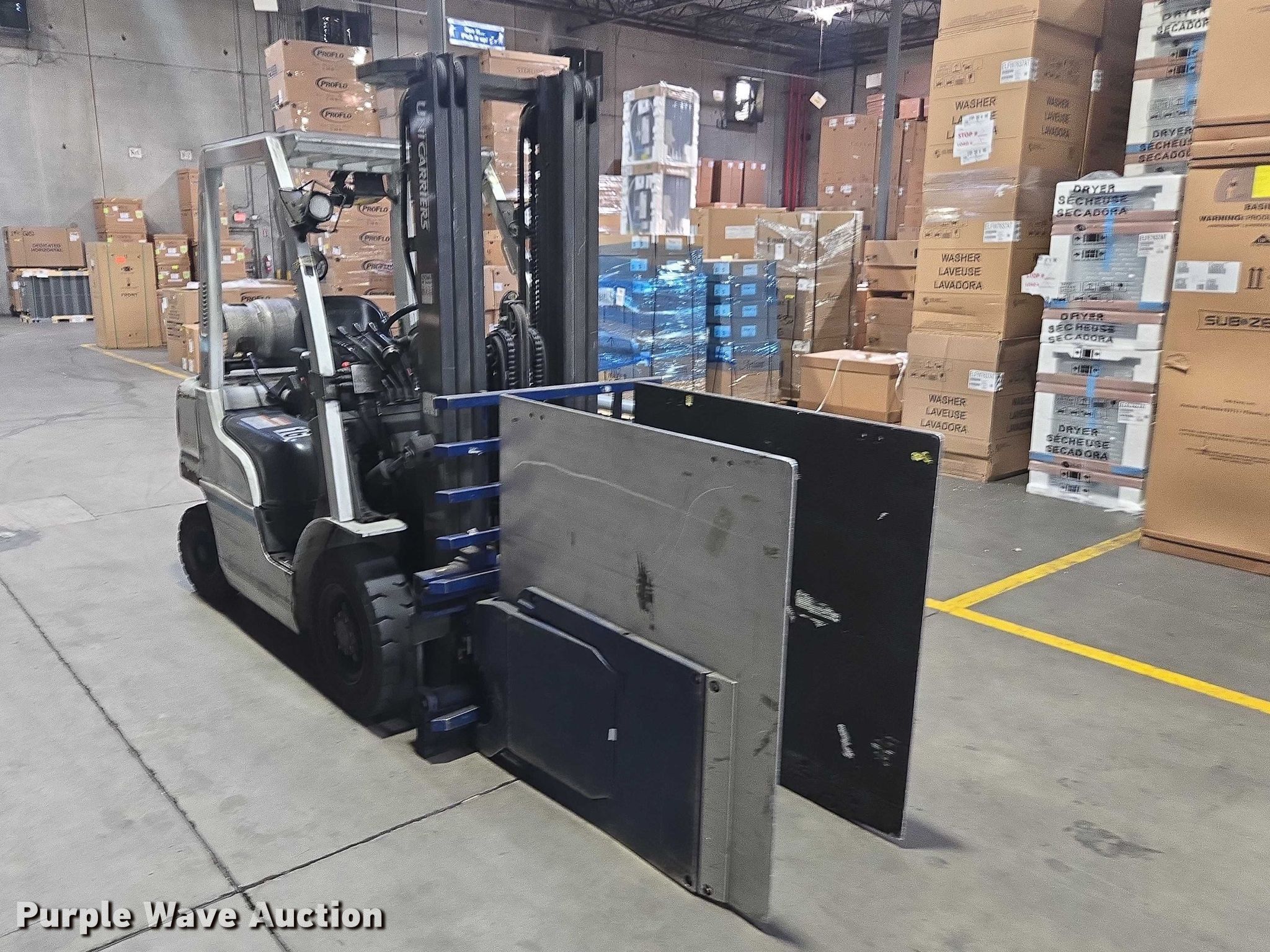 2017 UniCarriers PF50 forklift. Hours: 3,644 on meter, Serial: P1F2-9H22041, Unit #: SFS2994. Engine GCT K21L, Displacement: 2.1L, Cylinders: 4, Fuel type: LPG LP bottle: Not included. Transmission Automatic. Operators station OROPS, Canopy. Features Maximum lift capacity: 2,500 lbs, Maximum lift height: 203", Collapsed mast height: 89", Mast stages: 3, Side shift, Mast tilt, Carton clamp 48". Tires Front: 7.00-12, Rear: 6.00-9, Solid. Notes Warning indicator: Master warning. Ferguson. Tampa, FL 33634