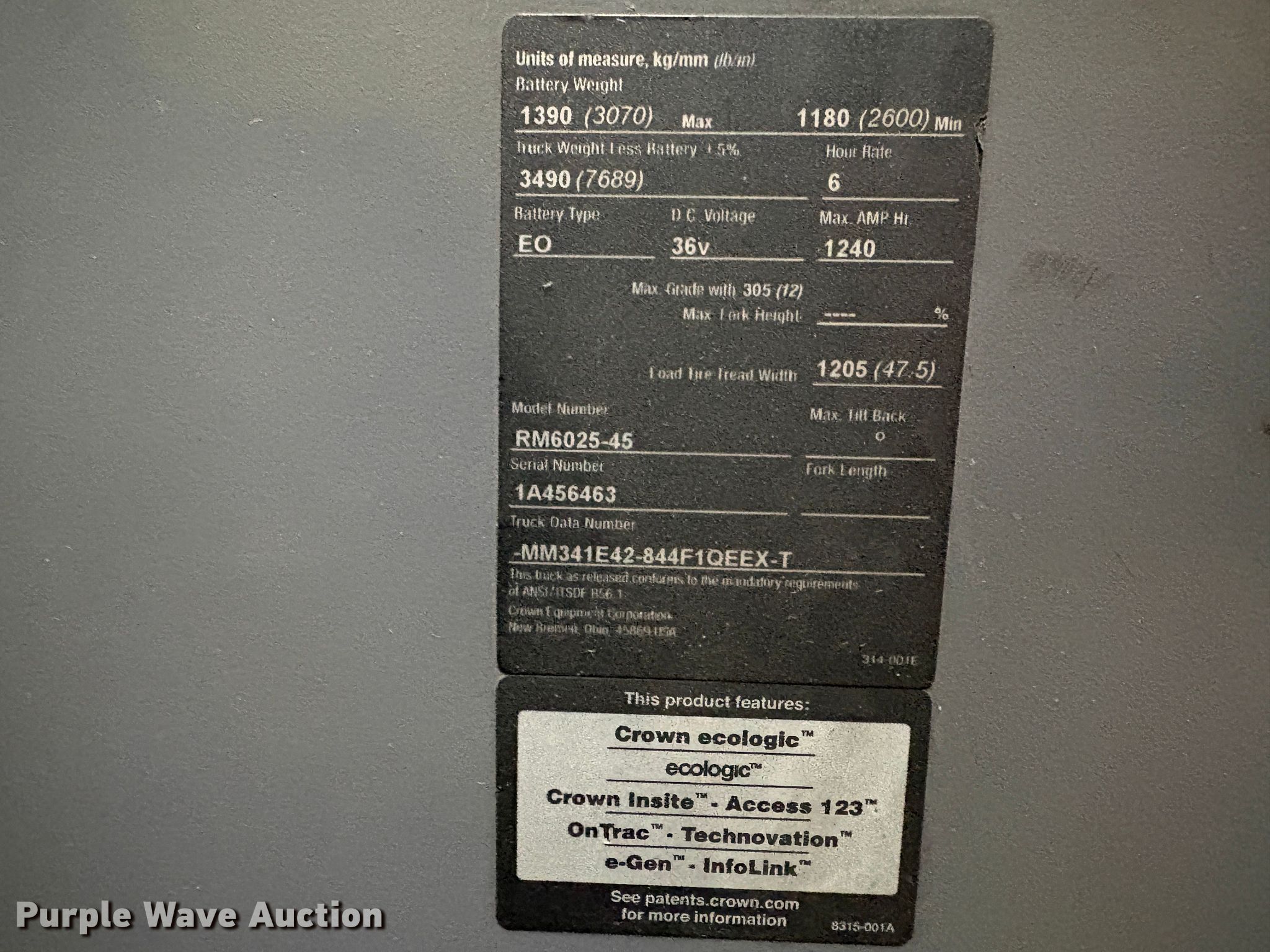 2016 Crown RM6025-45 reach truck. Hours: Unknown, Serial: 1A456463, Unit #: SFS2870. Electric Motor Volts: 36. Transmission Electric drive. Operators station OROPS. Features Maximum lift capacity: 4,500 lbs, Maximum lift height: 341", Collapsed mast height: 144", Mast stages: 3, Side shift, Mast tilt, Reach / retract, Fork length: 48". Tires Front: 13x5.5, Rear: 8x4, Solid. Notes Disassembly required for transport, Dead battery, Unknown operating condition. Ferguson. San Leandro, CA 94577