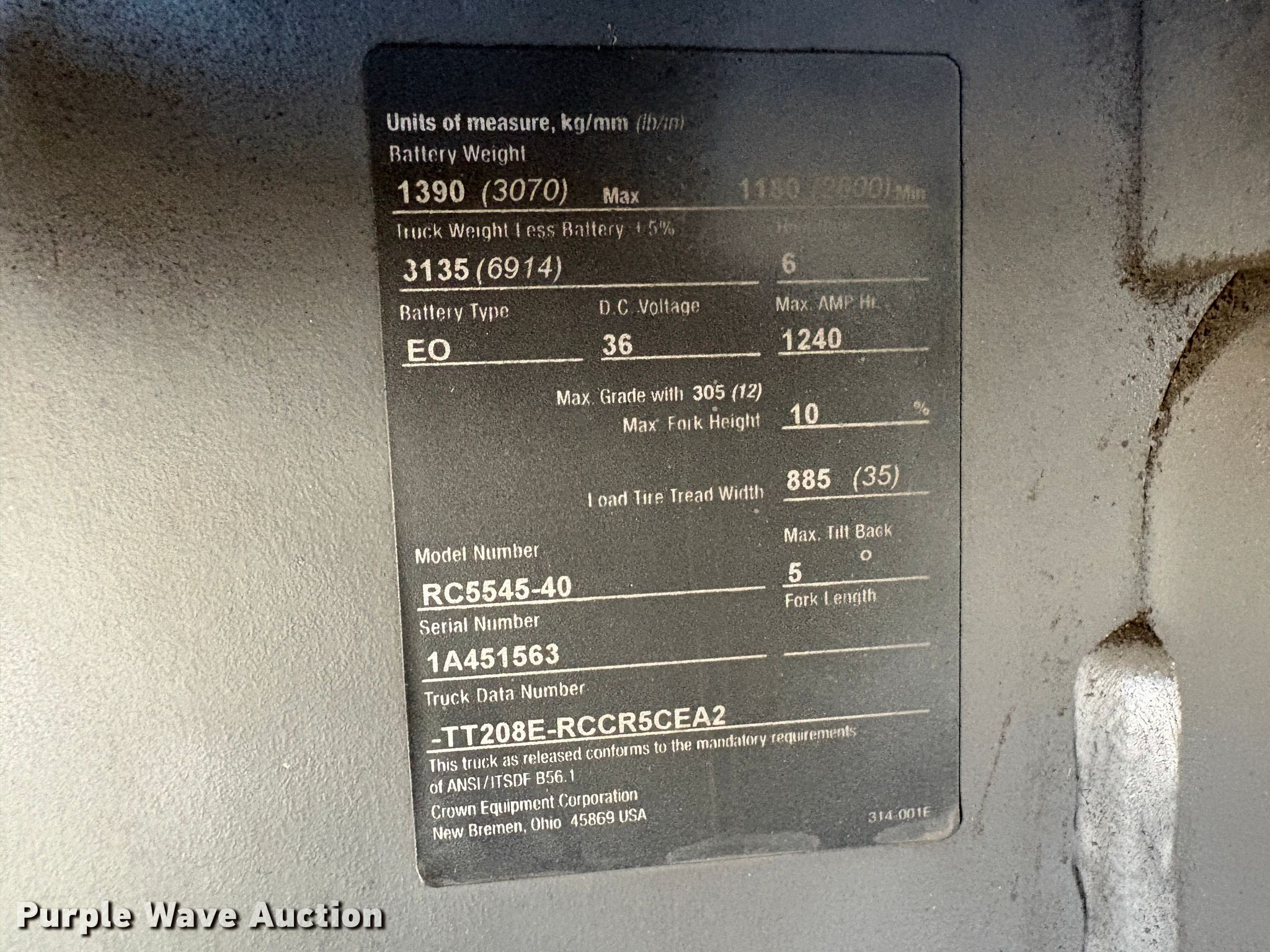 2015 Crown RC5545-40 forklift for sale in San Leandro, California. Item EC8262 will sell on March 25th, 2026.