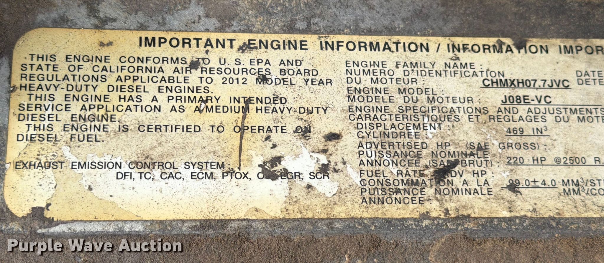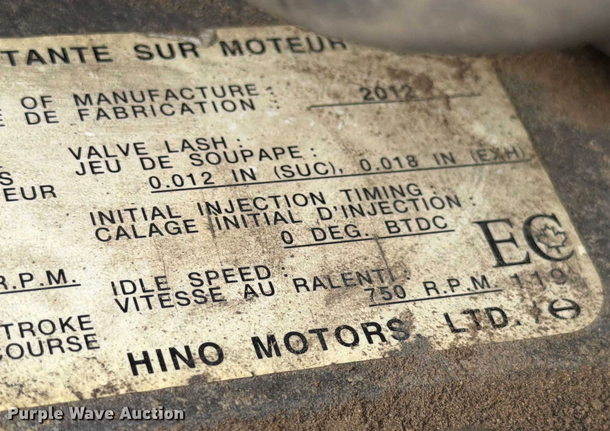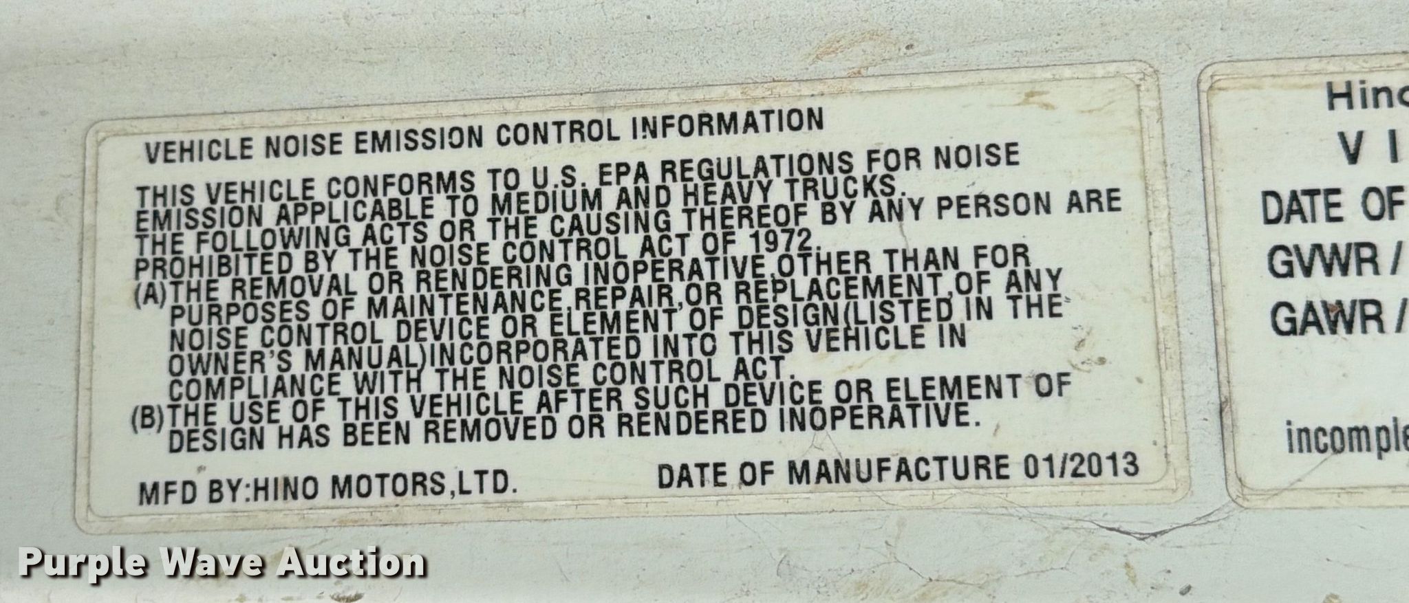 2013 Hino 268 vacuum truck. Miles: 253,565 on odometer, VIN: 5PVNJ8JL0D4S51755. Engine Hino Motors, Ltd J08E-VC/VB, Displacement: 7.6L, Cylinders: 6, Fuel type: Diesel, HP: 220. Transmission Automatic. Chassis Axles: Single, Suspension: Spring, Brakes: Air, PTO. Interior AC, Heat, Power windows, Cruise control. Features Bed Tank bed, Length: 12' 2", Width: 96", Top hatches: 2, Rear outlet: 4", Vacuum pump NVE, Serial: 26791. Tires Size: 11R22.5. Notes Dash warning indicator: Check engine, DPR check, Windshield chipped or cracked, Non-operational vacuum pump, does not turn. Texas title. Title distribution may be delayed up to 14 days from verification of funds. Brannon Industrial Group. College Station, TX 77845
