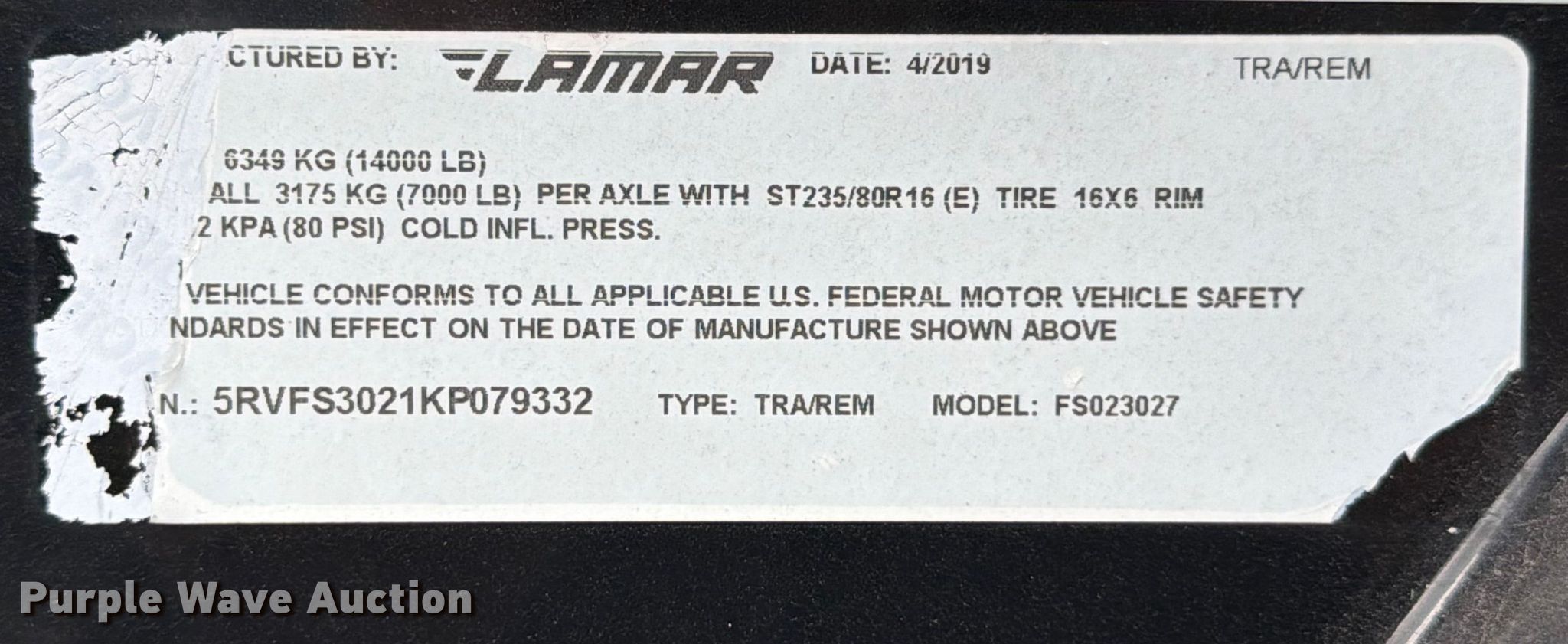 Purple Wave is selling a used Equip. Trailer in Texas. This item is a 2019 Lamar FS023027 equipment trailer with the following: VIN: 5RVFS3021KP079332