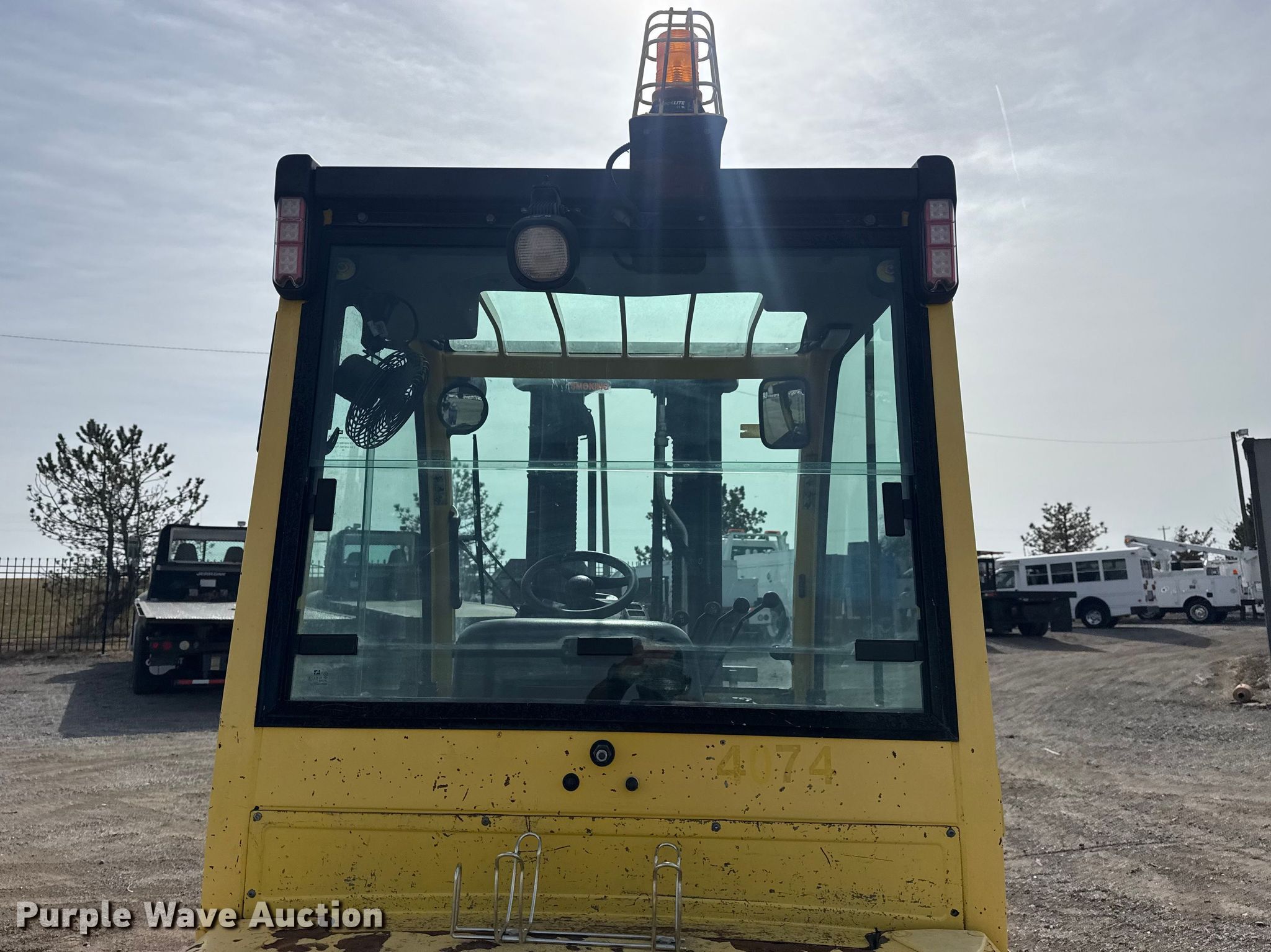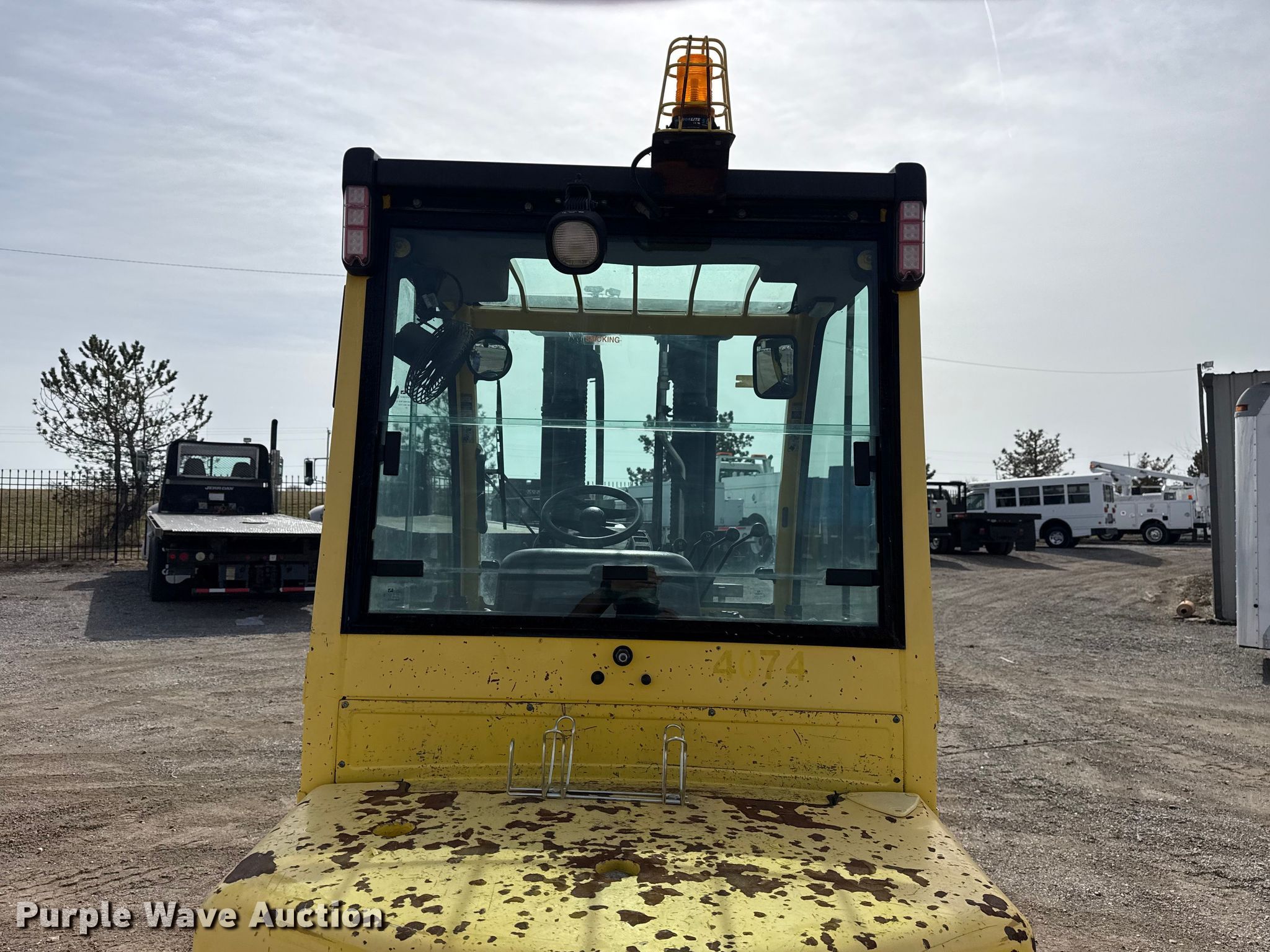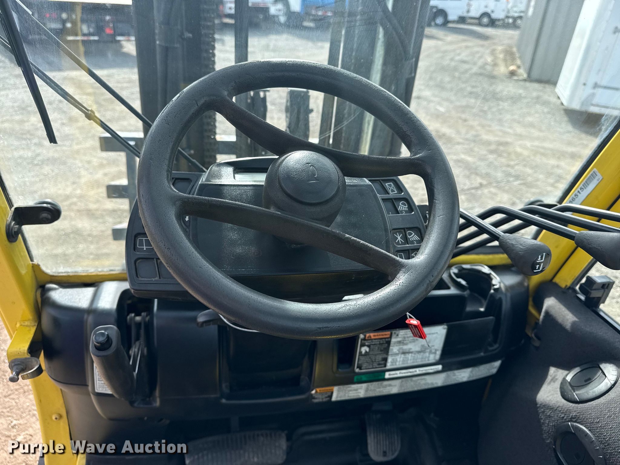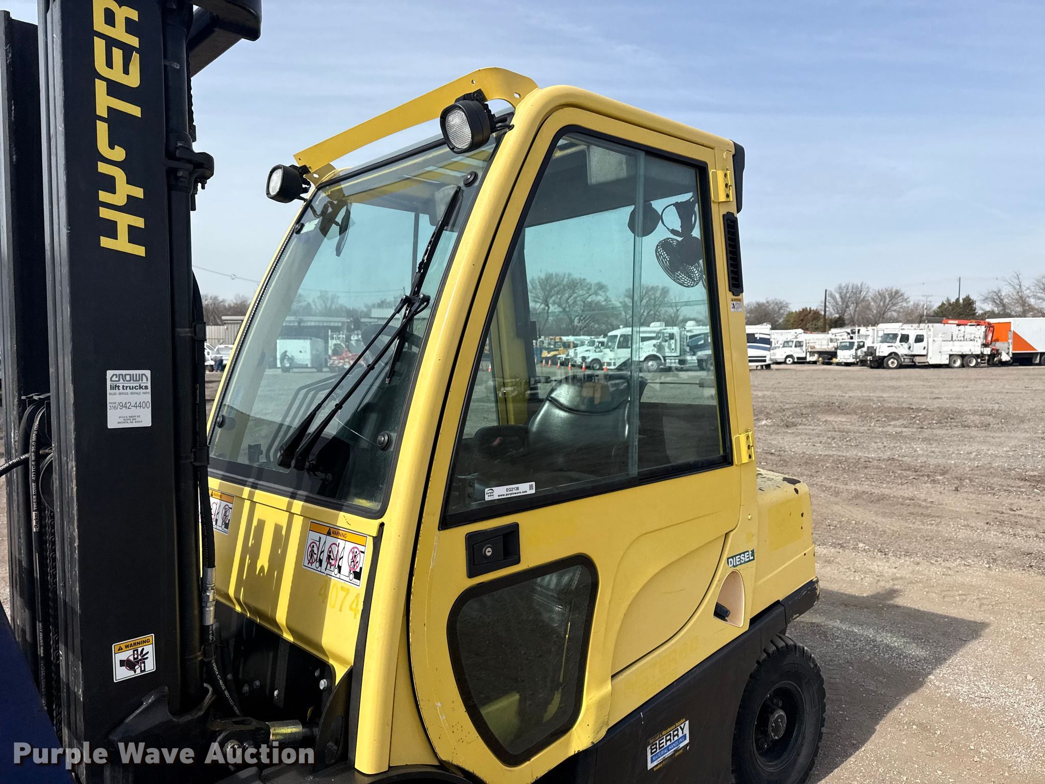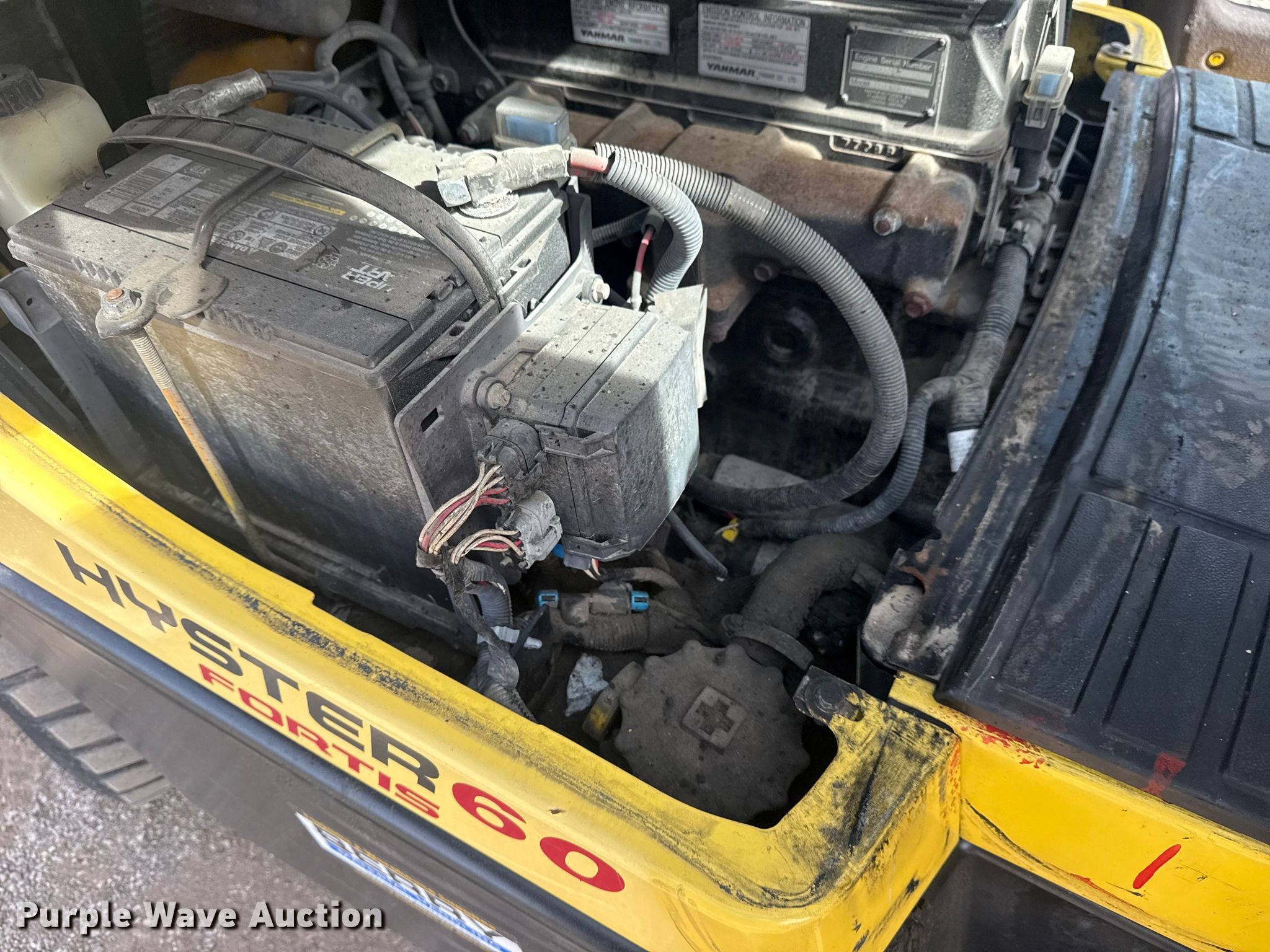 Hyster H60FT forklift. Hours: 4,919 on meter, Serial: L177B25327F. Engine Yanmar 4TNE92-NMH, Displacement: 2.659L, Fuel type: Diesel. Transmission Powershift. Operators station Enclosed cab, Heat. Features Maximum lift capacity: 4,350 lbs, Maximum lift height: 187", Collapsed mast height: 89", Mast stages: 2, Side shift, Mast tilt, Fork length: 51". Tires Front: 28x9-15, Rear: 6.50-10. Collinsville, OK 74021