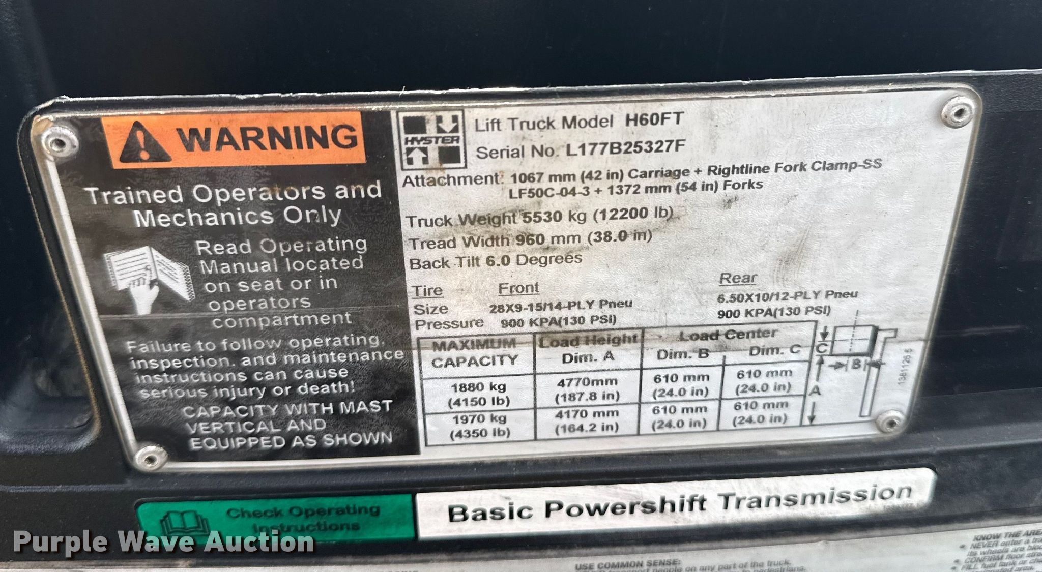 Purple Wave is selling a used Warehouse Forklift in Oklahoma. This item is a Hyster H60FT forklift with the following: Hours: 4,919 on meter, Serial: L177B25327F