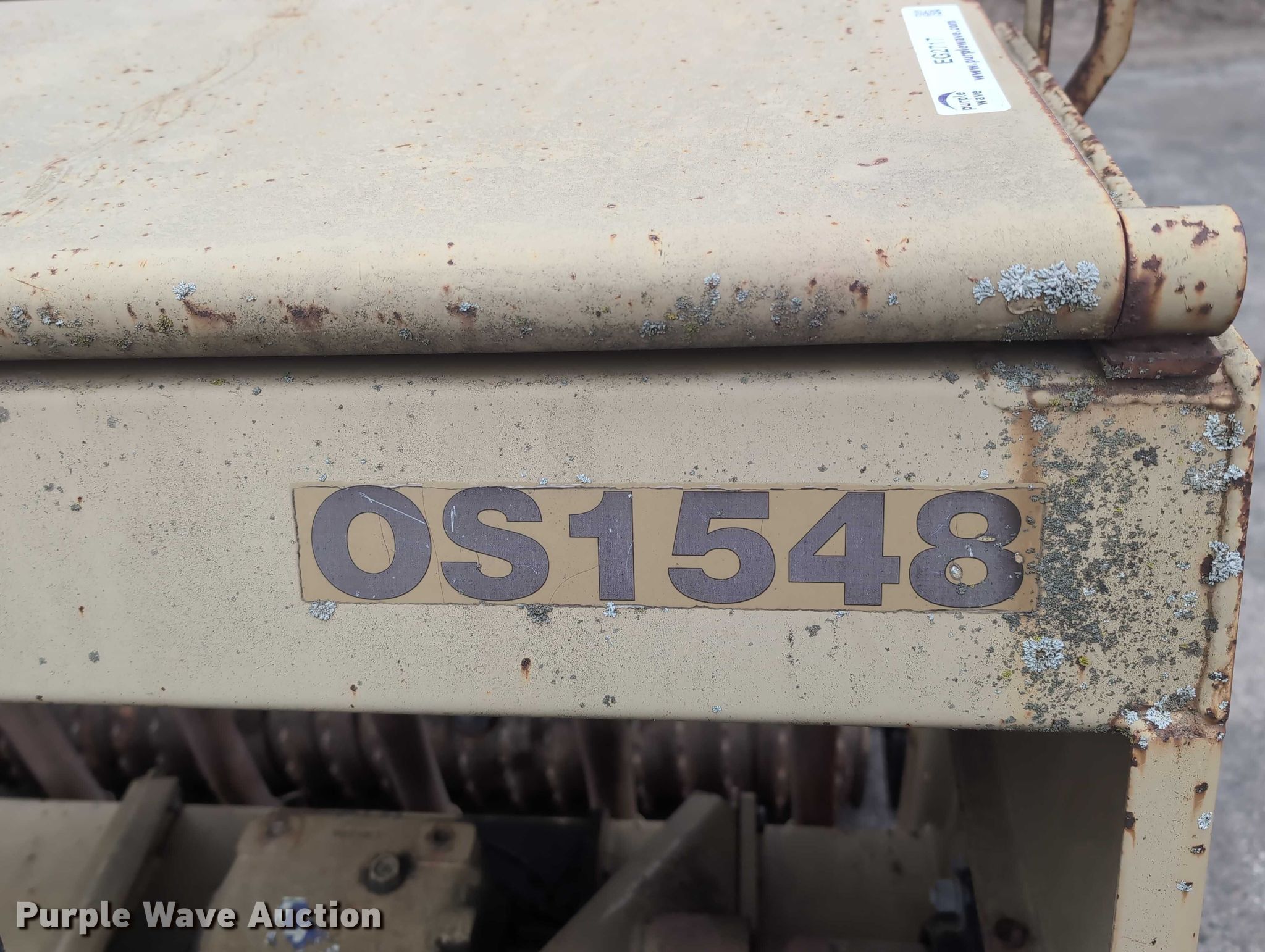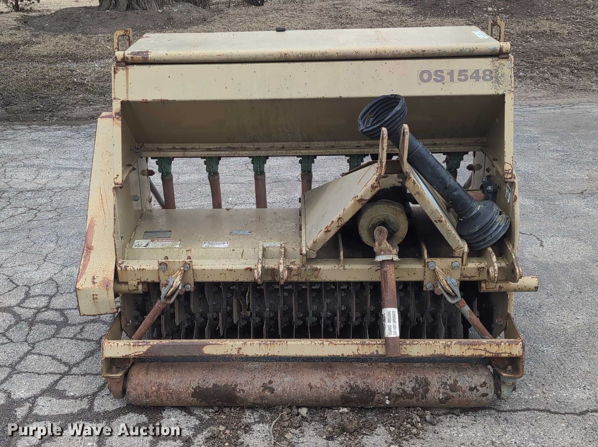 Land Pride OS1548 seeder. Width: 4', Serial: 495239. Features Frame Hitch: Three point, Seed delivery Bulk fill system, Capacity: 4 bushels, Row units Meter drive: Ground, PTO: 540, 46" W roller. Joliet, IL 60433