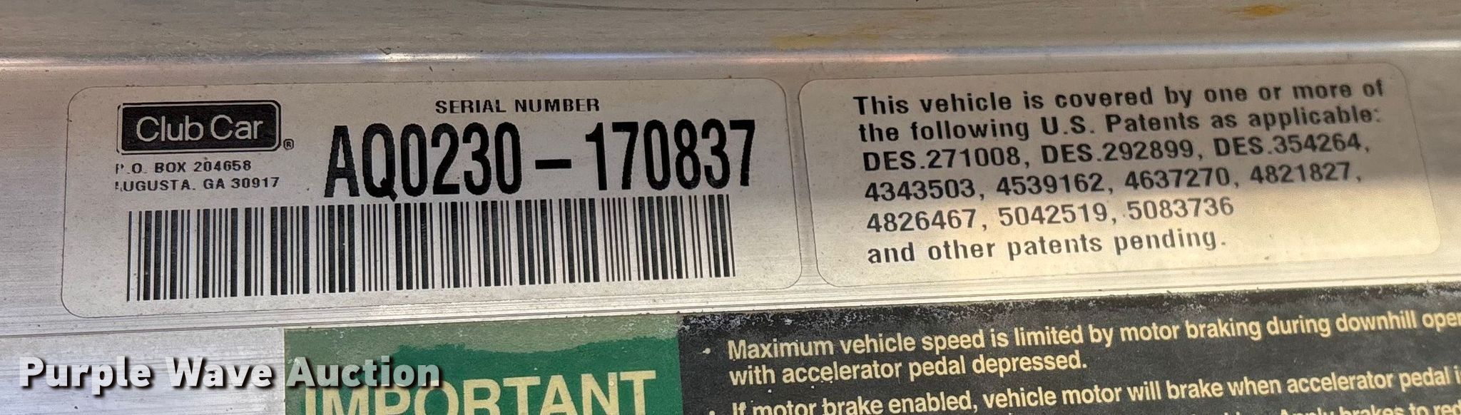 2002 Club Car golf cart. Serial: AQ0230-170837, Unit #: 8. Electric Motor Volts: 48. Transmission Automatic. Operators station Canopy. Tires Size: 18x8.50-8NHS. Notes Possible low battery charge, Charger included. Clear Creek Golf Car & Utility Vehicles, LLC. Ozark, MO 65721
