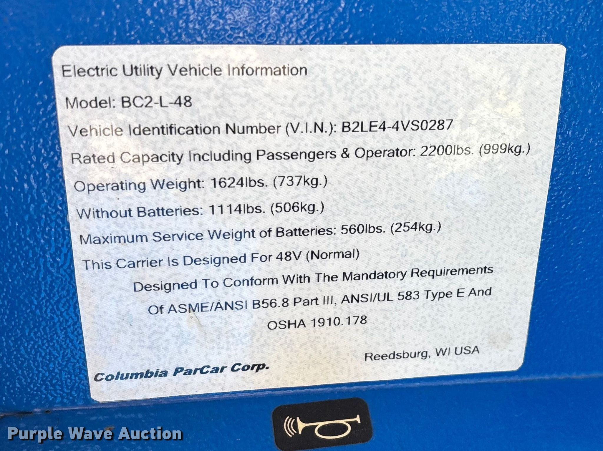 Purple Wave is selling a used Utility Vehicle in Missouri. This item is a Columbia BC2-L-48 utility vehicle with the following: VIN: B2LE4-4VS0287