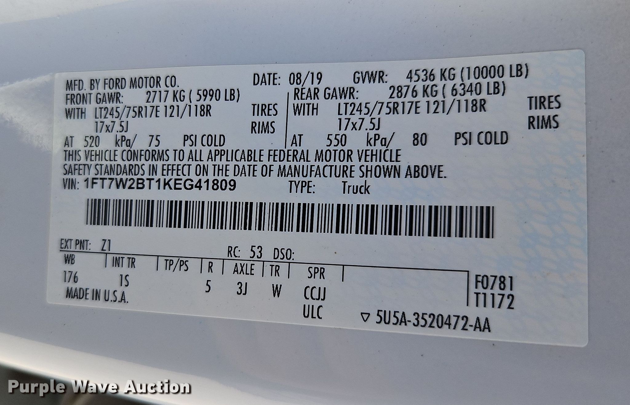 - VIN: 1FT7W2BT1KEG41809