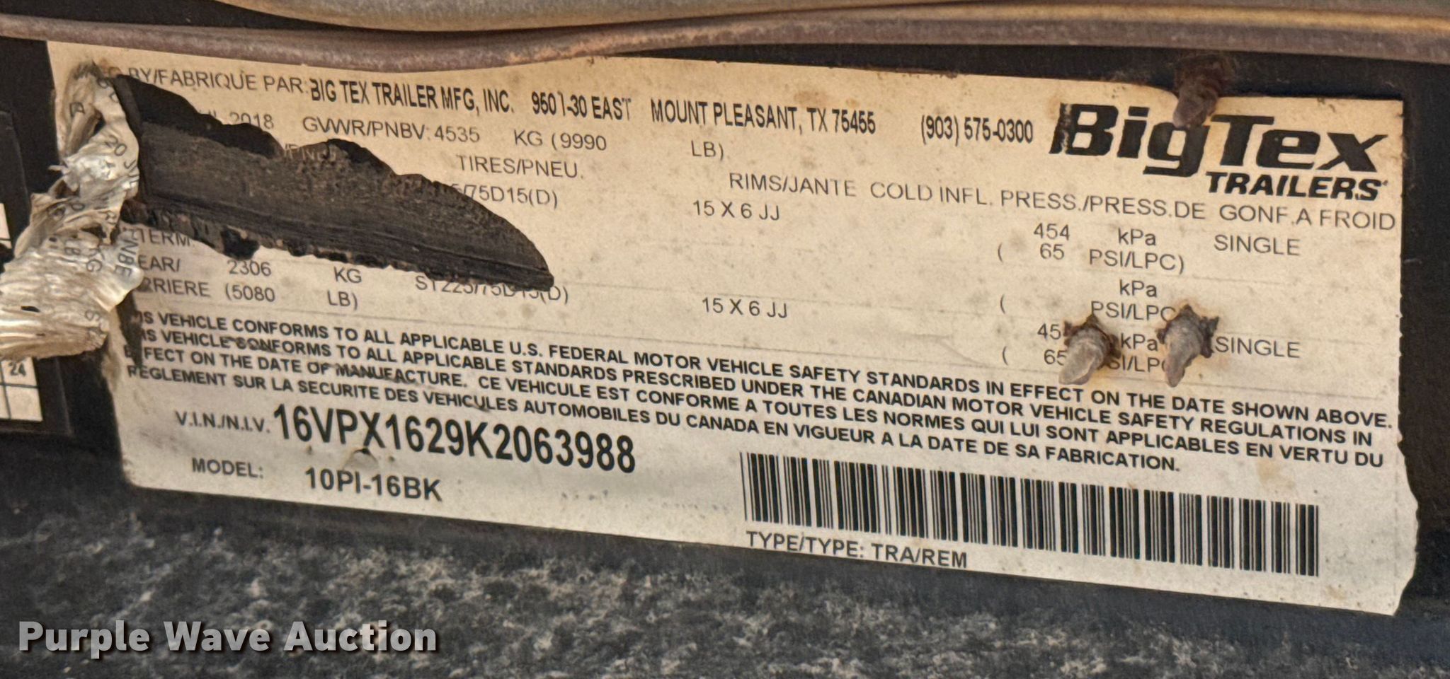 2019 Big Tex 10PI-16BK utility trailer. VIN: 16VPX1629K2063988. Dimensions Overall Length: 20', Width: 102", Deck Length: 16', Width: 84", Ramps: Manual Length: 4'. Features Deck type: Wood. Chassis Ball hitch: 2 5/16", Landing gear: Single, Suspension: Spring, Brakes: Electric, Axles: Tandem, GVWR: 9,990 lbs, GAWR: 5,080 lbs. Tires Steel wheels, Size: ST225/75R15. Transfer of ownership documentation will be a bill of sale. SWH Construction. Norman, OK 73072