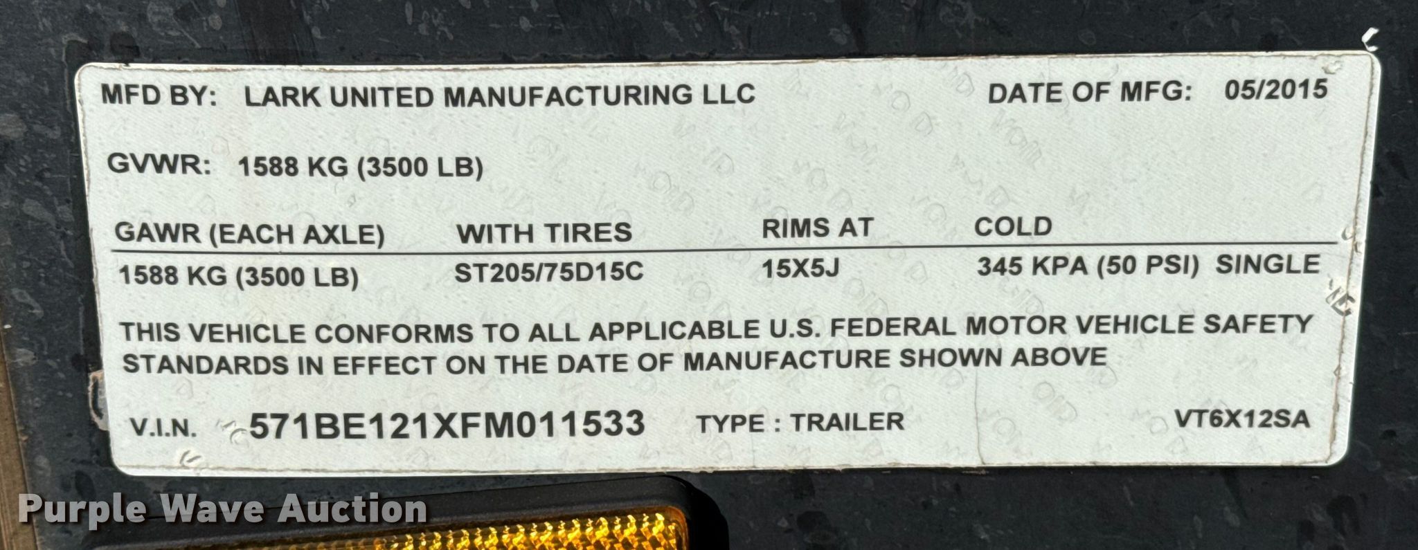 2015 Lark United Manufacturing LLC VT6X12SA enclosed cargo trailer. VIN: 571BE121XFM011533. Dimensions Overall Length: 15' 6", Width: 92", Body Length: 13' 2", Width: 72", Rear door / ramp 66" L x 62" W. Features Deck type: Wood. Chassis Ball hitch: 2", Landing gear: Single, Suspension: Spring, Brakes: Electric, GVWR: 3,500 lbs, GAWR: 3,500 lbs. Tires Steel wheels, Size: ST205/75R15. Notes Trailer plug damaged. Transfer of ownership documentation will be a bill of sale. SWH Construction. Norman, OK 73072