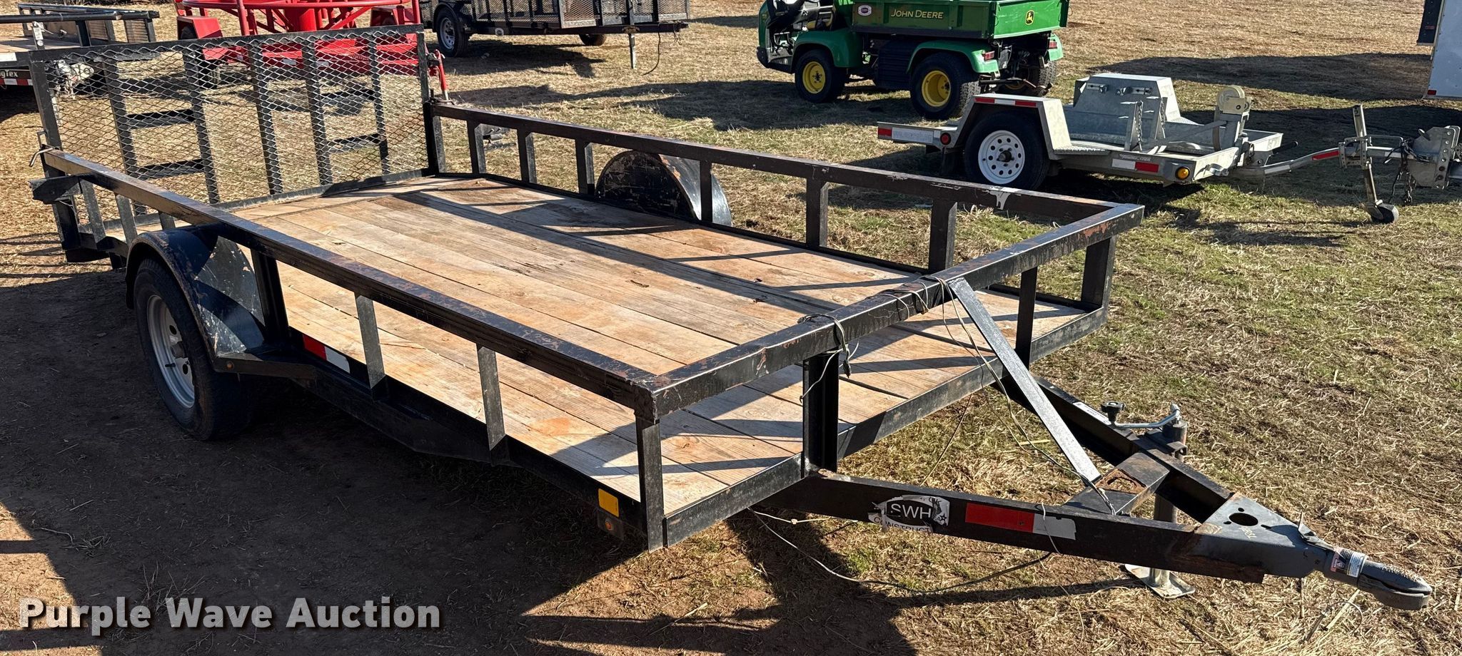 Shop built utility trailer. Dimensions. Overall Length: 18', Width: 96", Deck Length: 12', Width: 77", Side height: 14", Tail length: 2', Ramps: Manual Length: 34". Features Deck type: Wood. Chassis Ball hitch: 2 5/16", Landing gear: Single, Suspension: Air, Axles: Tandem. Tires Steel wheels, Size: ST205/75D15. Notes Wiring issues. Transfer of ownership documentation will be a bill of sale. SWH Construction. Norman, OK 73072