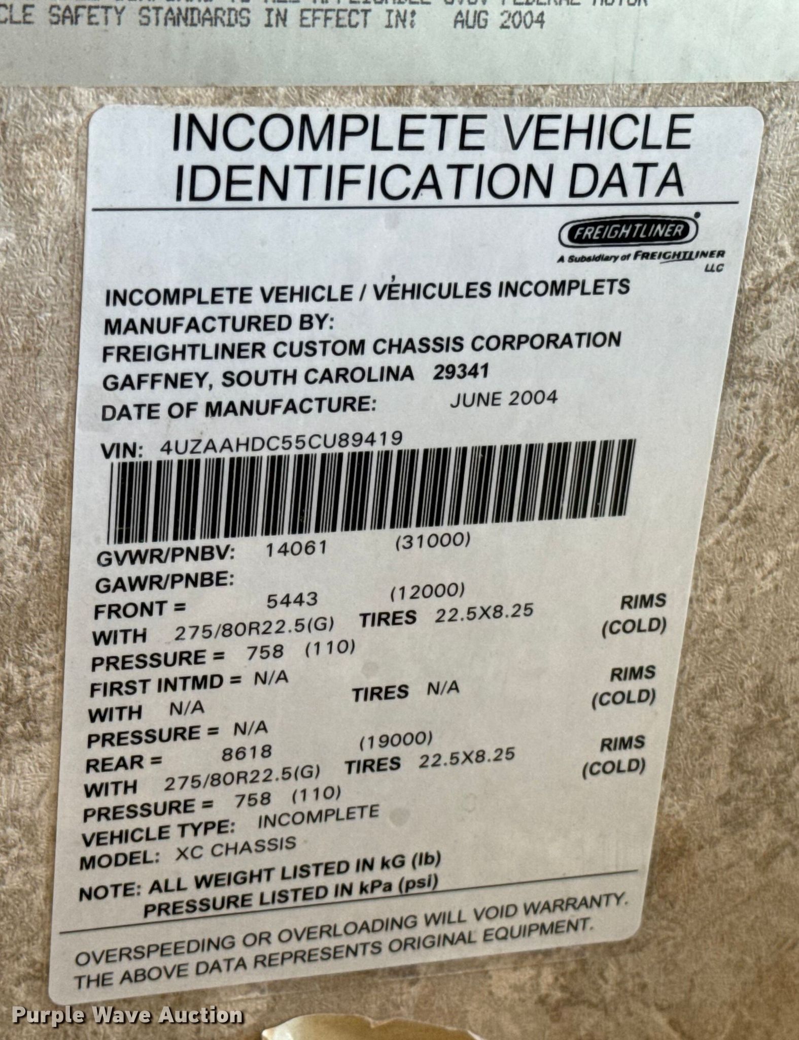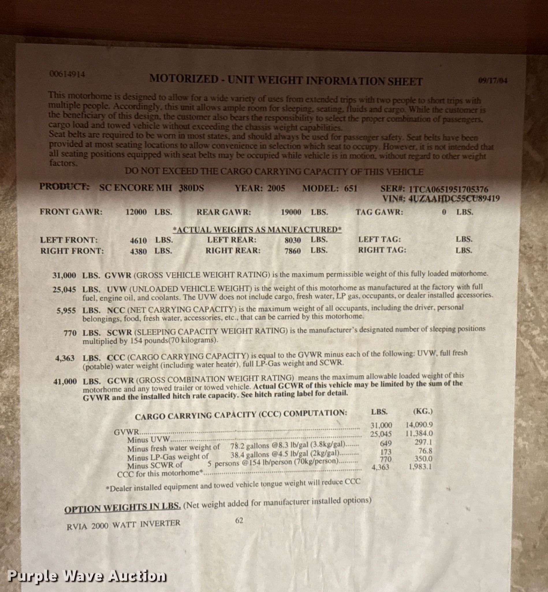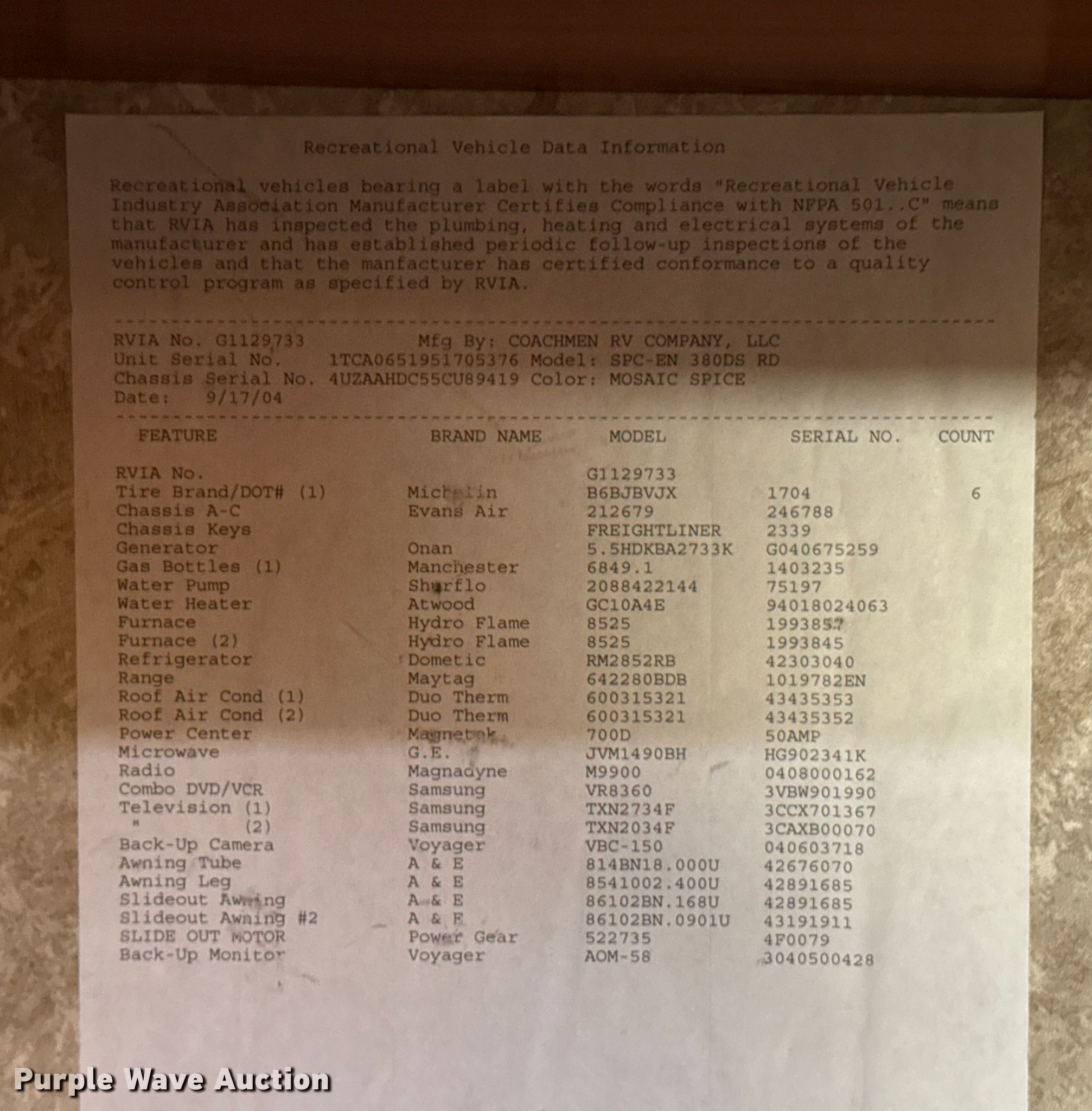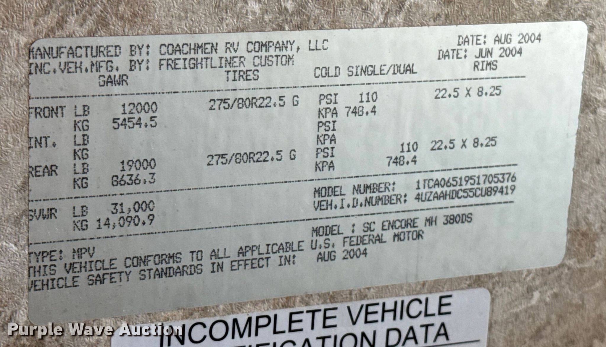 Purple Wave is selling a used RV or Camper in Oklahoma. This item is a 2005 Coachman Encore 380DS RV with the following: Miles: 54,076 on odometer, Hours: 1,985 on meter, VIN: 4UZAAHDC55CU89419, Insurance Salvage Unit Claim #: 5-813977