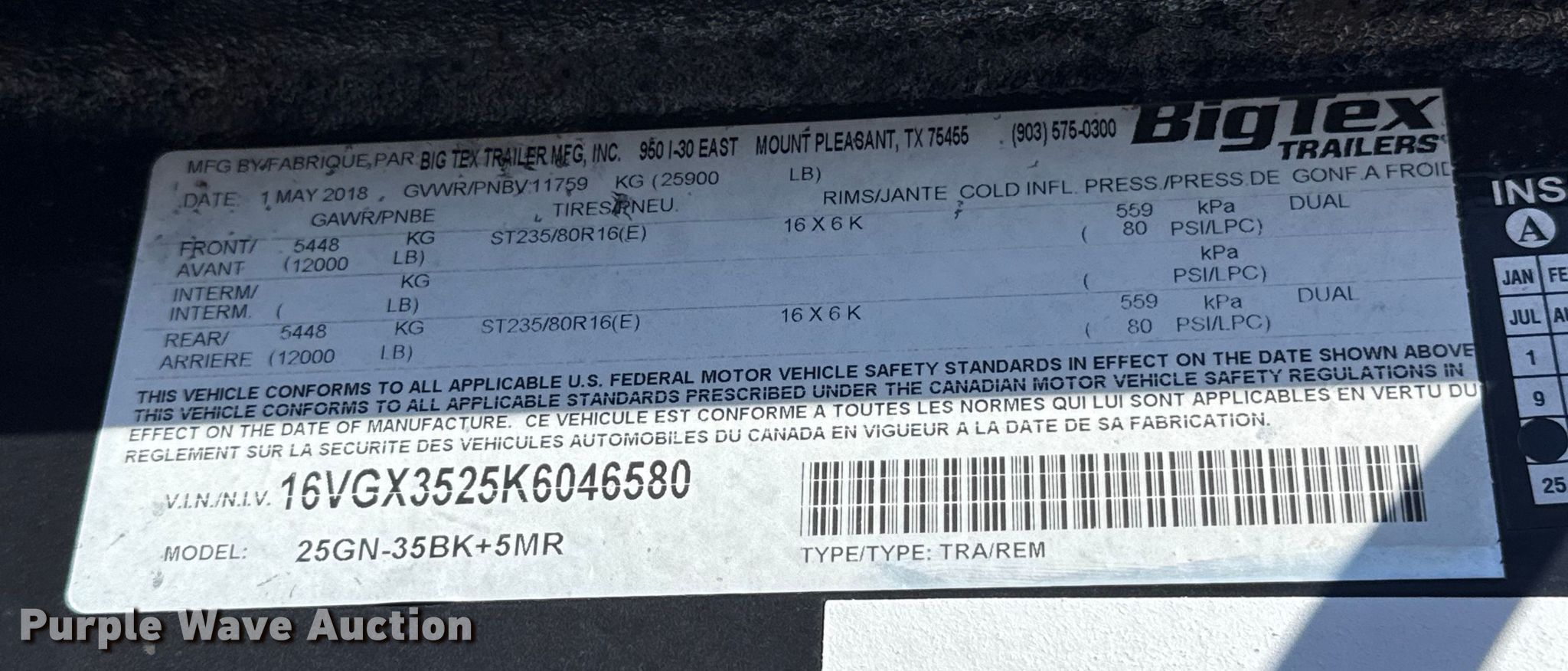 2019 Big Tex 25GN-35BK+5MR equipment trailer. VIN: 16VGX3525K6046580, Insurance Claim #: 6-800675. Dimensions Overall Length: 48', Width: 102", Deck Length: 35', Width: 97", Tail length: 5' 2", Ramps: Manual Length: 5' 2". Features Deck type: Wood. Chassis Hitch: Gooseneck, Landing gear: Dual, Suspension: Spring, Brakes: Electric, Axles: Spread, GVWR: 25,900 lbs, GAWR: 12,000 lbs. Tires Steel wheels, Size: ST235/80R16. Notes Gooseneck coupler damaged, bent. Oklahoma title. Title distribution may be delayed up to 14 days from verification of funds. Oklahoma Farm Bureau Insurance. Seminole, OK 74868