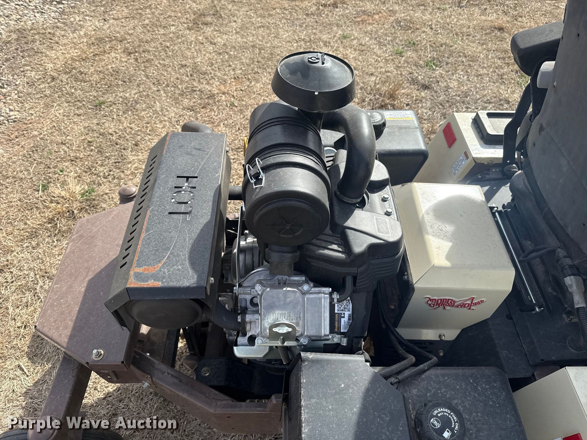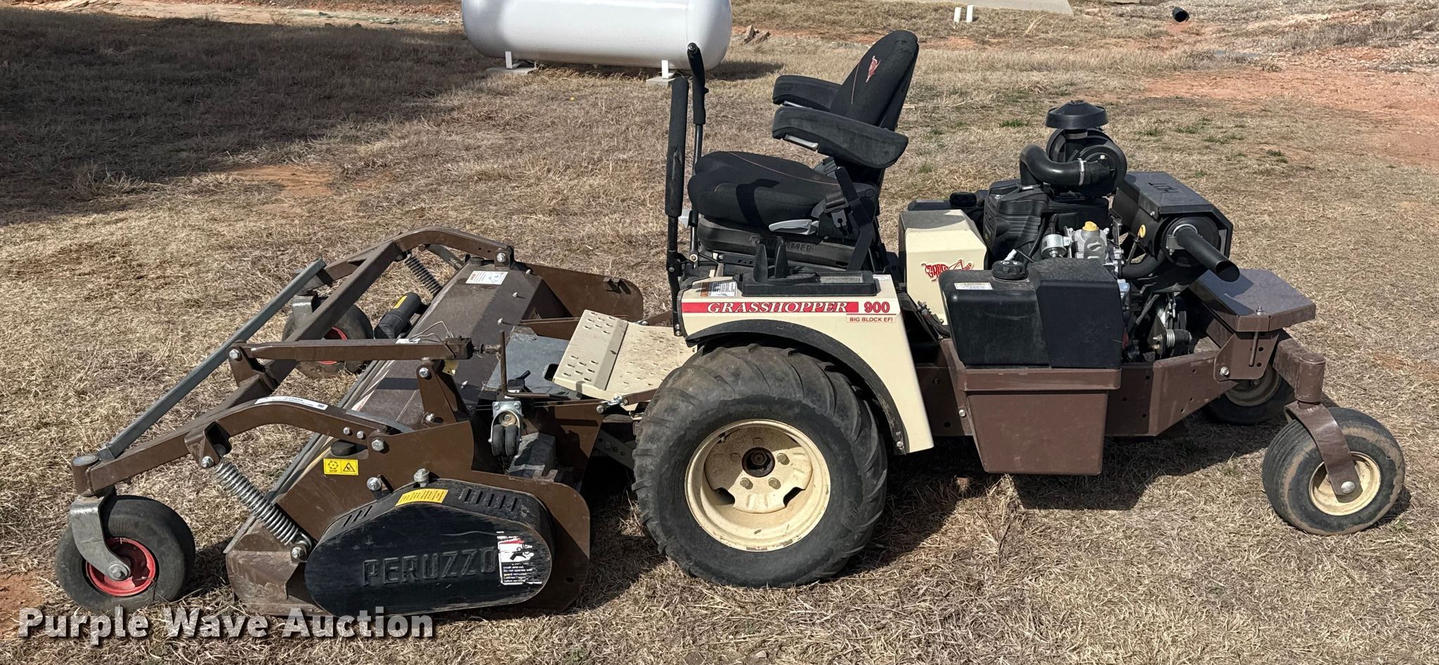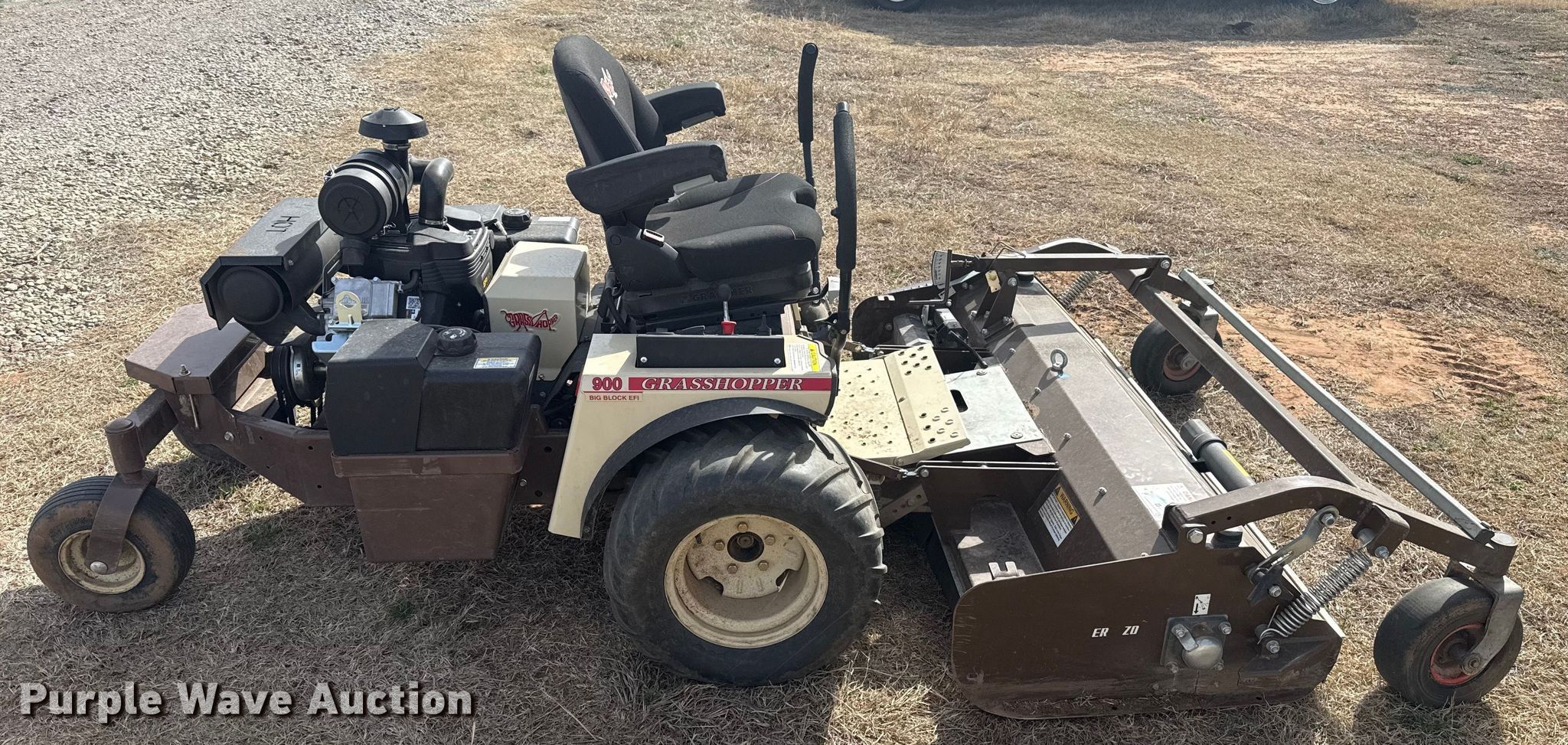 Grass Hopper 900 ZRT flail mower. Hours: 97 on meter, Cutting width: 60", Serial: 7411852. Engine Vanguard, Serial: 2405309466942, Displacement: 993 cc, Cylinders: 2, Fuel type: Gas, HP: 40. Transmission Hydrostatic. Chassis PTO. Features Peruzzo TEG 1600, Hydraulic front deck lift. Tires Front: 24X12.00-12, Rear: 13X6.50-6/4.50. A&B Eco-Safe Pest Control Inc.. Stillwater, OK 74074