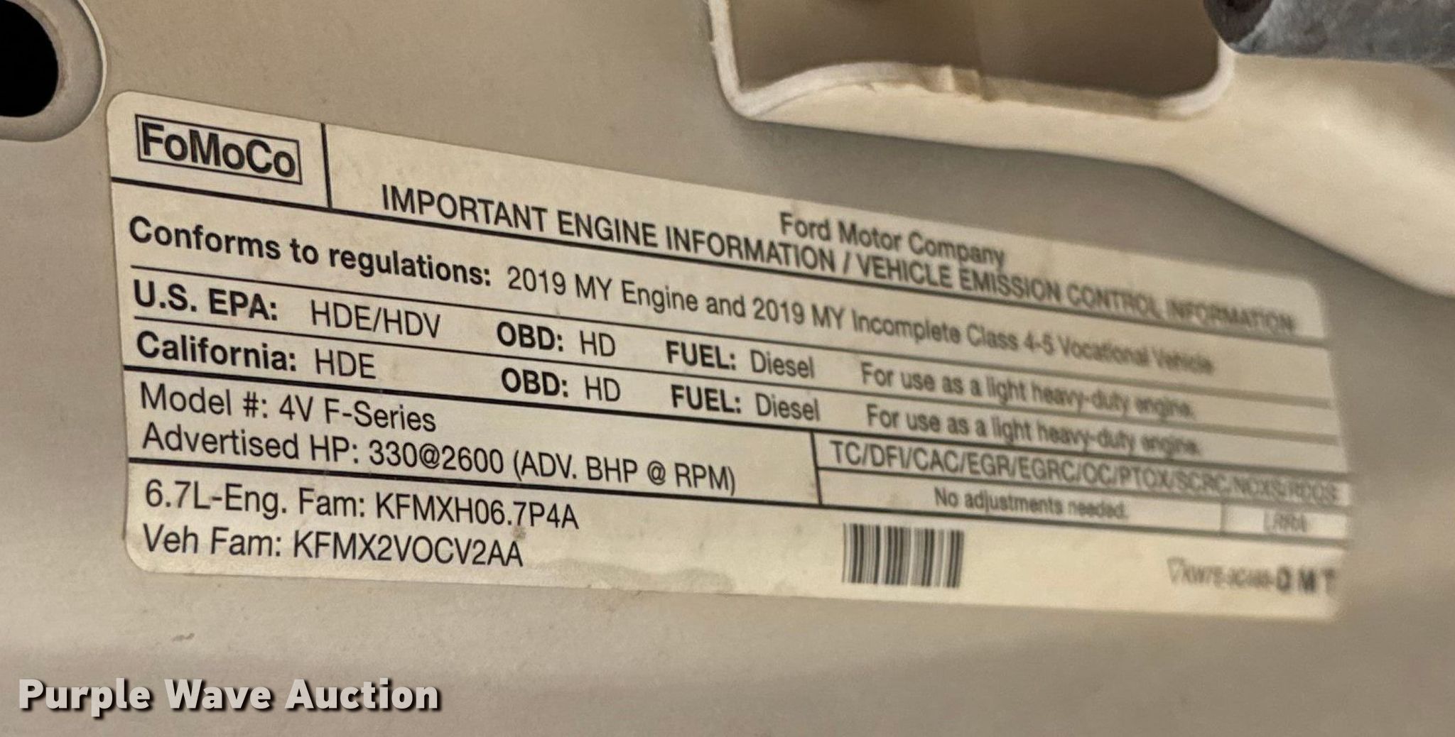 2019 Ford F550 truck cab and chassis. Miles: 205,697 on odometer, VIN: 1FD0W5GT5KED01358. Engine Displacement: 6.7L, Cylinders: 8, Fuel type: Diesel, HP: 440. Transmission Automatic. Interior AC, Heat, Heated mirrors, Power windows, Power locks, Cruise control, Auxiliary controls, Brake controller. Tires Size: 225/70R19.5. Notes Dash warning indicator: Check engine, Airbag, Windshield chipped or cracked, Hail damage. Oklahoma title. Title distribution may be delayed up to 14 days from verification of funds. Midstate Traffic Conrol, Inc.. Oklahoma City, OK 73114