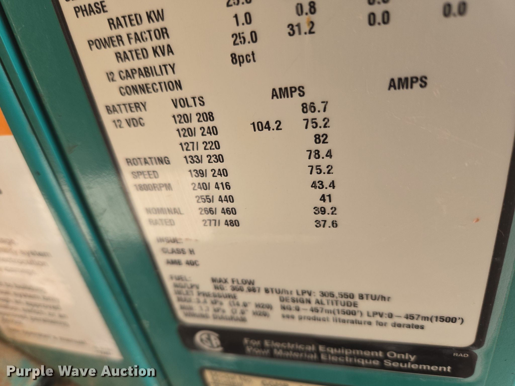 Cummins Power Generation GGMB-1219067 generator. Hours: 870 on meter, Serial: A130440316. Engine Cummins, Displacement: 3.0L, Cylinders: 4, Fuel type: LPG, Natural gas LP bottle: Not included. Features Generator Cummins GGMB-1219067, kVA: 25, kW: 25, Phase: Single, Electric start, Skid mounted. Notes Battery not included. Pioneer Telephone Company. Kingfisher, OK 73750