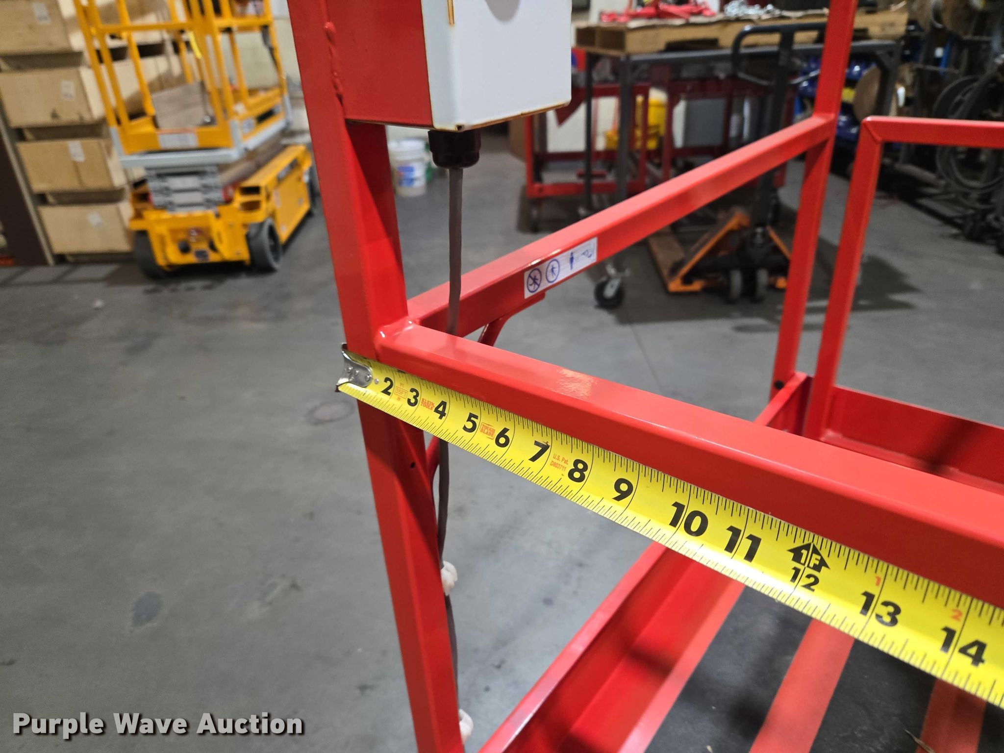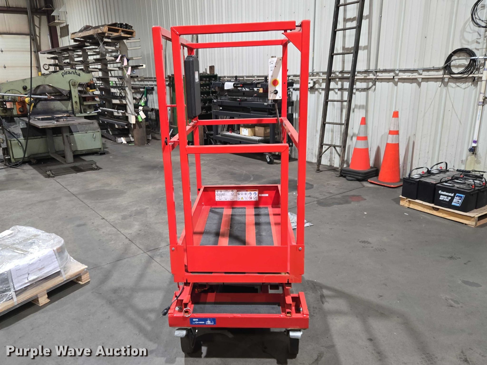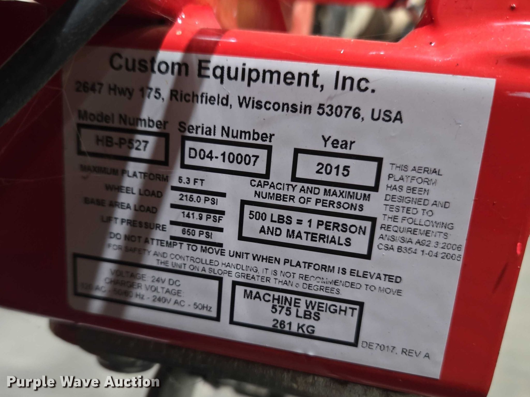 2015 Hy-Brid HB-P527 scissor lift. Hours: Unknown, Serial: D04-10007. Features Maximum lift capacity: 500 lbs, Maximum lift height: 5' 3", Platform: 39" L x 24" W, Controls: Platform, Safety alarm. Tires Tire size: 8x2, Solid. AXCS. West Bend, WI 53095