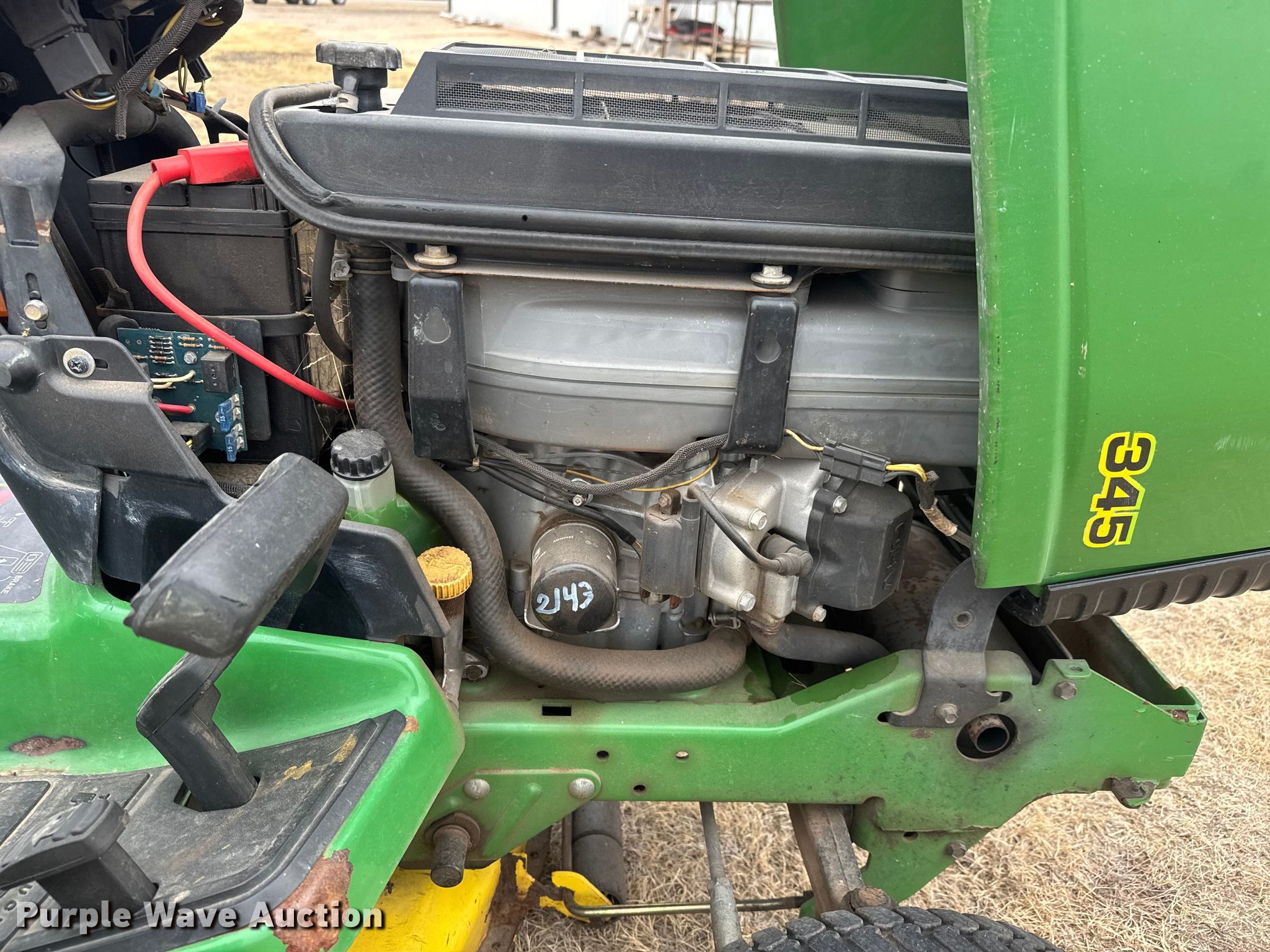 John Deere 345 lawn mower. Hours: 2,155 on meter, Cutting width: 50", Serial: M00345B040251, Unit #: 210048. Engine Cylinders: 2, Fuel type: Gas, HP: 20. Transmission Hydrostatic. Features Rear drawbar. Tires Front: 16x6.50-8, Rear: 23x10.50-12. KanEquip Inc.. Pratt, KS 67124