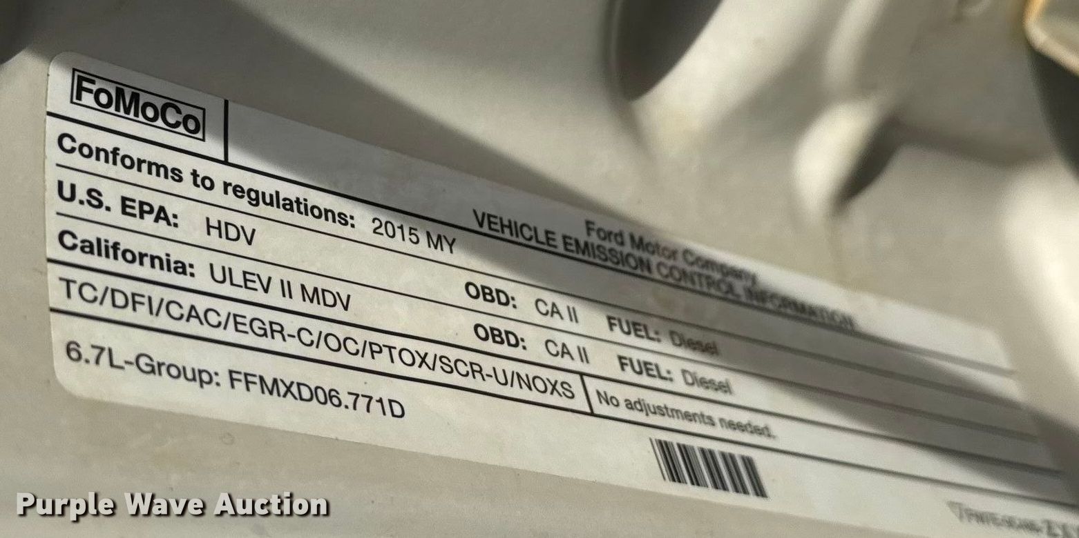 2015 Ford F350 Super Duty XL Ext. Cab pickup truck. Miles: 221,519 on odometer, Hours: 9,301 on meter, VIN: 1FT8X3BT8FEB24570. Engine Displacement: 6.7L, Cylinders: 8, Fuel type: Diesel. Transmission Automatic, Four wheel drive. Interior AC, Heat, Heated mirrors, Power windows, Power locks, Cruise control, Auxiliary controls, Brake controller. Features Auxiliary fuel tank. Tires Size: 275/70R18. Kansas title. Title distribution may be delayed up to 14 days from verification of funds. Dondlinger & Sons Construction. Wichita, KS 67217