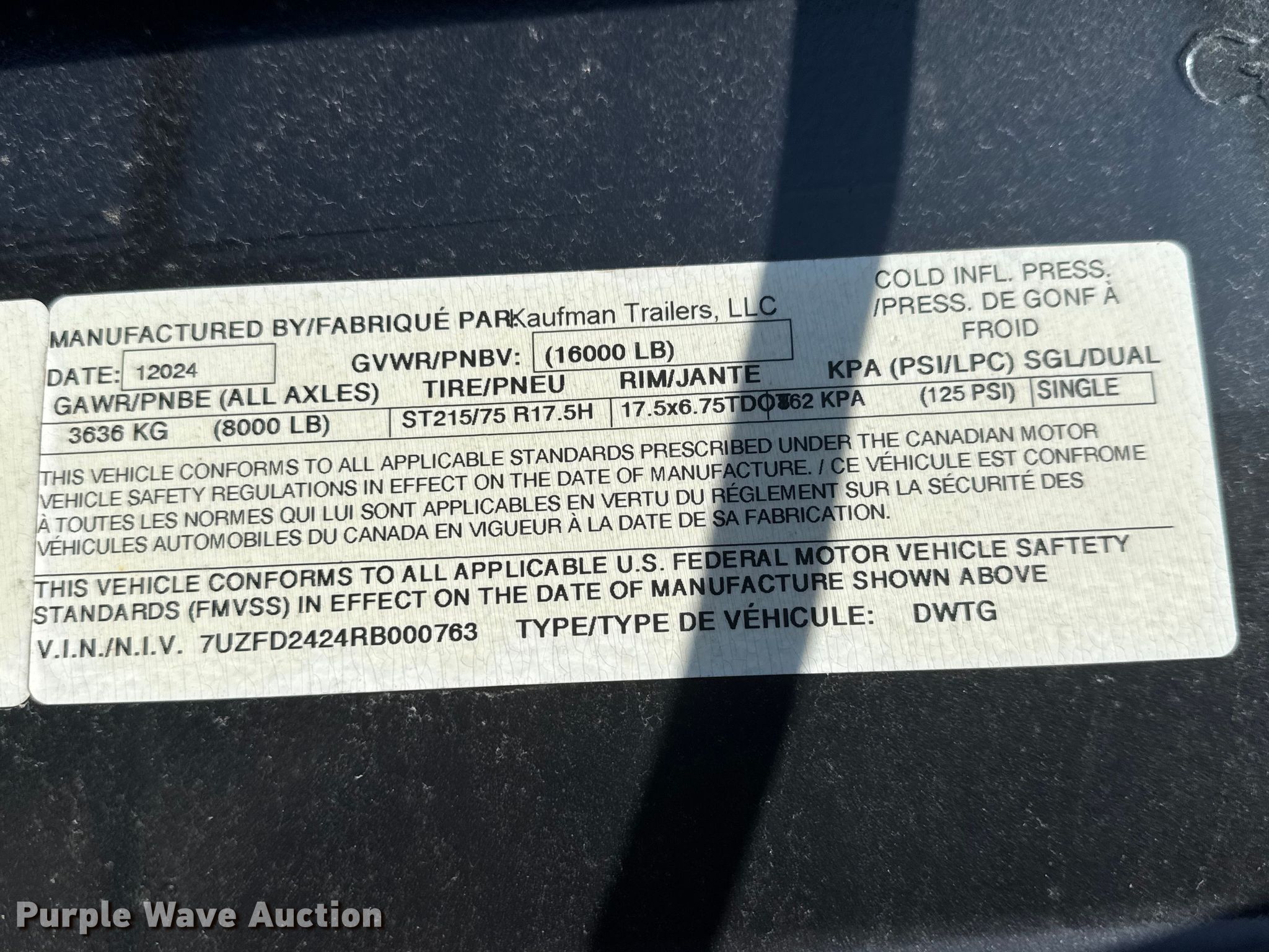 Purple Wave is selling a used Equip. Trailer in Kansas. This item is a 2024 Kaufman DWTG tilt deck equipment trailer with the following: VIN: 7UZFD2424RB000763