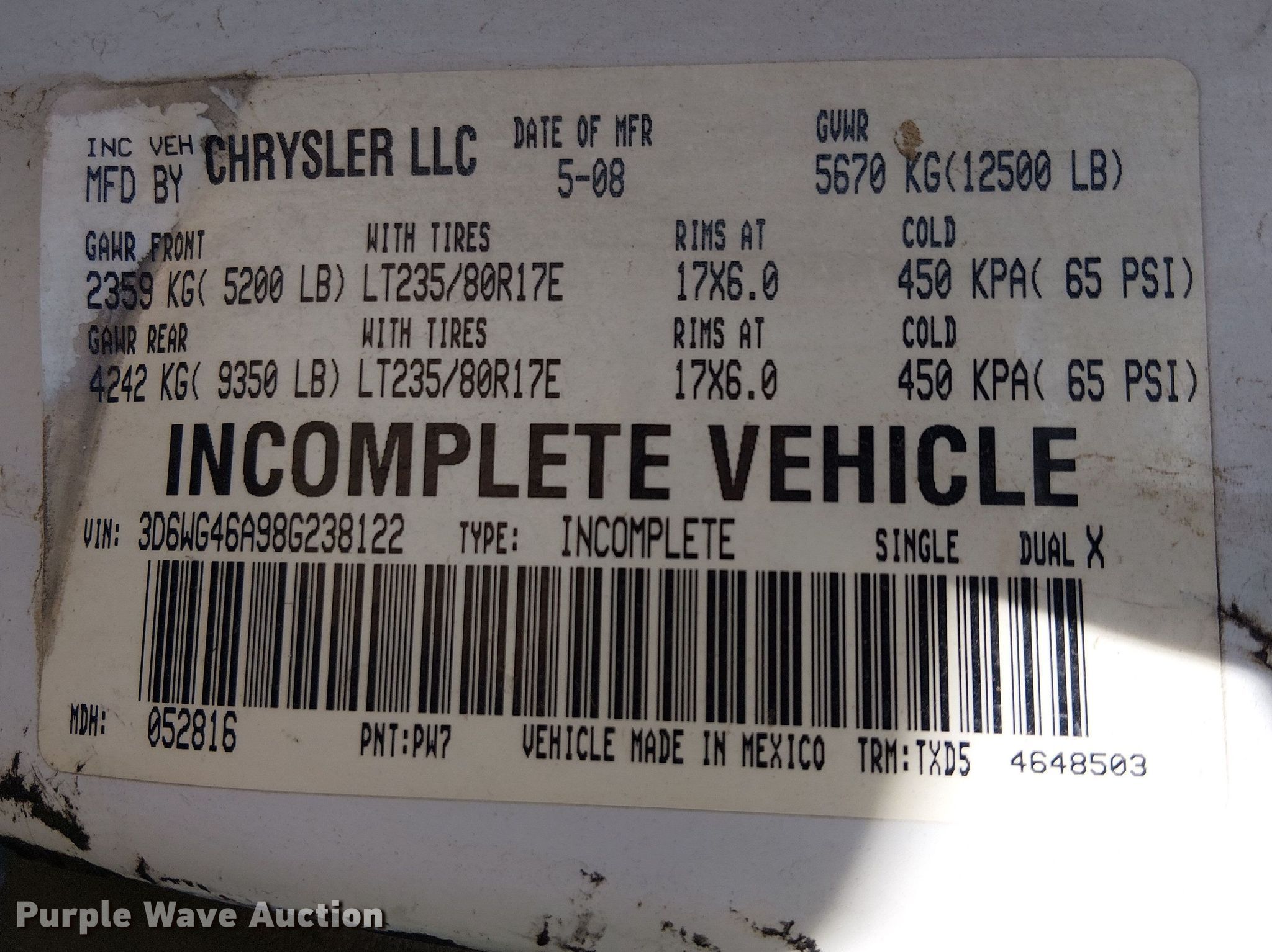 - VIN: 3D6WG46A98G238122