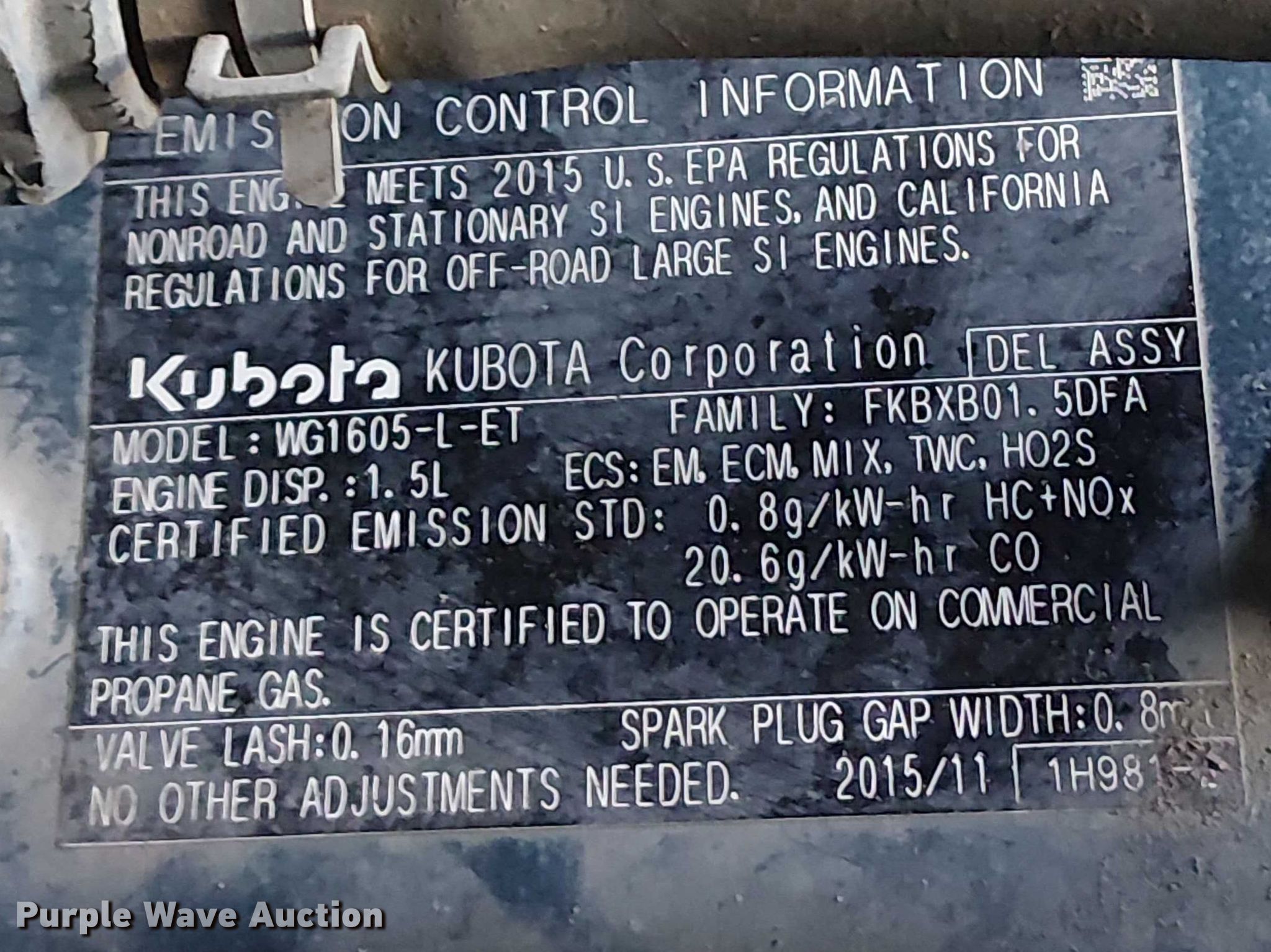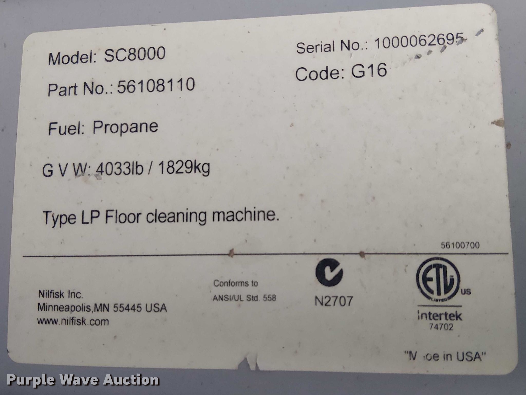2016 NILFISK SC8000 sweeper. Miles: Unknown, Serial: 1000062695. Engine Kubota WG1605-L-ET, Serial: 1FW4407, Displacement: 1.5L, Cylinders: 4, Fuel type: CNG, Propane bottle not included. Transmission Hydrostatic. Chassis GVWR: 4,033 lbs. Features Sweeper bed type: Vacuum, Capacity: 0.056cu.yd.. Notes Engine parts missing , Non-operational unit. Desert Services. Tempe, AZ 85288