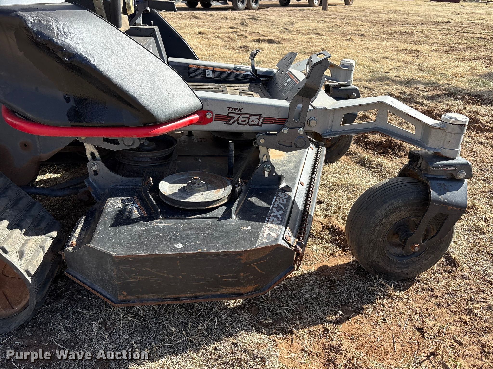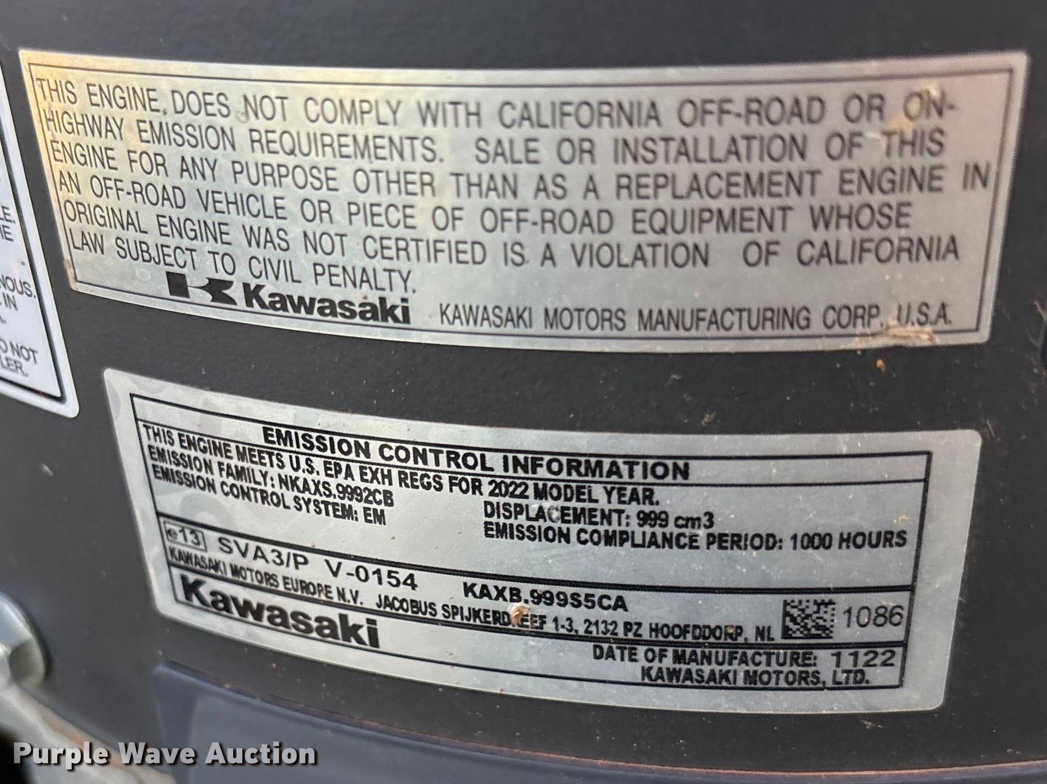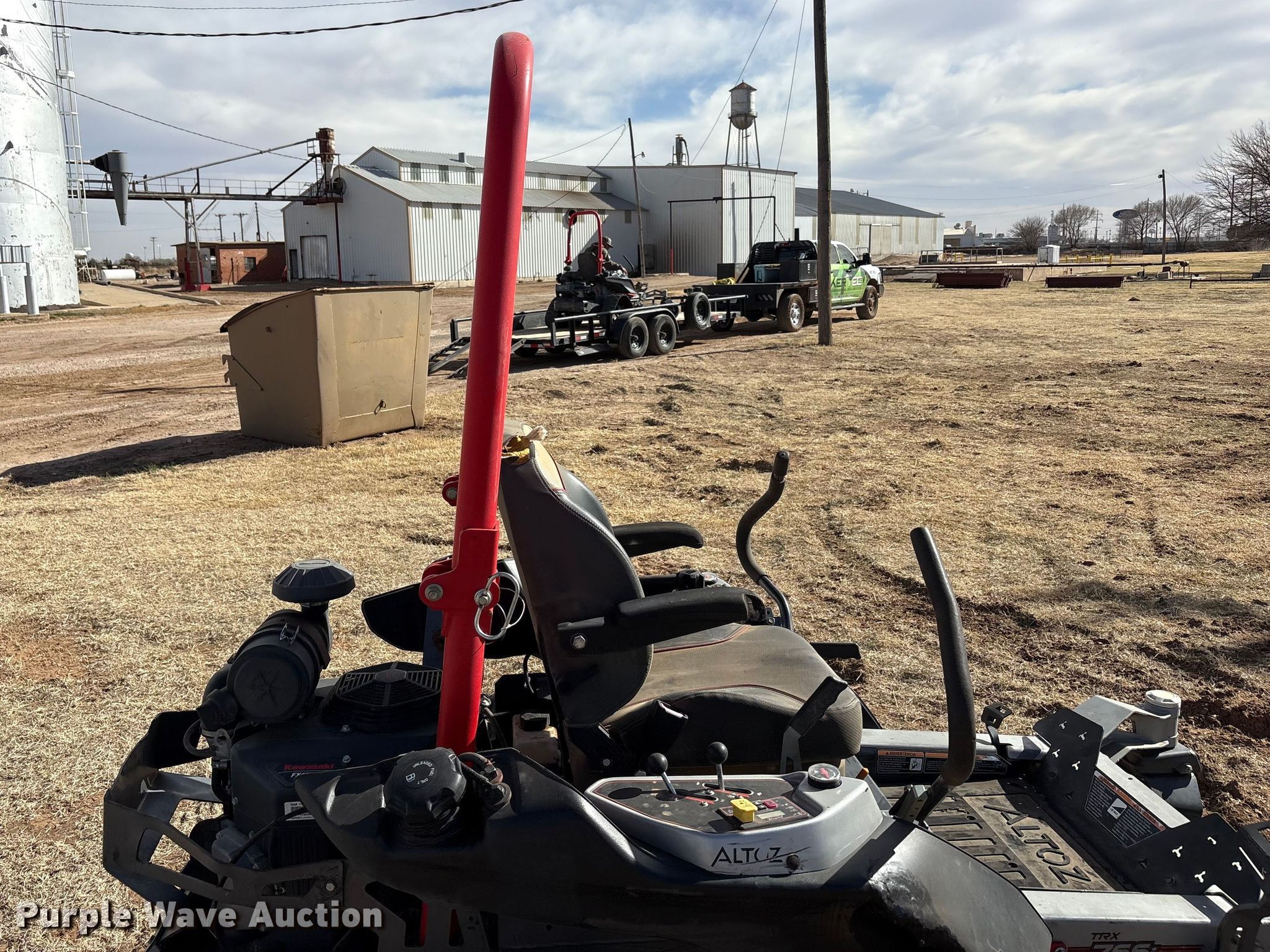 2021 Altoz 1055125 ZTR lawn mower. Hours: 50 on meter, Cutting width: 66", Serial: XT724359. Engine Kawasaki FX1000V, Serial: FXTOOVB35159, Cylinders: 2, Fuel type: Gas. Transmission Hydrostatic. Features Width: 66". Tires Front: 15x6.00-6/4.50, Track width: 11". KerTec LLC. Brownfield, TX 79316
