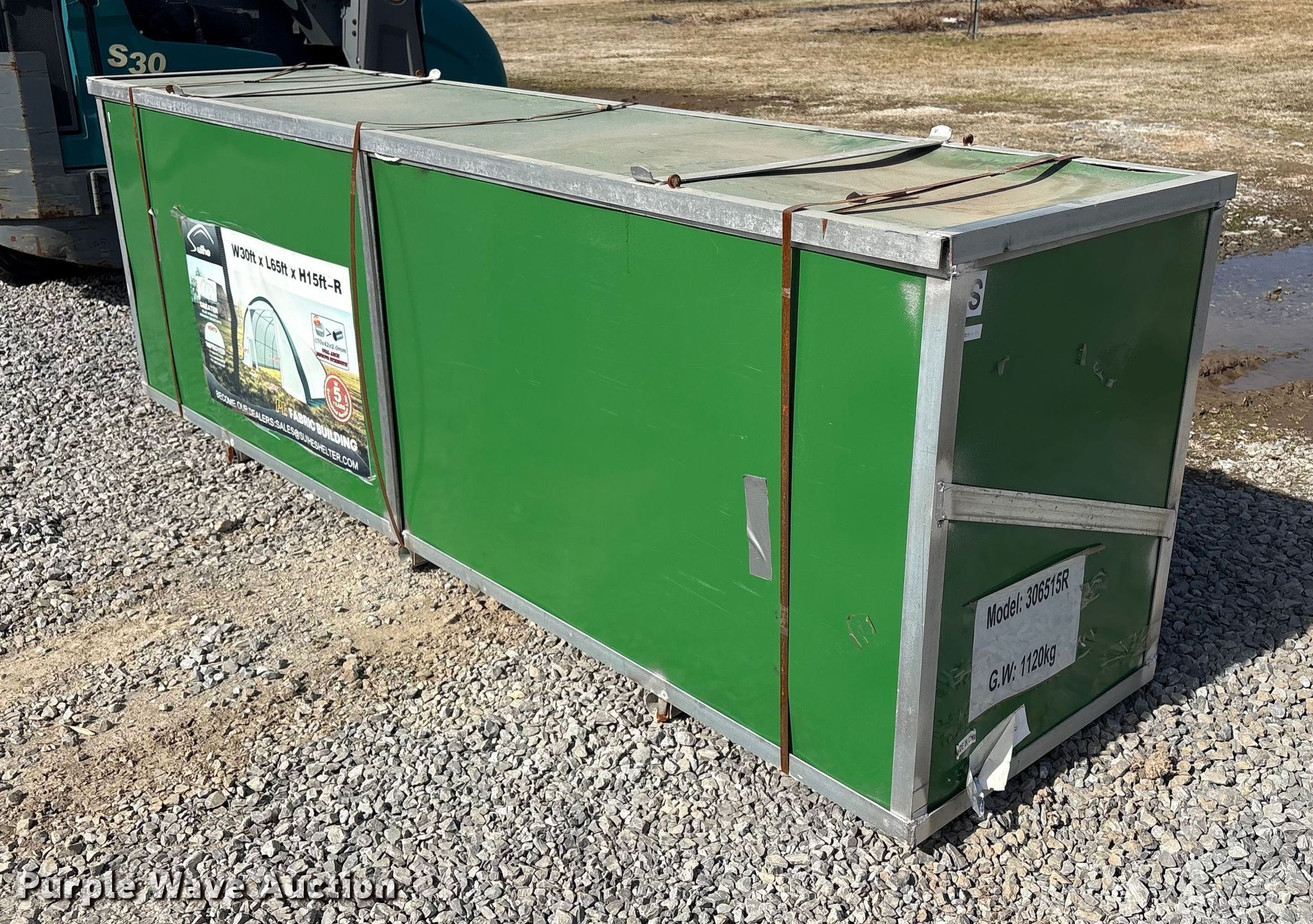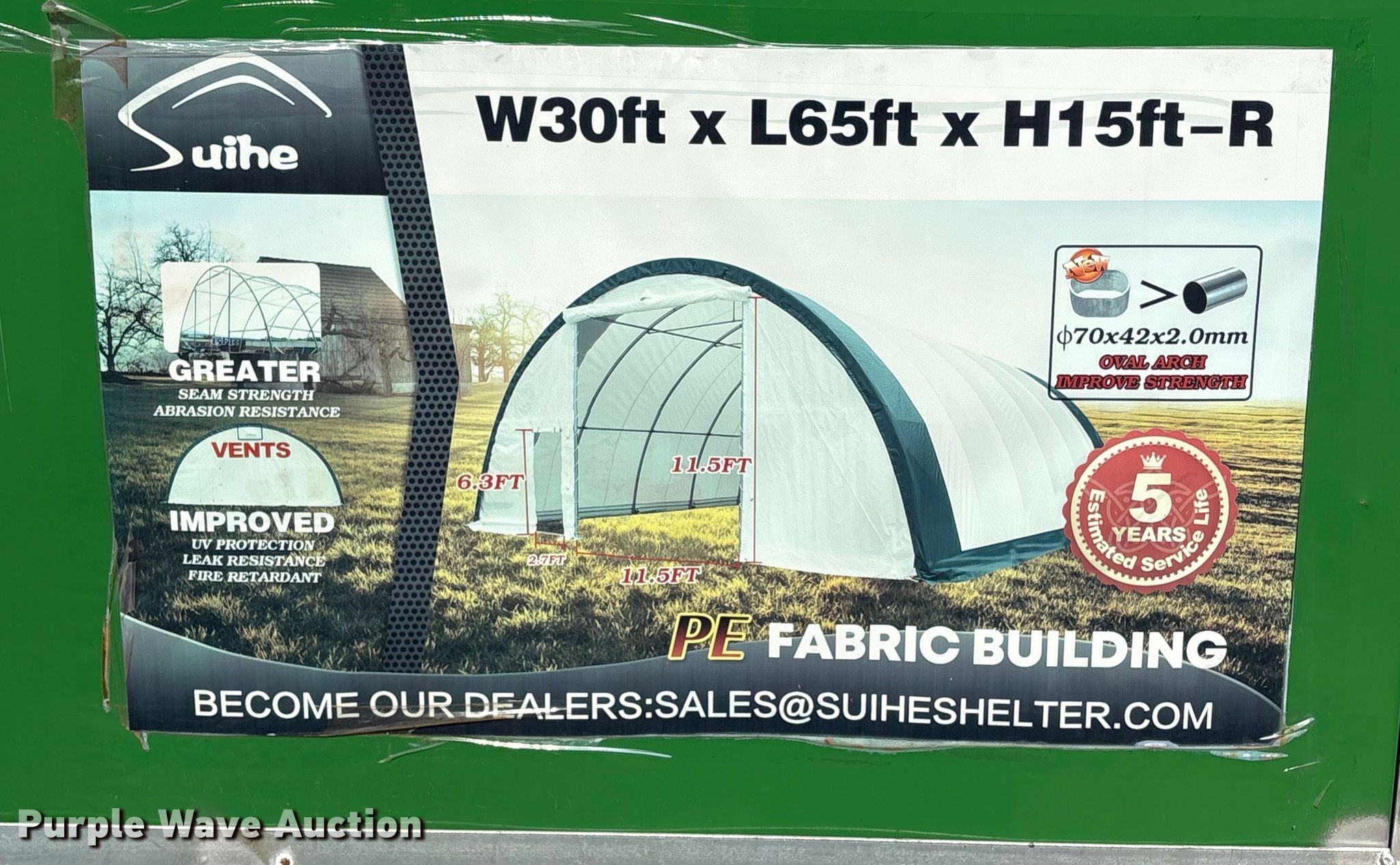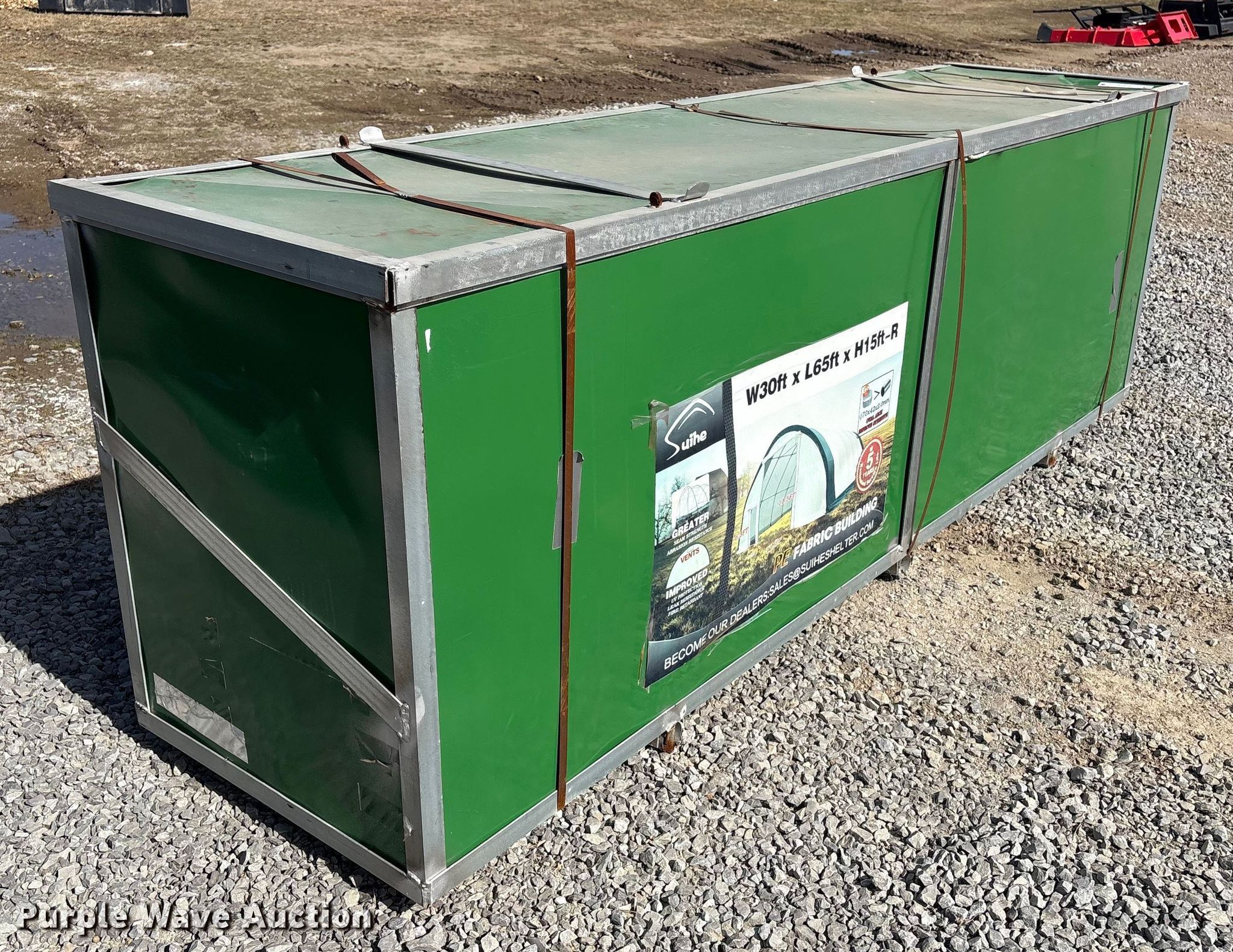 Purple Wave is selling a used Building Materials in Oklahoma. This item is a Suihe 306515R arch storage building with the following: Dimensions, 30' x 65' x 15'