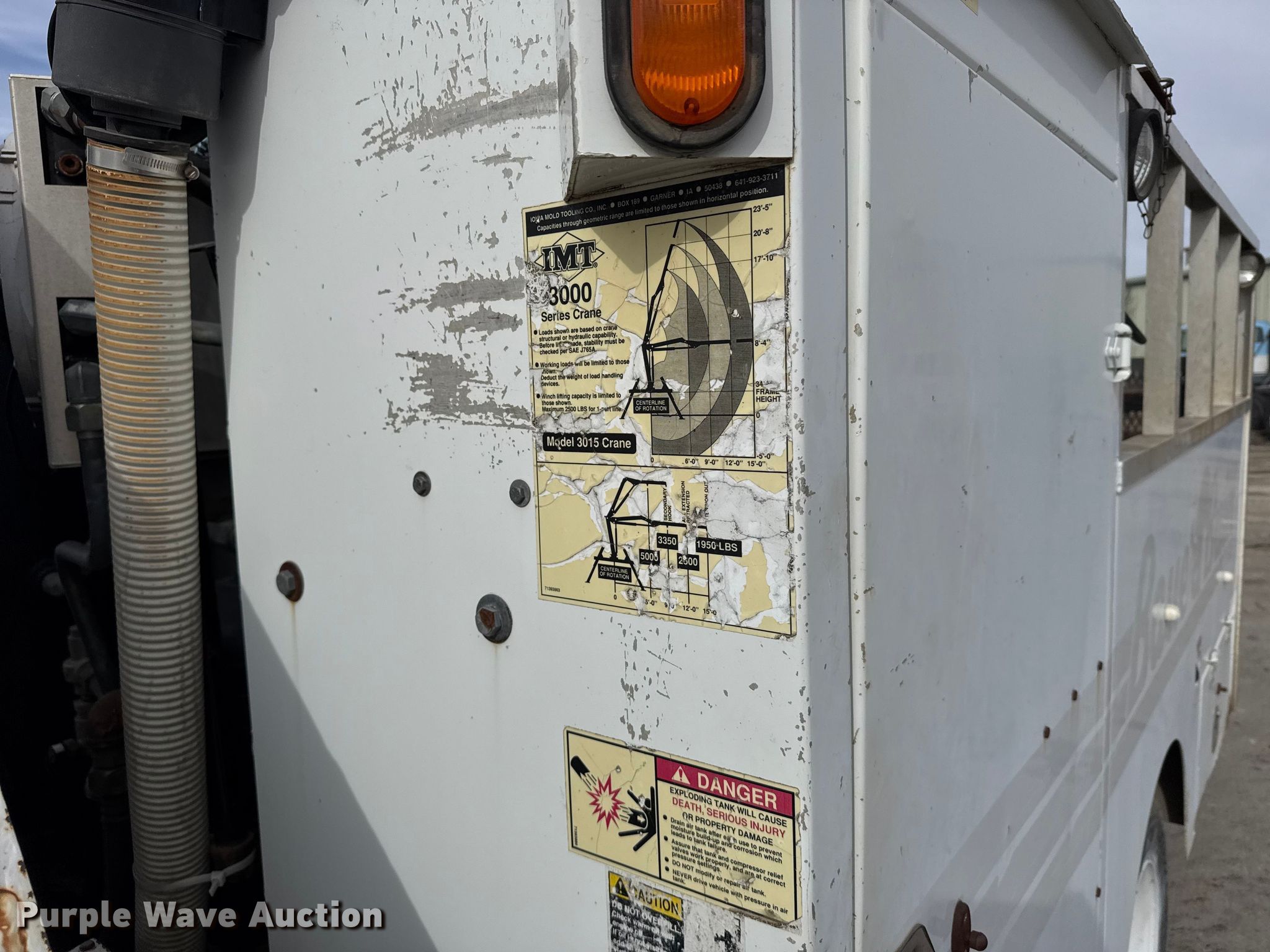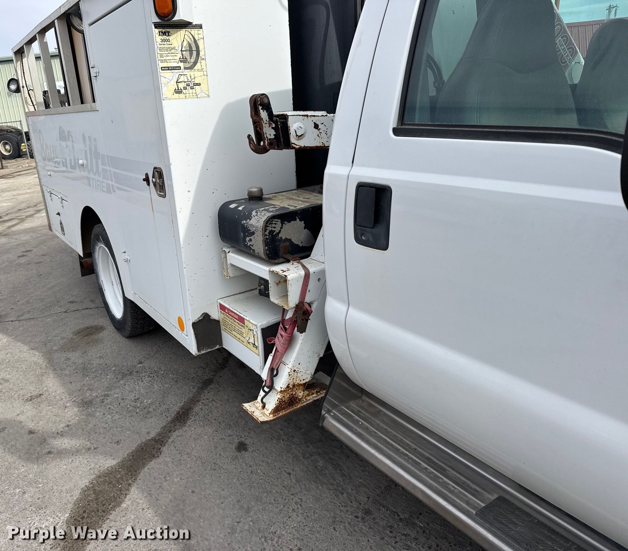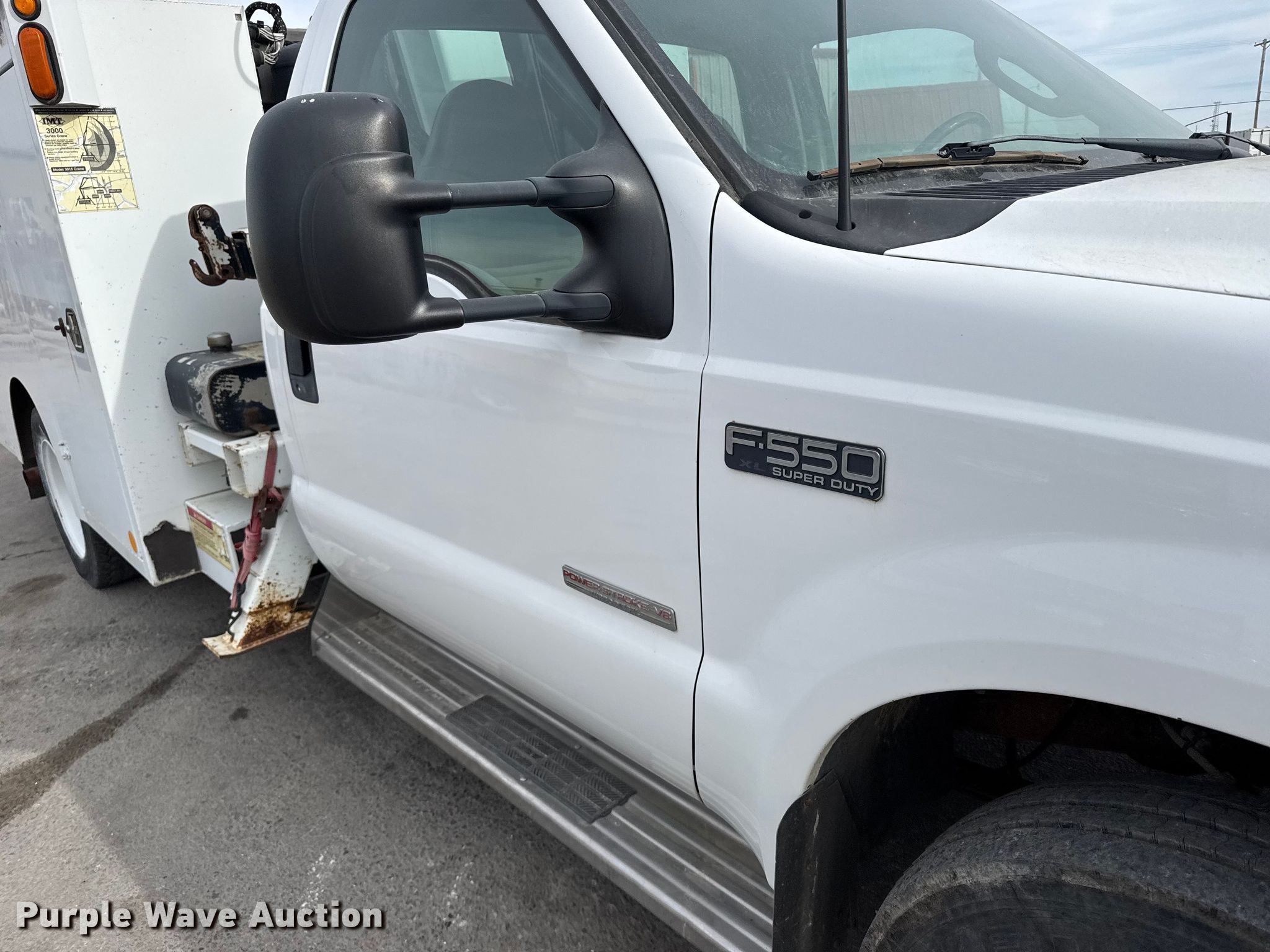 2003 Ford F550 Super Duty XL utility / service truck. Miles: 92,942 on odometer, VIN: 1FDAF56P43ED28609. Engine Navistar, Displacement: 6.0L, Cylinders: 8, Fuel type: Diesel. Transmission Automatic. Chassis Axles: Single, Suspension: Spring, Brakes: Hydraulic, PTO, GVWR: 19,000 lbs. Interior AC, Heat, Cruise control. Features Bed Utility bed, IMT Predator, Width: 96", Air compressor, Crane IMT 3015, Maximum boom length: 23' Maximum lift capacity: 5,000 lbs, End gate lift Capacity: 1,600 lbs. Tires Size: 245/70R19.5. Notes Non-operational PTO Non-operational air compressor, Non-operational crane, Non-operational calcium chloride fill-system. Kansas title. Title distribution may be delayed up to 30 days from verification of funds. Leiker Farms & Trucking. Hays, KS 67601