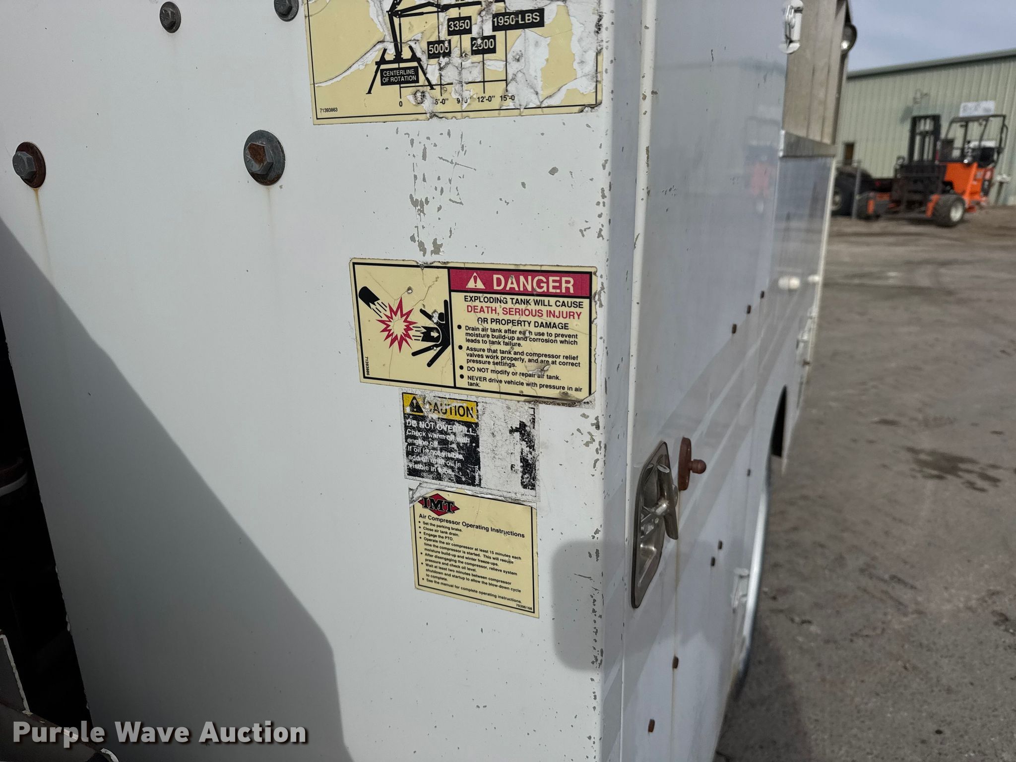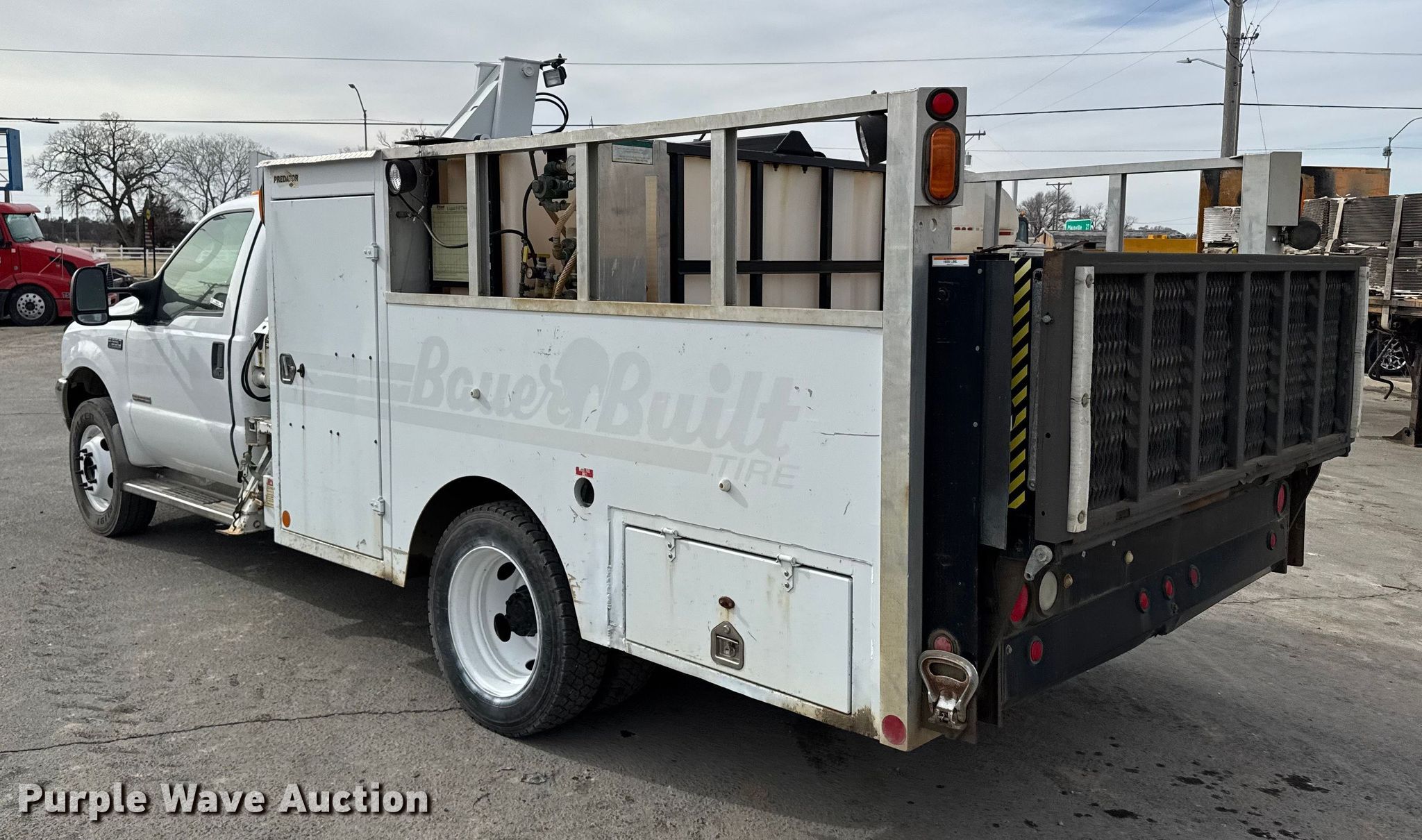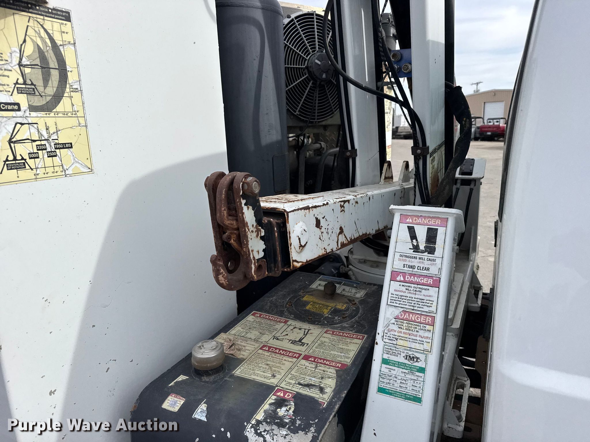 2003 Ford F550 Super Duty XL utility / service truck. Miles: 92,942 on odometer, VIN: 1FDAF56P43ED28609. Engine Navistar, Displacement: 6.0L, Cylinders: 8, Fuel type: Diesel. Transmission Automatic. Chassis Axles: Single, Suspension: Spring, Brakes: Hydraulic, PTO, GVWR: 19,000 lbs. Interior AC, Heat, Cruise control. Features Bed Utility bed, IMT Predator, Width: 96", Air compressor, Crane IMT 3015, Maximum boom length: 23' Maximum lift capacity: 5,000 lbs, End gate lift Capacity: 1,600 lbs. Tires Size: 245/70R19.5. Notes Non-operational PTO Non-operational air compressor, Non-operational crane, Non-operational calcium chloride fill-system. Kansas title. Title distribution may be delayed up to 30 days from verification of funds. Leiker Farms & Trucking. Hays, KS 67601
