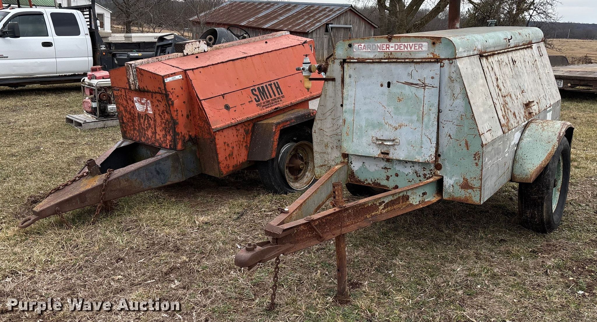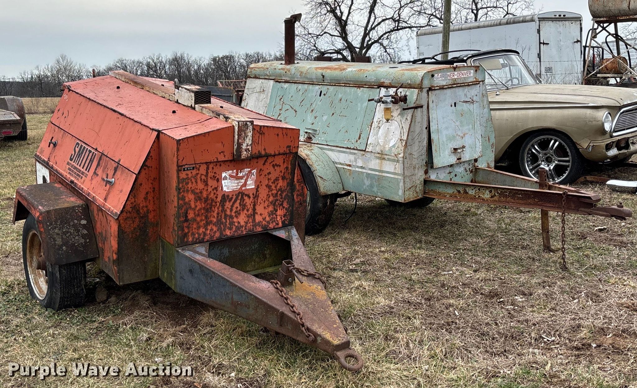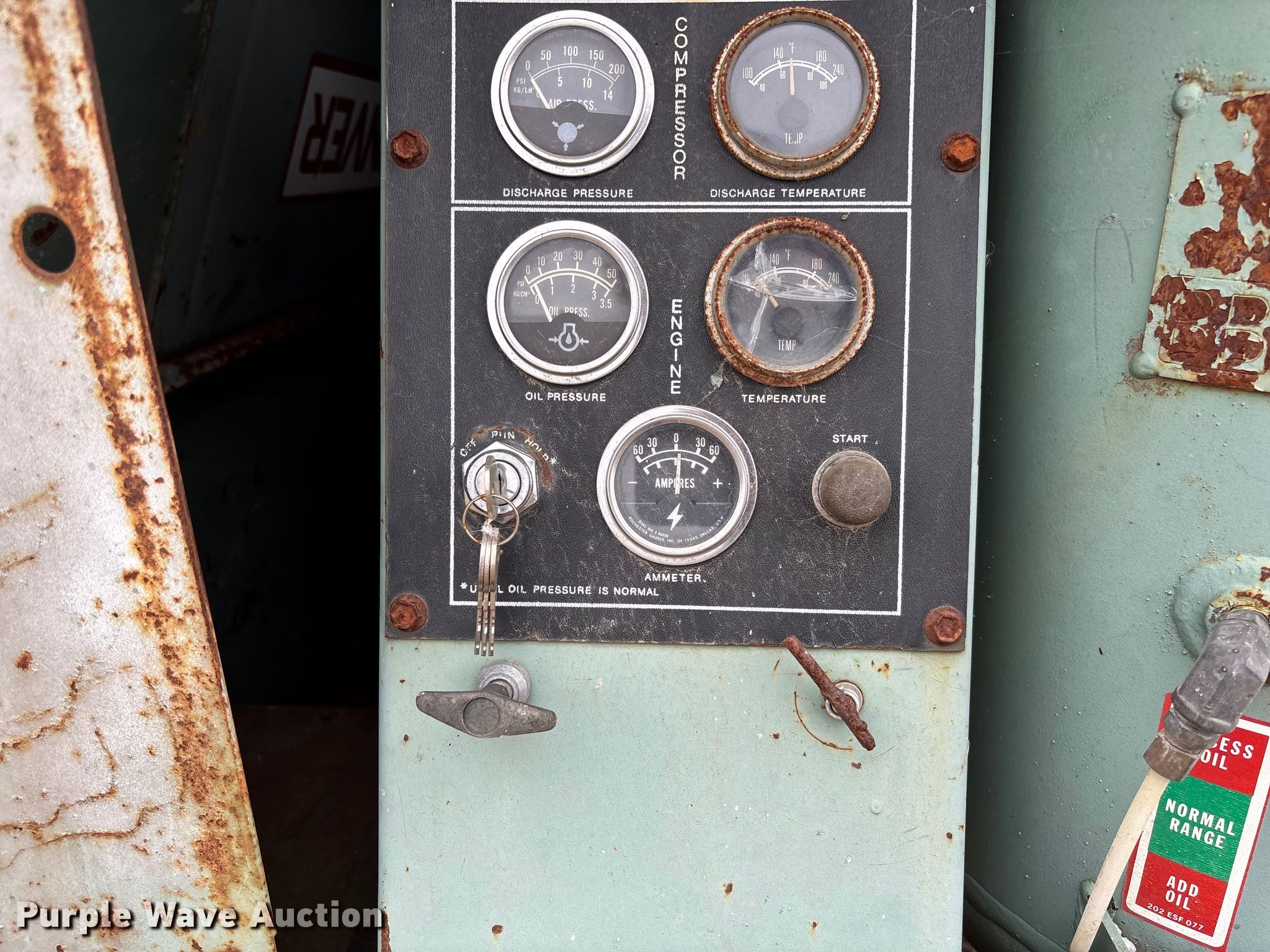 (2) air compressors. Hours: 4,775 on meter, Hours: 1,465 on meter. Engine Cylinders: 4, Fuel type: Gas. Features Air compressor CFM: 85. Trailer Hitch: Pintle, Ball hitch size: 2", Hitch: Pintle, Suspension: Spring, Axles: Single, Tire size: 215/75B15. Notes Non-operational units. This is worksite support equipment and will not come with a title. Transfer of ownership documentation will be a bill of sale. Florence, MO 63363