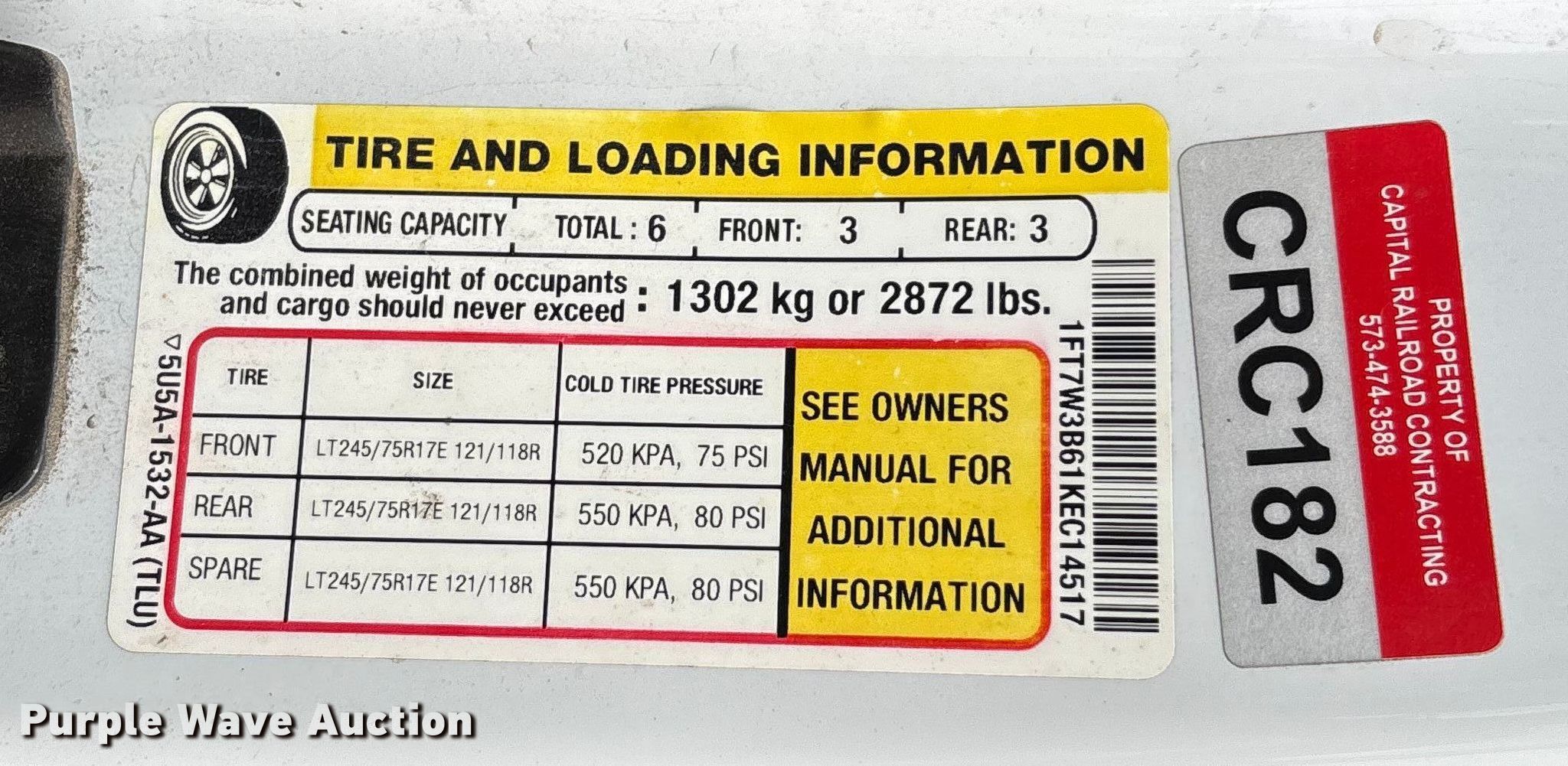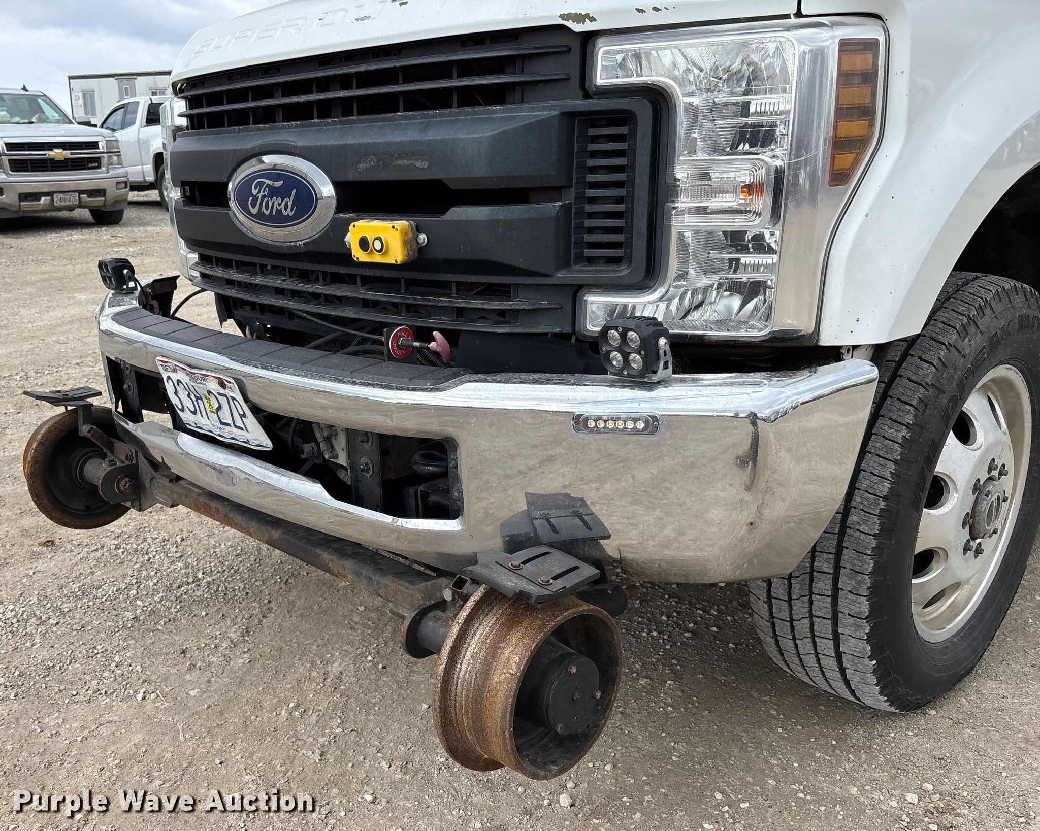 2019 Ford F350 Crew Cab pickup truck. Miles: 188,530 on odometer, Hours: 9,944 on meter, VIN: 1FT7W3B61KEC14517. Engine Displacement: 6.2L, Cylinders: 8, Fuel type: Gas. Transmission Automatic, Four wheel drive. Interior AC, Heat, Heated mirrors, Power windows, Power locks, Cruise control, Backup camera, Auxiliary controls. Features Hi-Rail system, Bed Length: 8'. Tires Size: 275/65R20. Notes Windshield chipped or cracked, Exhaust system issues, noise. Missouri title. Title distribution may be delayed up to 14 days from verification of funds. Capital Railroad Contracting Inc... Columbia, MO 65201