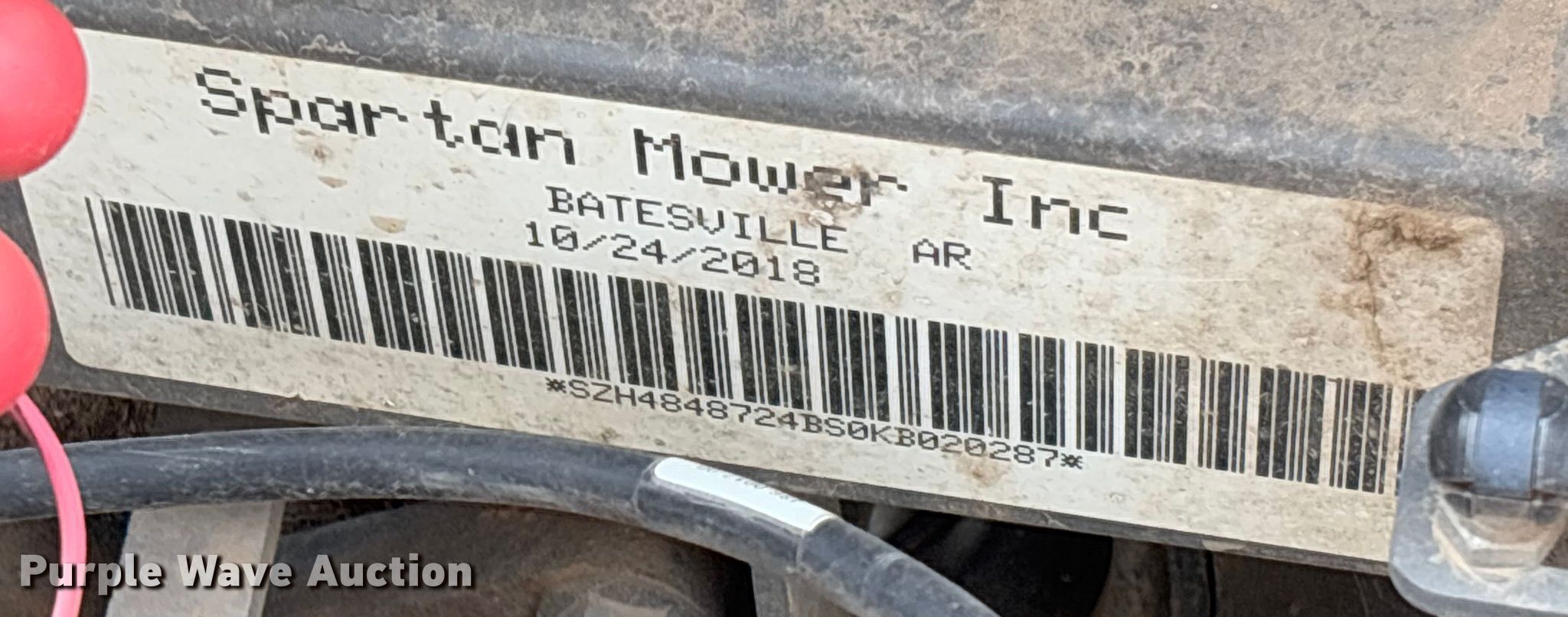 Purple Wave is selling a used Lawn Mower in Arkansas. This item is a 2018 Spartan RZ-HD ZTR lawn mower with the following: Hours: 38 on meter, Cutting width: 48", Serial: SZH4848724BS0KB020287