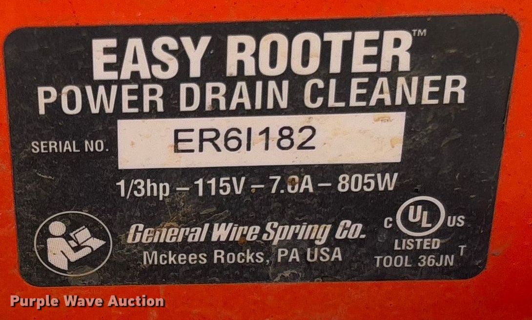 Purple Wave is selling a used Tools in Arkansas. This item is a Easy Rooter drain snake with the following: Serial: ER6I182