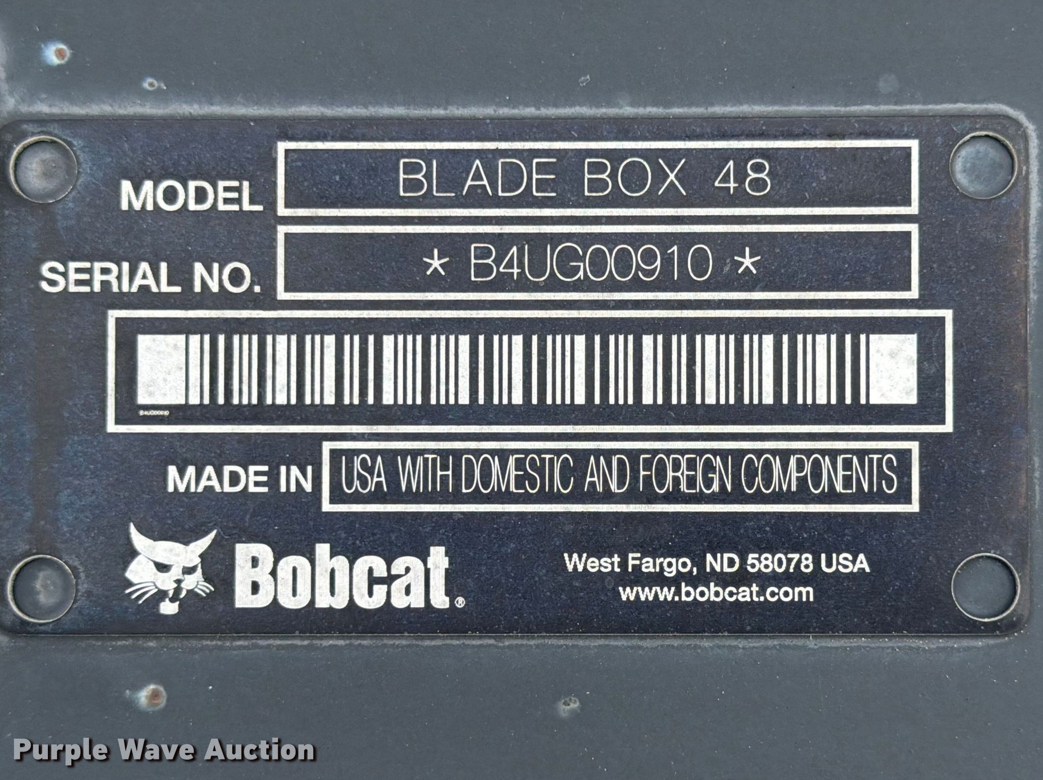 Bobcat Blade Box 48 Box blade. Serial: B4UG00910, Unit #: 1286095, 48"W blade, Shanks: 4, Hitch: Three point. Bobcat of Houston. Rosenberg, TX 77471