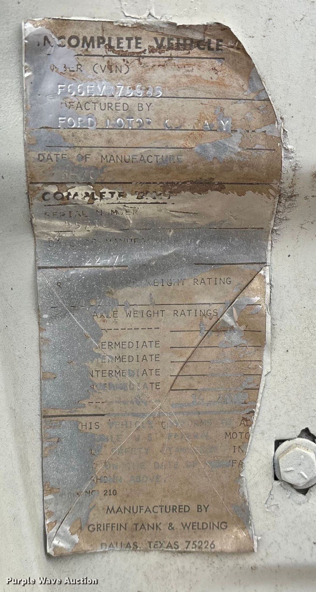 1976 Ford F600 tow truck. Miles: Unknown, VIN: F66EYB75685. Engine Cylinders: 8, Fuel type: Gas. Transmission Manual, Speed: 5. Chassis Four wheel drive, Axles: Single, Suspension: Spring, Brakes: Hydraulic, GVWR: 21,700 lbs. Interior Heat. Features Bed Wrecker bed, Length: 9' 3", Width: 86", Winch Dual.. Tires Size: 10R22.5. Notes Parts missing, Dash cluster missing, Driveshaft disconnected, Hail damage, Non-operational unit Unit must be towed or hauled. Missouri title. Mileage has not been verified. Exempt will be written in the odometer disclosure on the title. Title distribution may be delayed up to 30 days from verification of funds. Springfield Telecom Company, LLC.. Republic, MO 65738