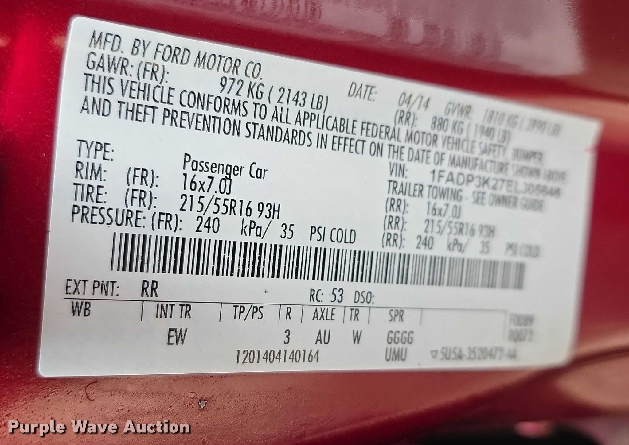 2014 Ford Focus SE. Miles: 47,837 on odometer, VIN: 1FADP3K27EL305648. Engine Displacement: 2.0L, Cylinders: 4, Fuel type: Gas. Transmission Automatic. Interior AC, Heat, Seat: Heated, Heated mirrors, Power windows, Power locks, Cruise control. Tires Size: 215/55R16. Kansas title. Title distribution may be delayed up to 14 days from verification of funds. Clay Center, KS 67432