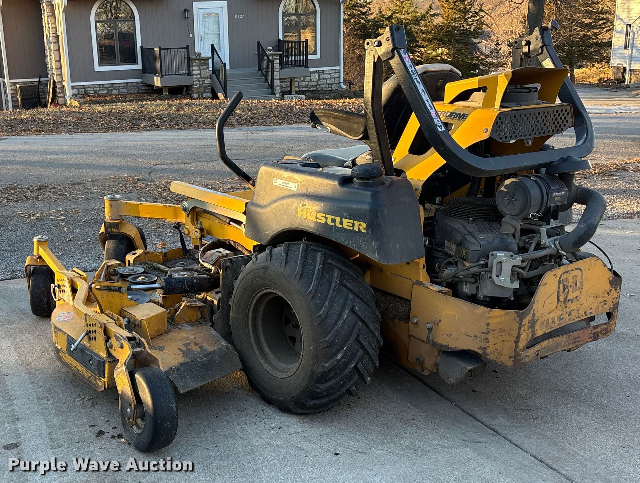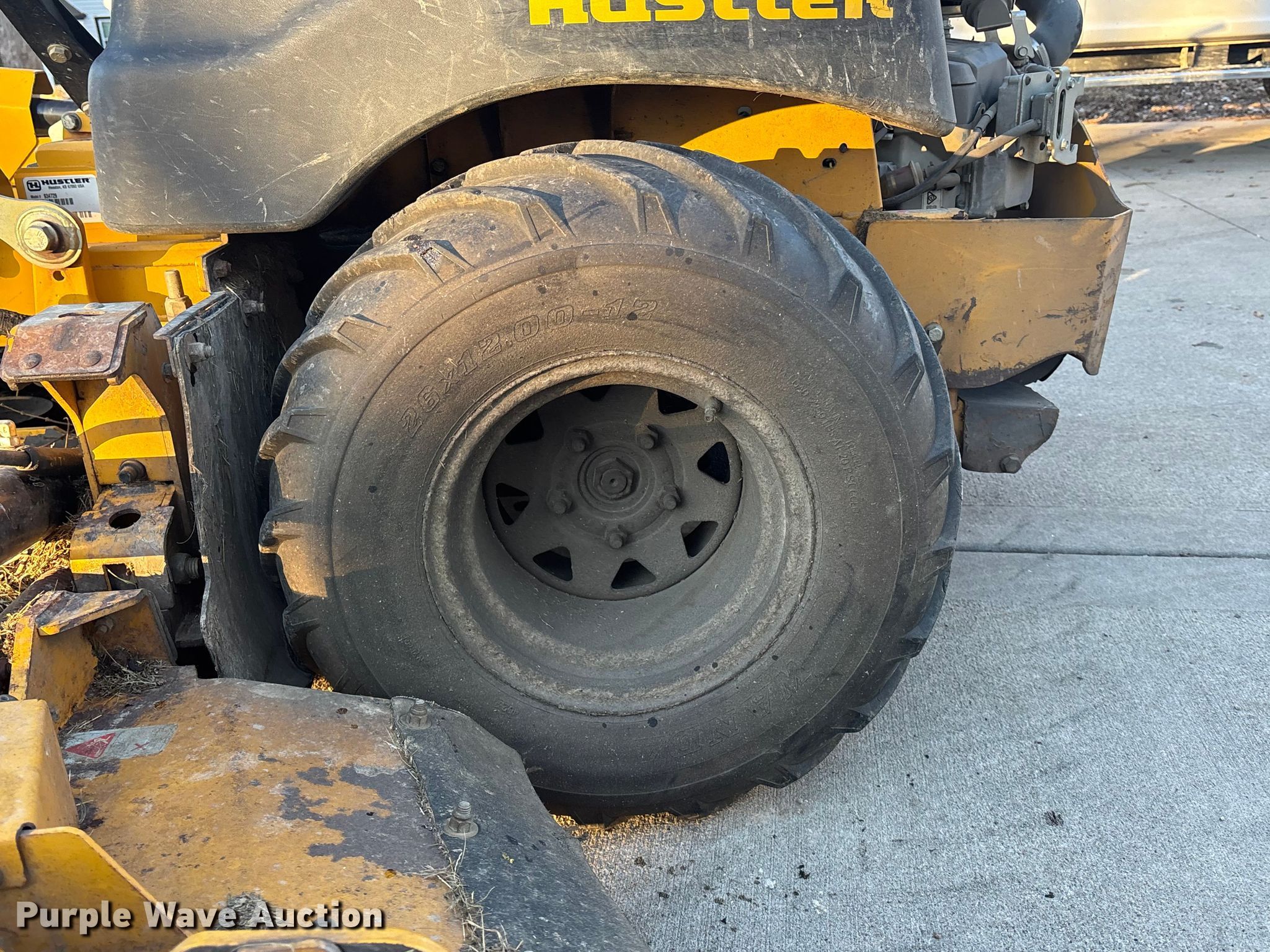 Hustler Super 104 ZTR lawn mower. Cutting width: 104", Serial: 16049419. Engine Briggs & Stratton, Cylinders: 2, Fuel type: Gas. Transmission Hydrostatic. Operators station OROPS. Features Mower deck Width: 104", Hustler, Hydraulic fold decks, Hydraulic front deck lift. Tires Front: 15x6-6, Rear: 26x12-12. Notes Jump start required during on-site data collection, Non-operational hour meter, Left drive hydraulic issues. Owen LLC. Sugar Creek, MO 64054